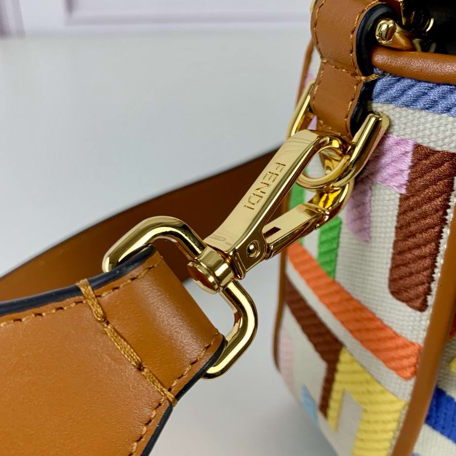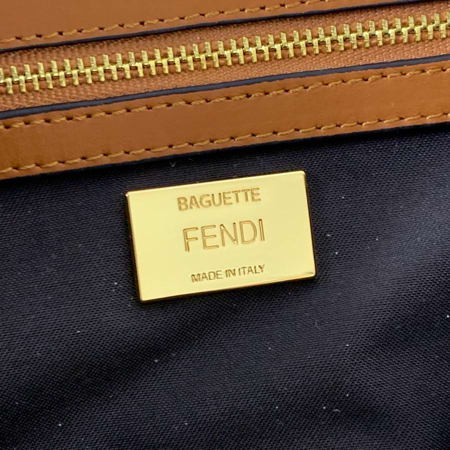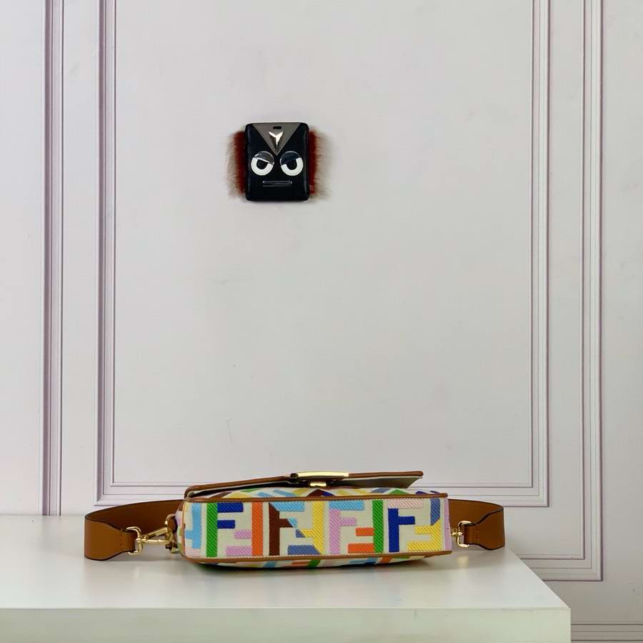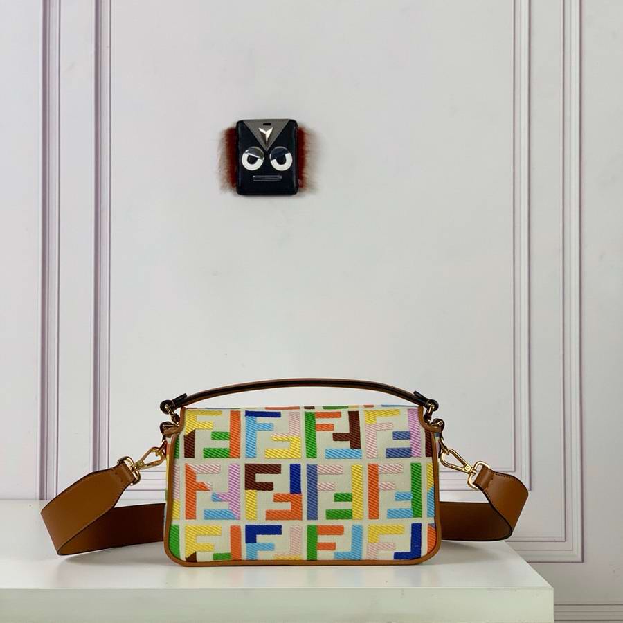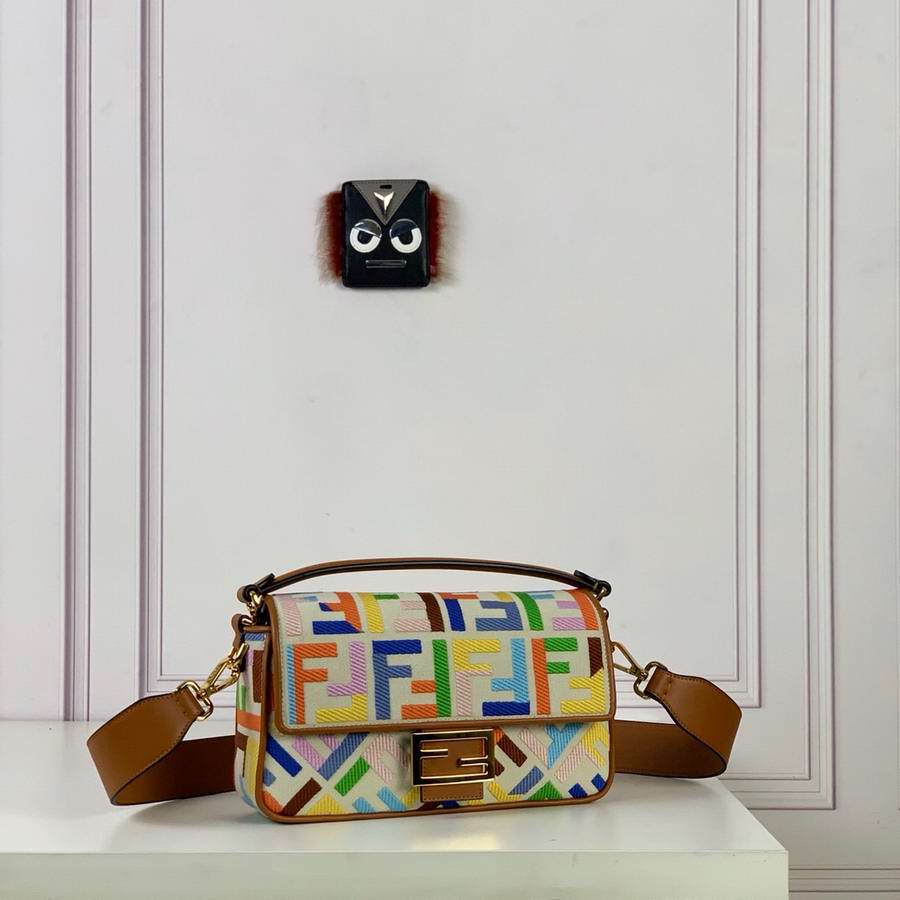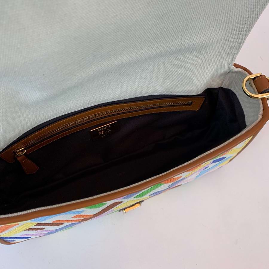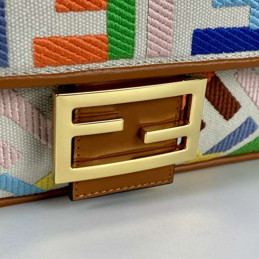 Iconic medium Baguette bag, made of beige canvas with an FF motif embroidered in multicolor yarn. Decorated with an FF clasp. Featuring a front flap, magnetic clasp, brown leather details, a lined internal compartment with a zip pocket and gold-finish metalware. The bag can be carried by hand, or worn either on the shoulder or cross-body thanks to the handle and shoulder strap, both detachable.