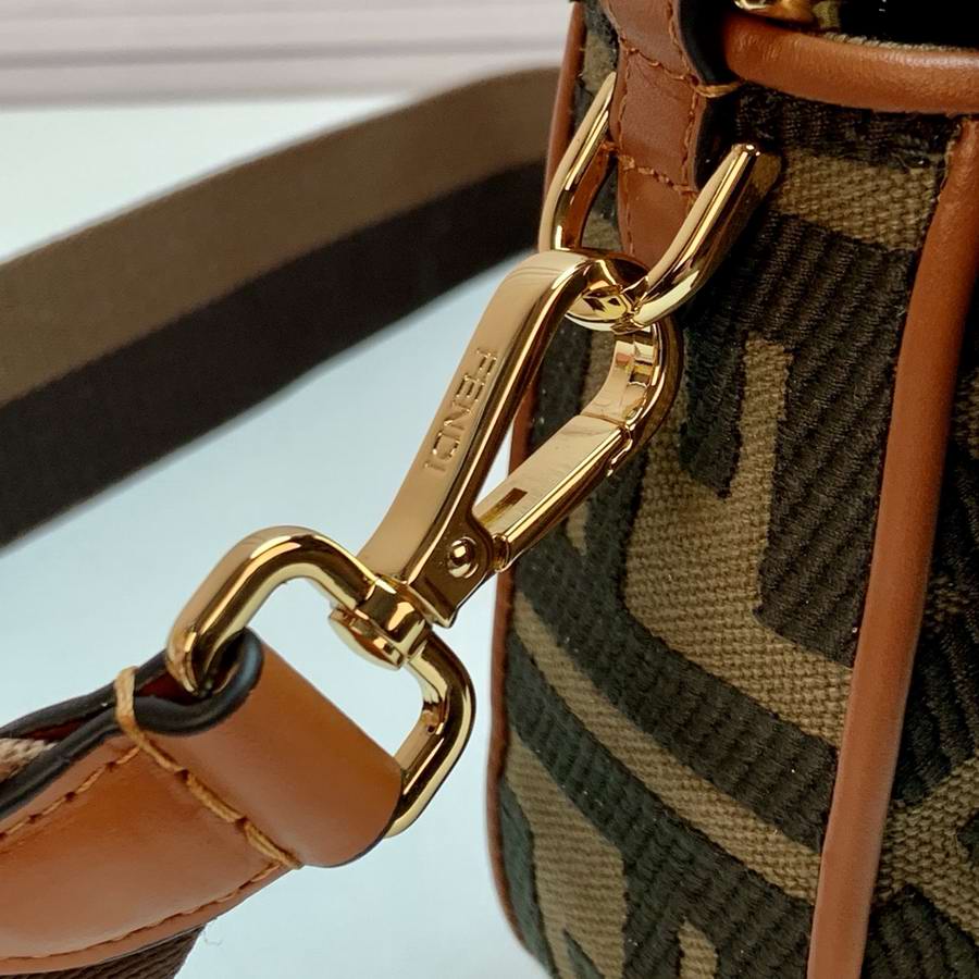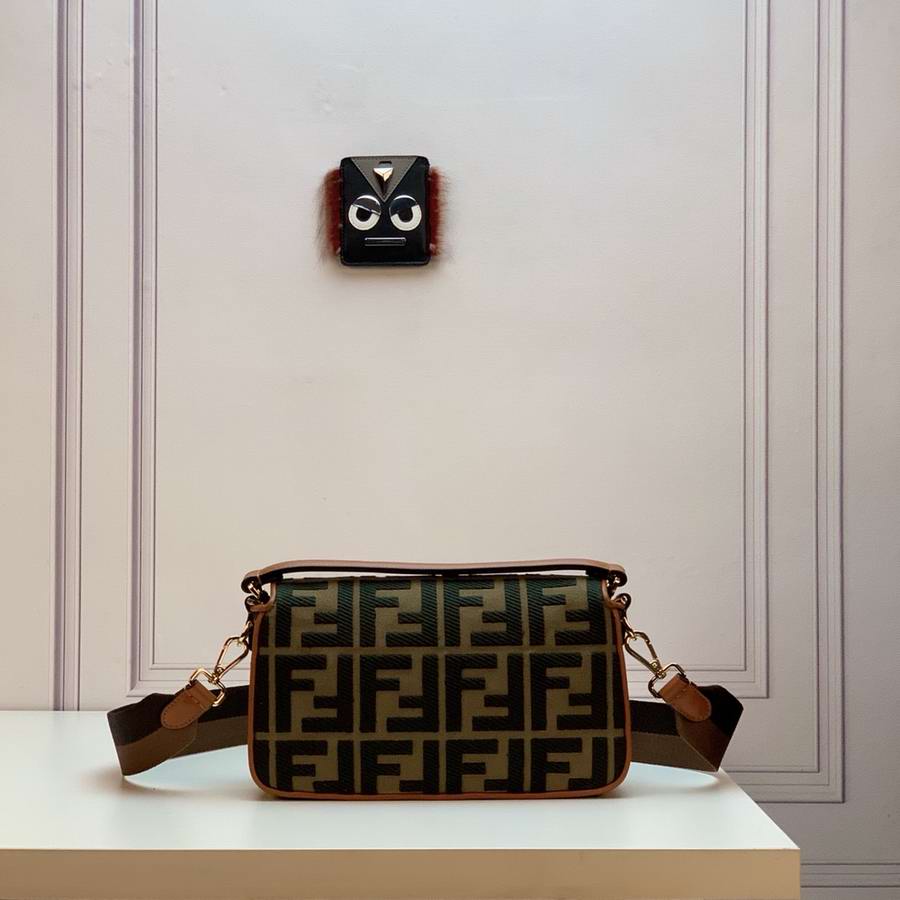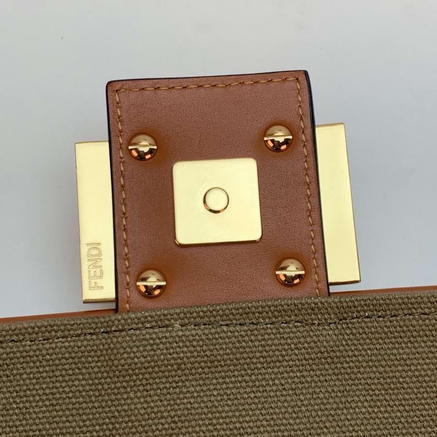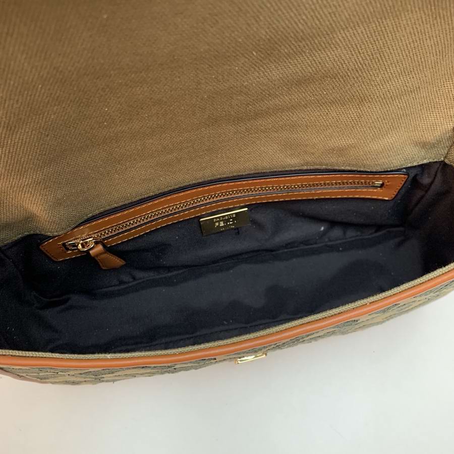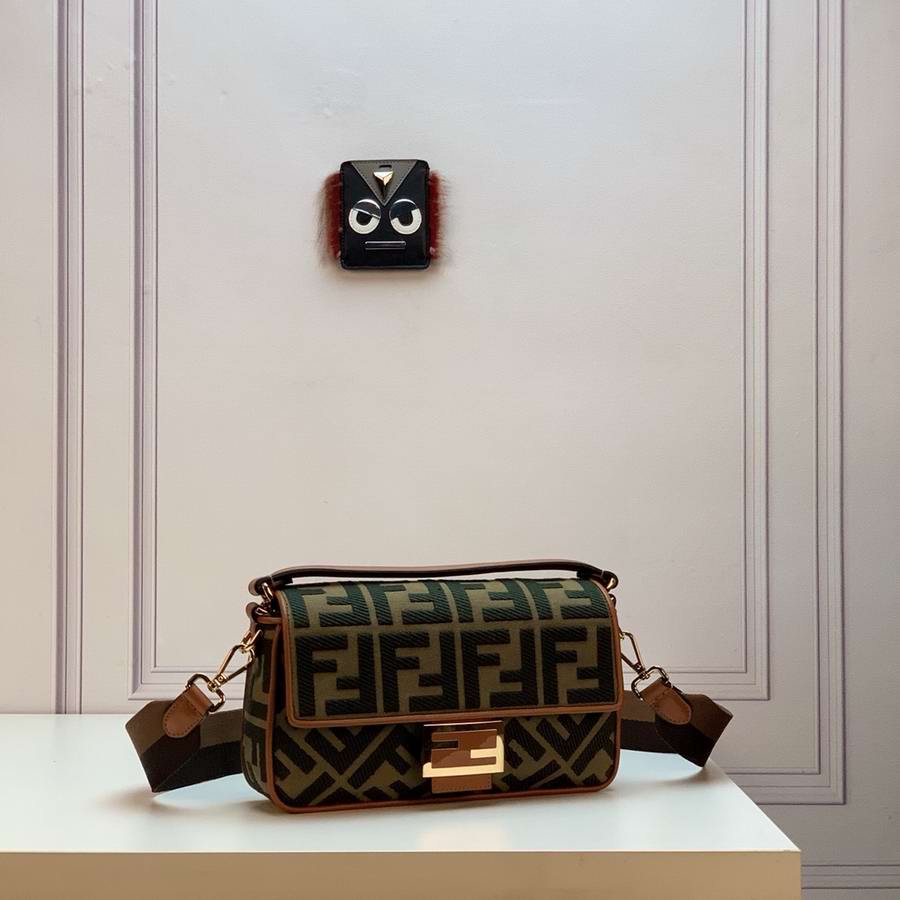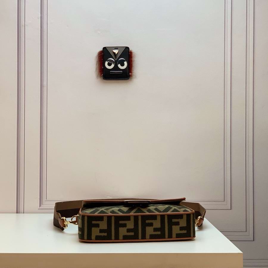Iconic medium Baguette bag, made of beige canvas with an FF motif embroidered in multicolor yarn. Decorated with an FF clasp.
