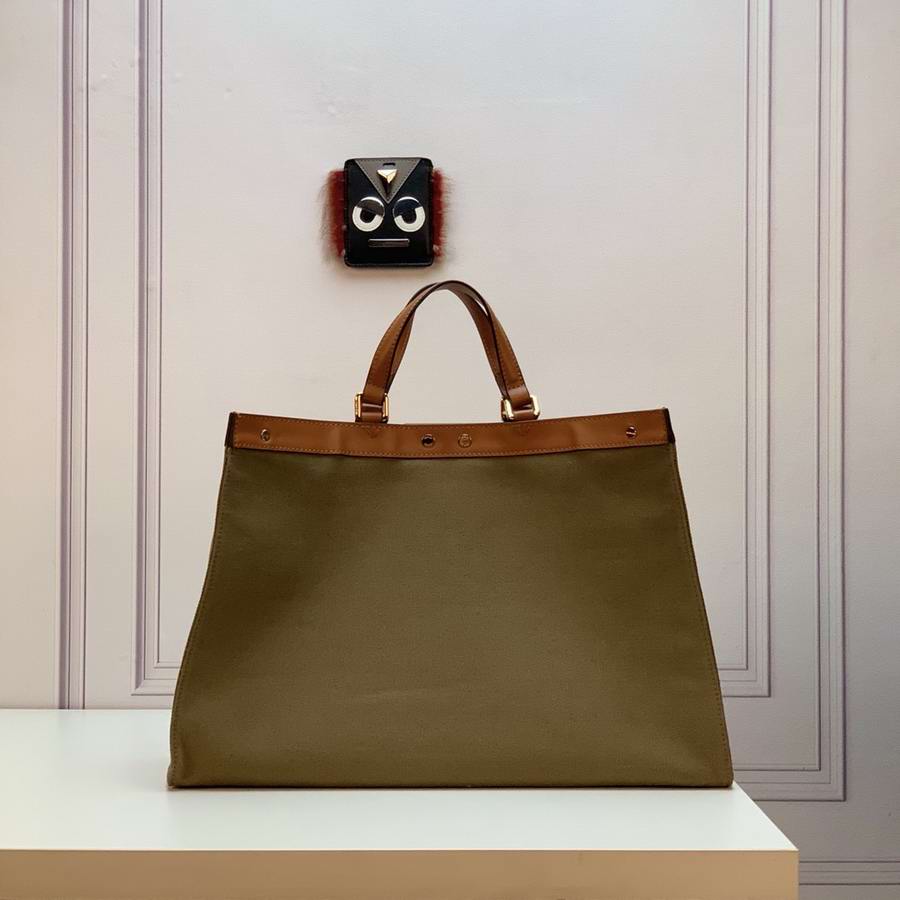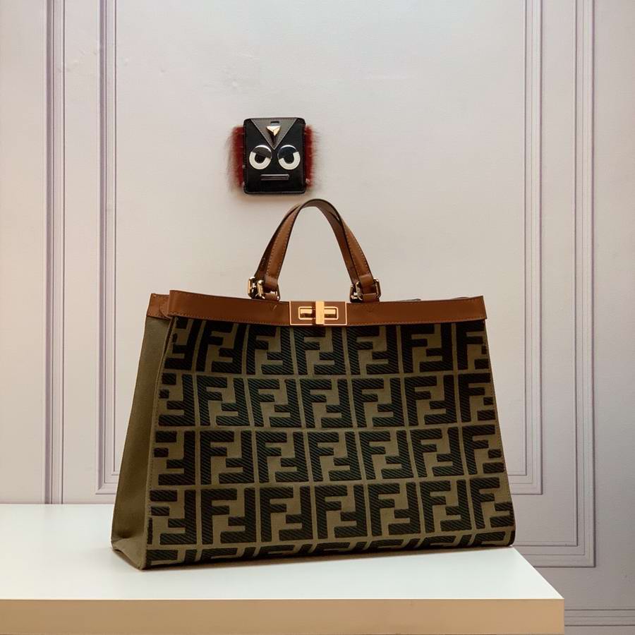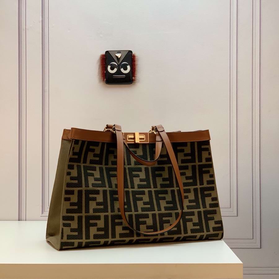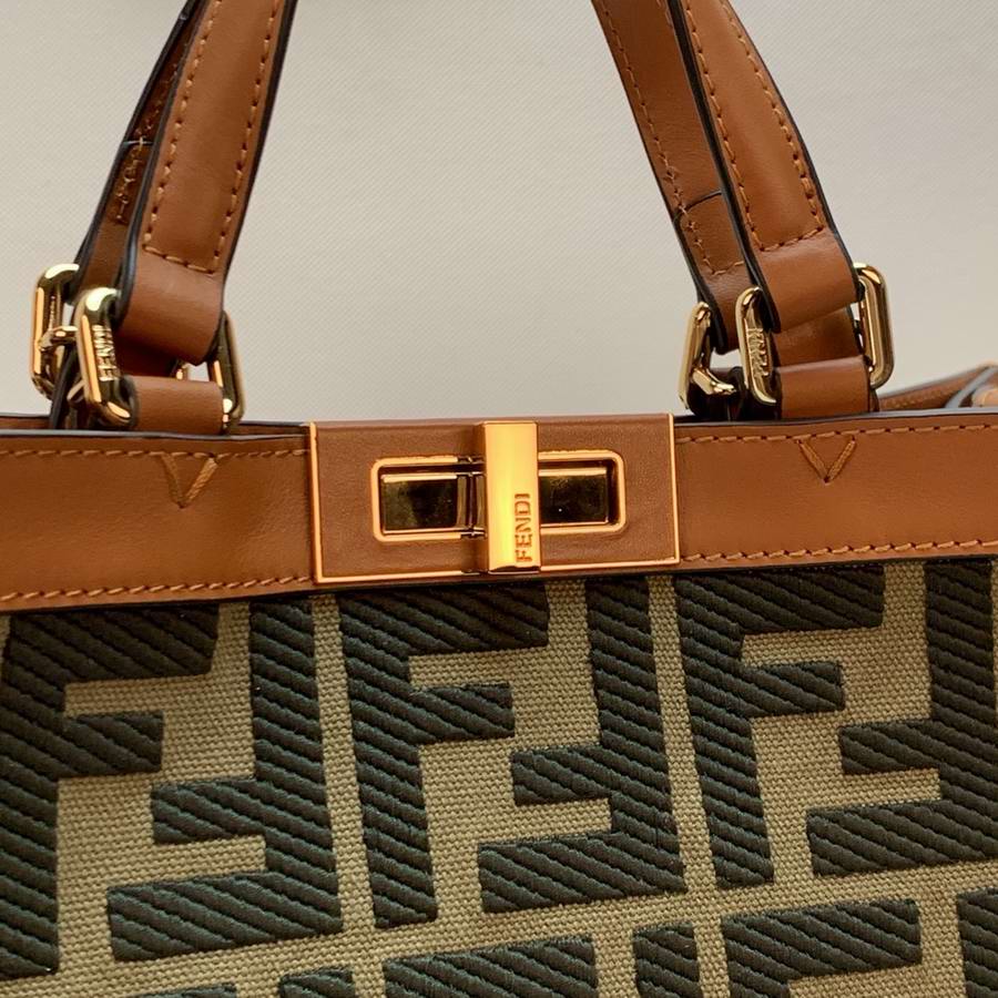 Medium Peekaboo X-Tote bag made of natural straw with a tone-on-tone embossed embroidered FF motif. Trimmed in brown leather and decorated with the classic twist lock. Unlined interior featuring a pocket with press-stud fastening and gold-finish metalware. Completed by two short handles for carrying by hand and two long handles for wearing over the shoulder.