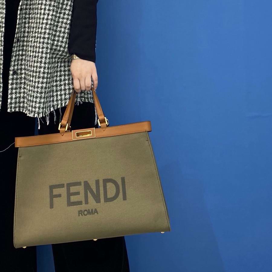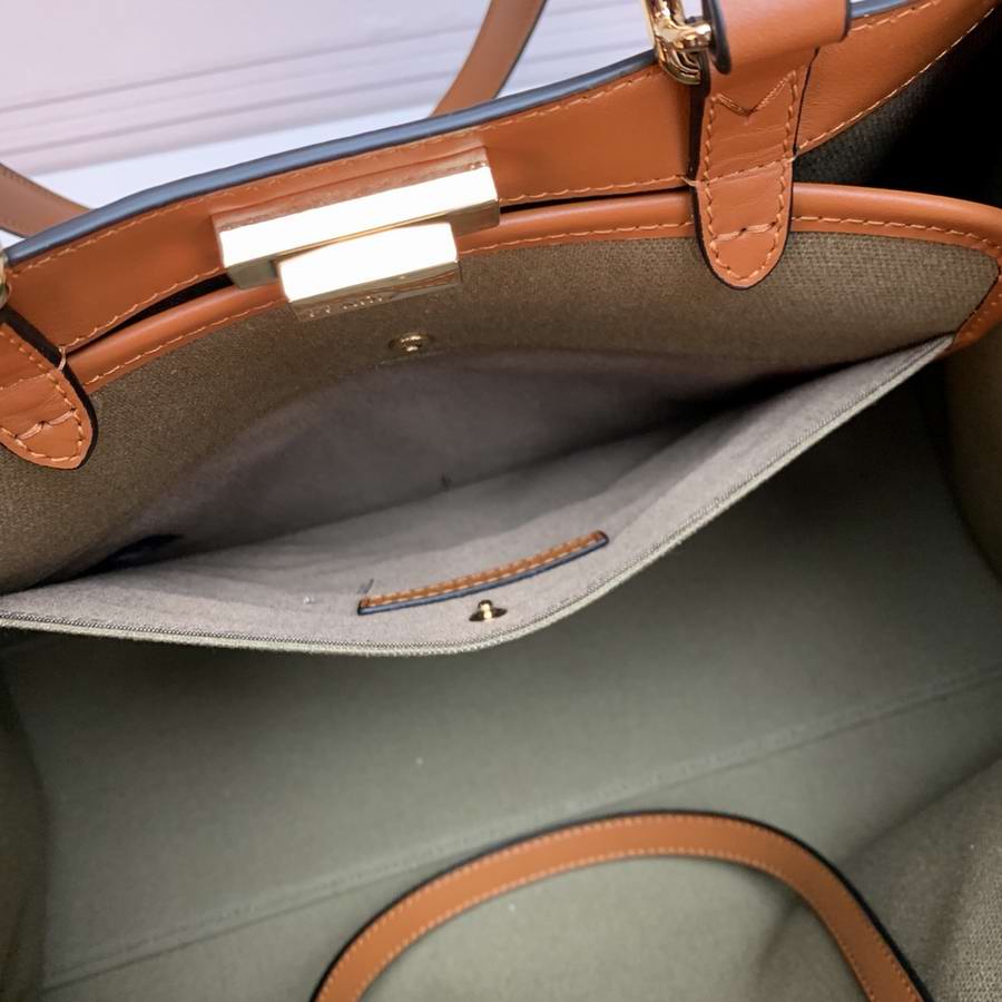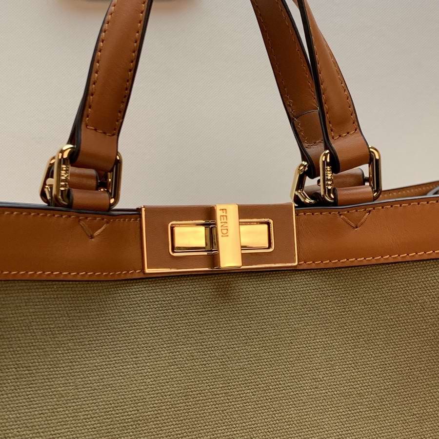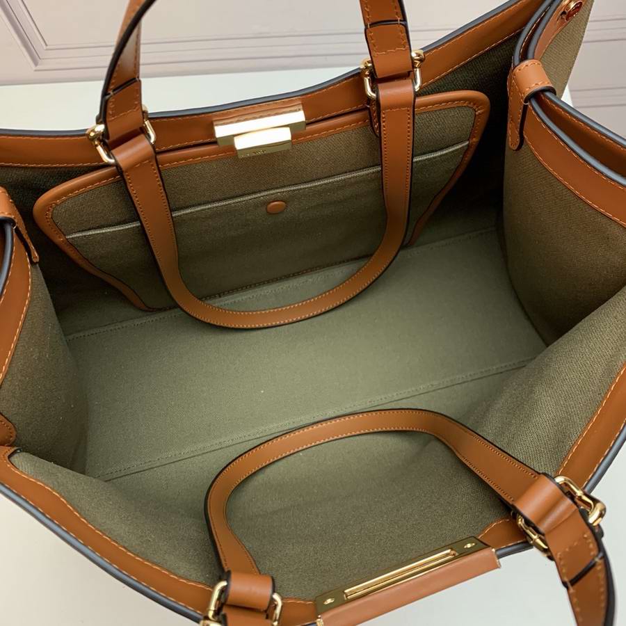 Medium Peekaboo X-Tote bag made of natural straw with a tone-on-tone embossed embroidered FF motif. Trimmed in brown leather and decorated with the classic twist lock. Unlined interior featuring a pocket with press-stud fastening and gold-finish metalware. Completed by two short handles for carrying by hand and two long handles for wearing over the shoulder.