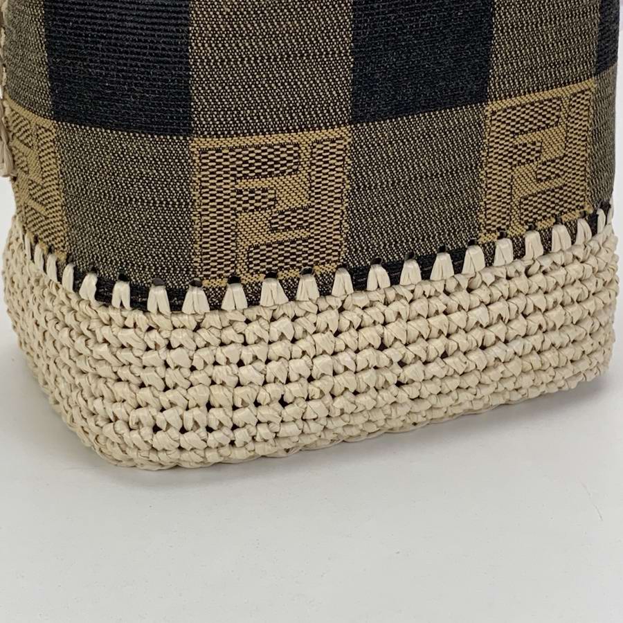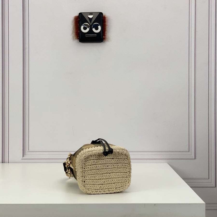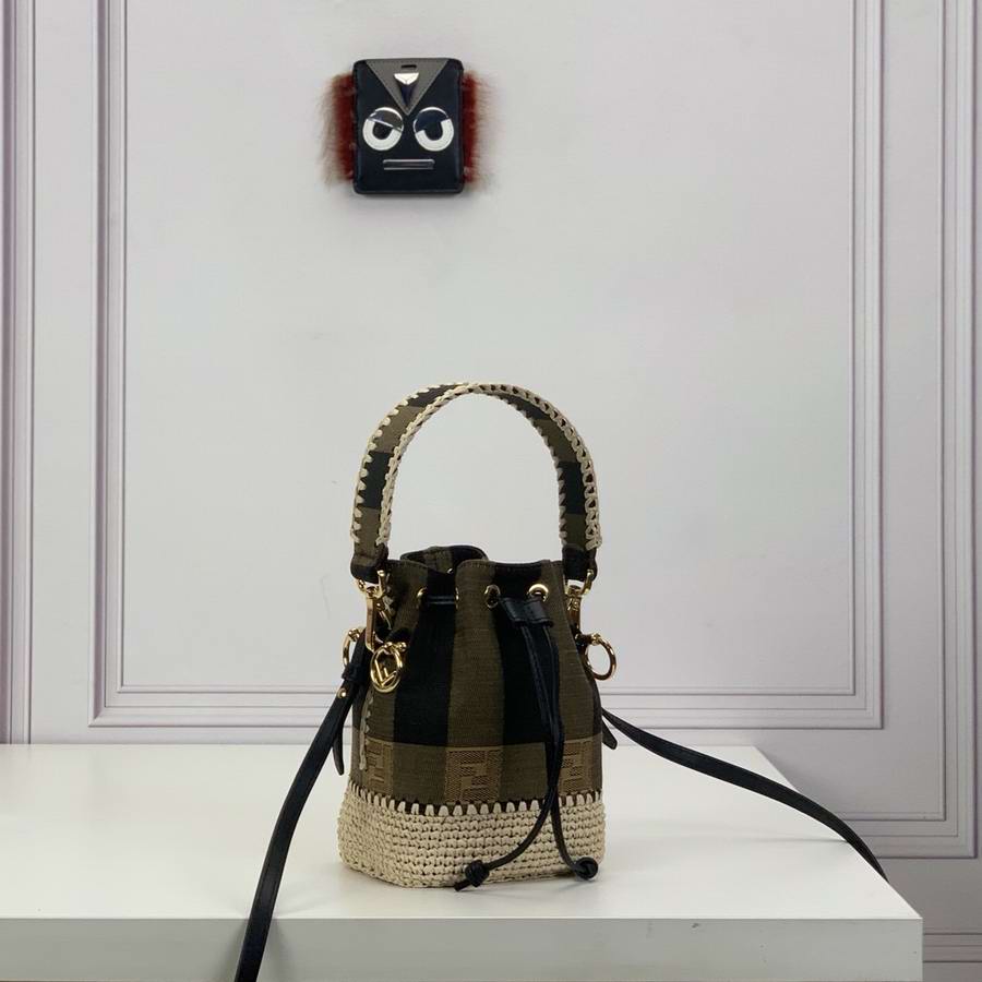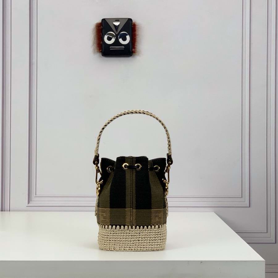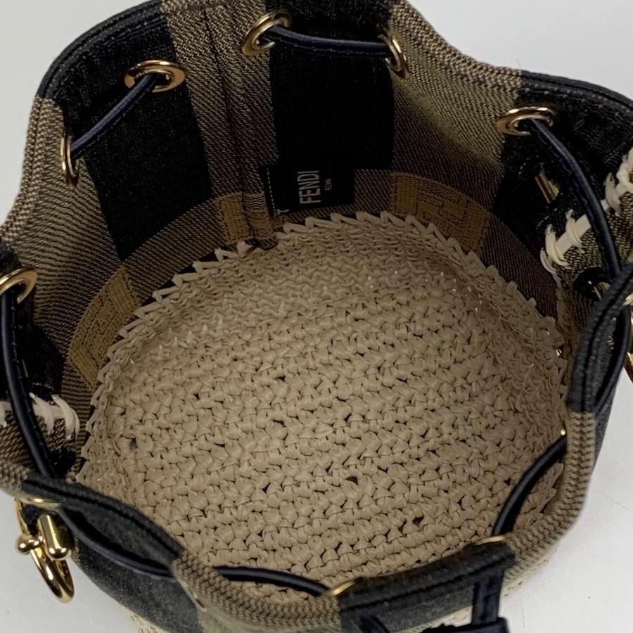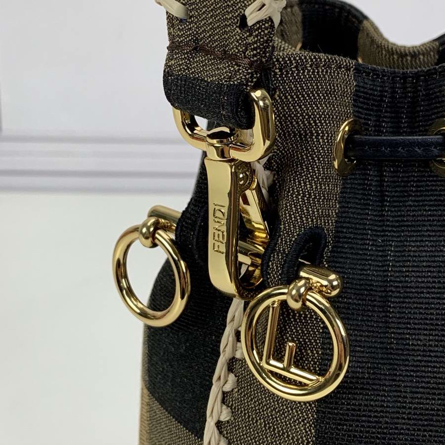 Small Mon Tresor bucket bag with drawstring fastening and metal decorations in the Fendi logo shape. Two detachable shoulder straps, one long and one short, to wear the bag over the shoulder or cross-body. Made of fabric with jacquard Pequin check motif. Trimmed with beige raffia braiding. Gold-finish metalware.