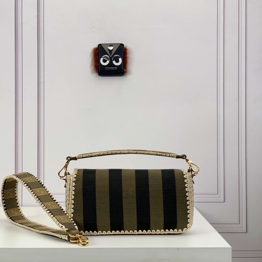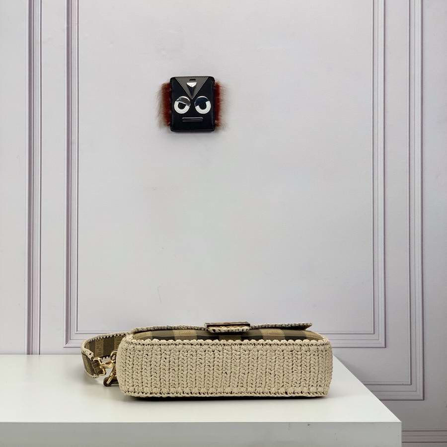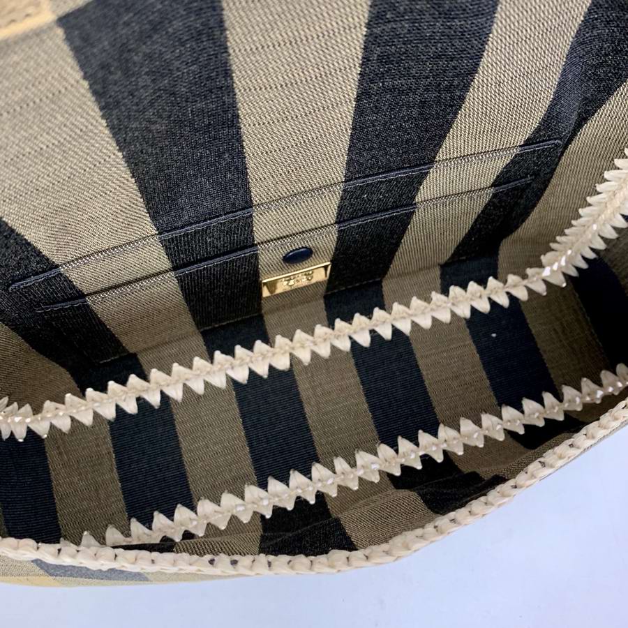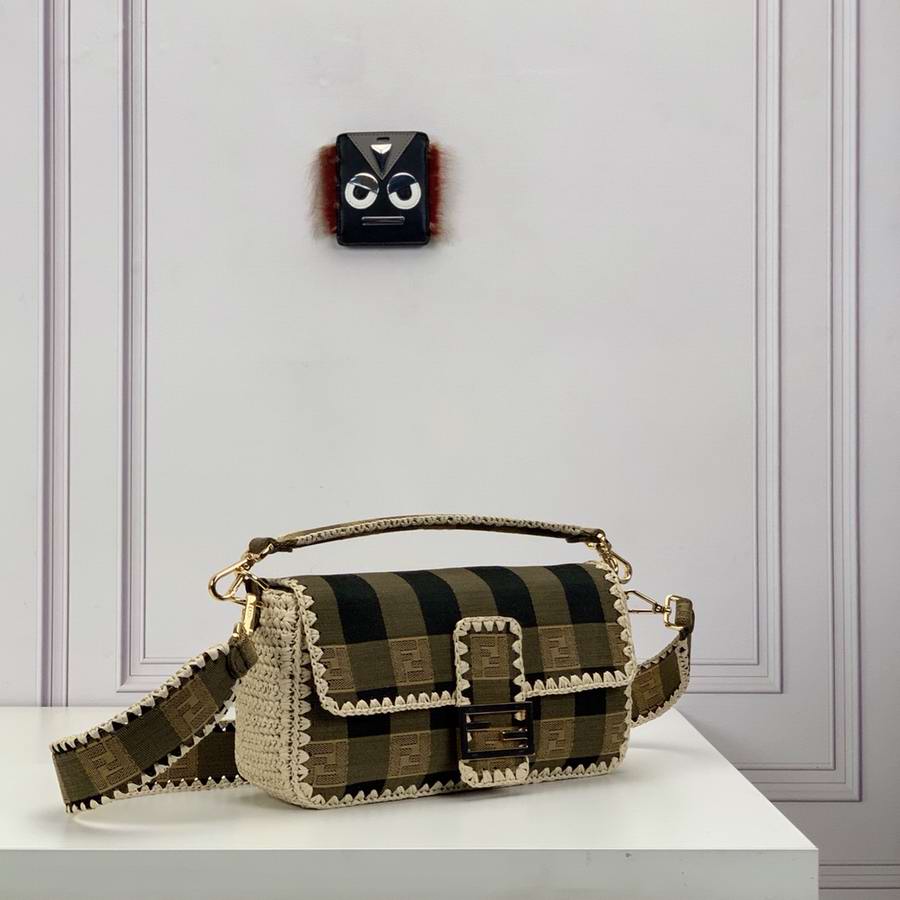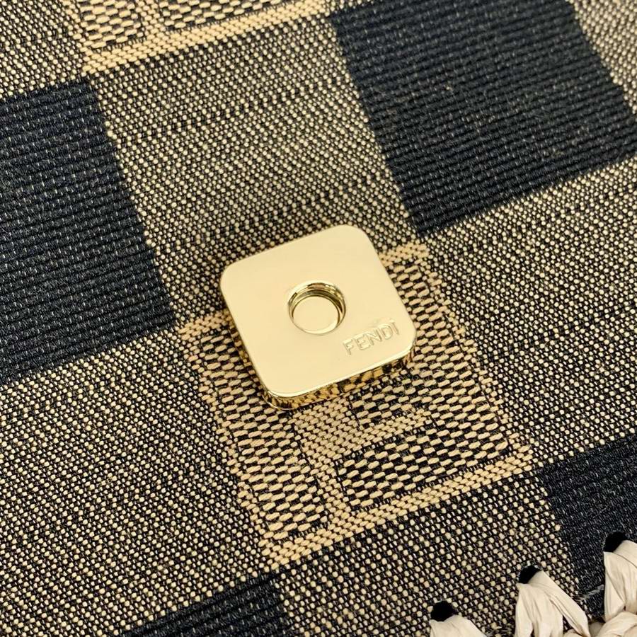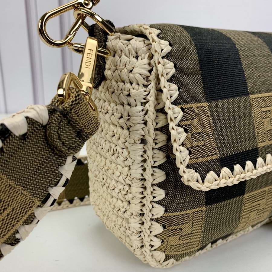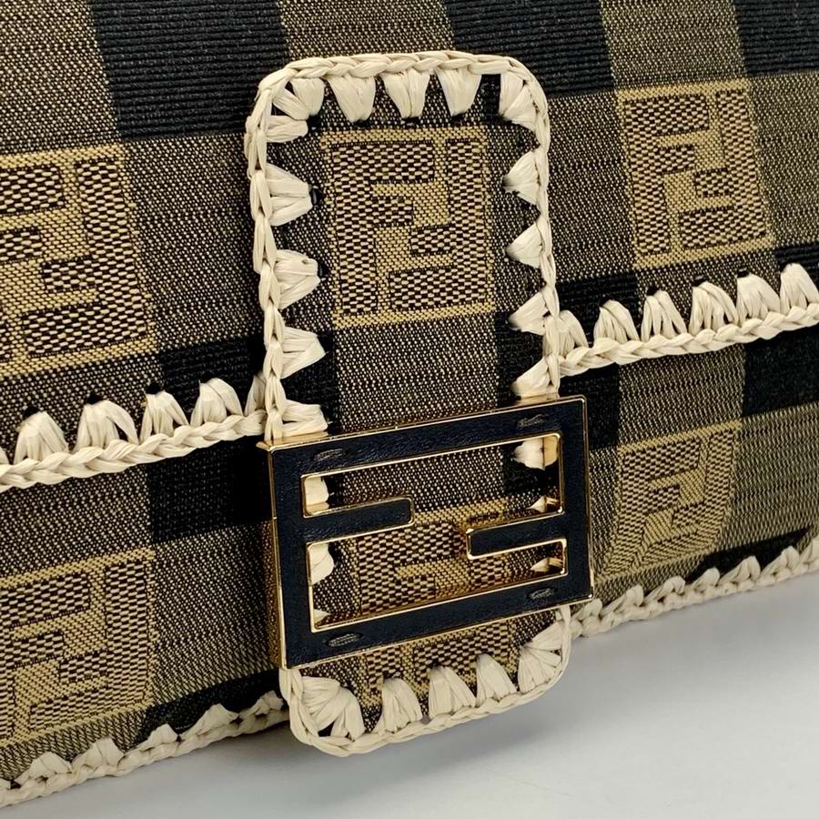 Iconic medium Baguette bag made of jacquard fabric with a brown gingham Pequin pattern and trimmed with natural raffia stitching. Decorated with an FF clasp.