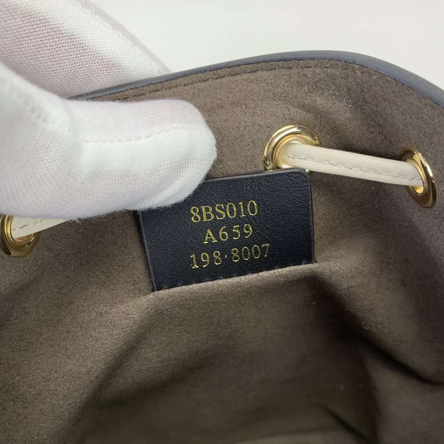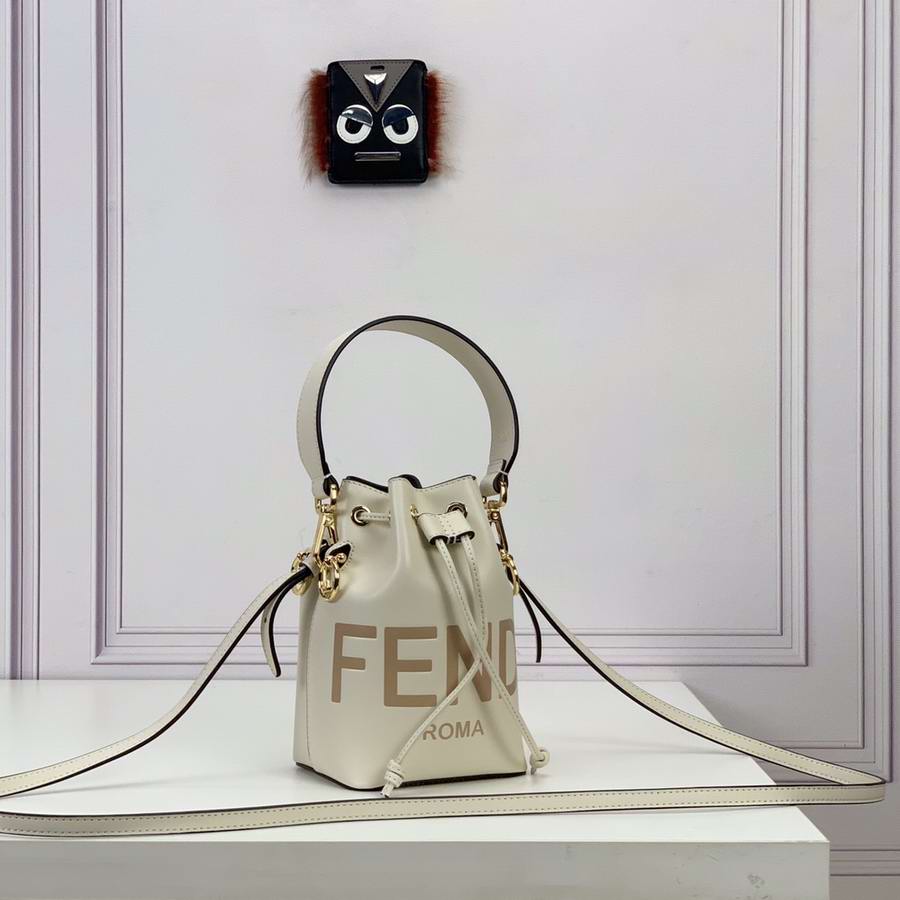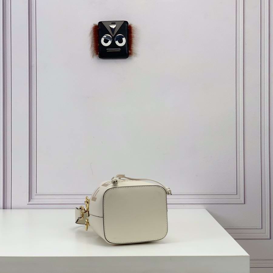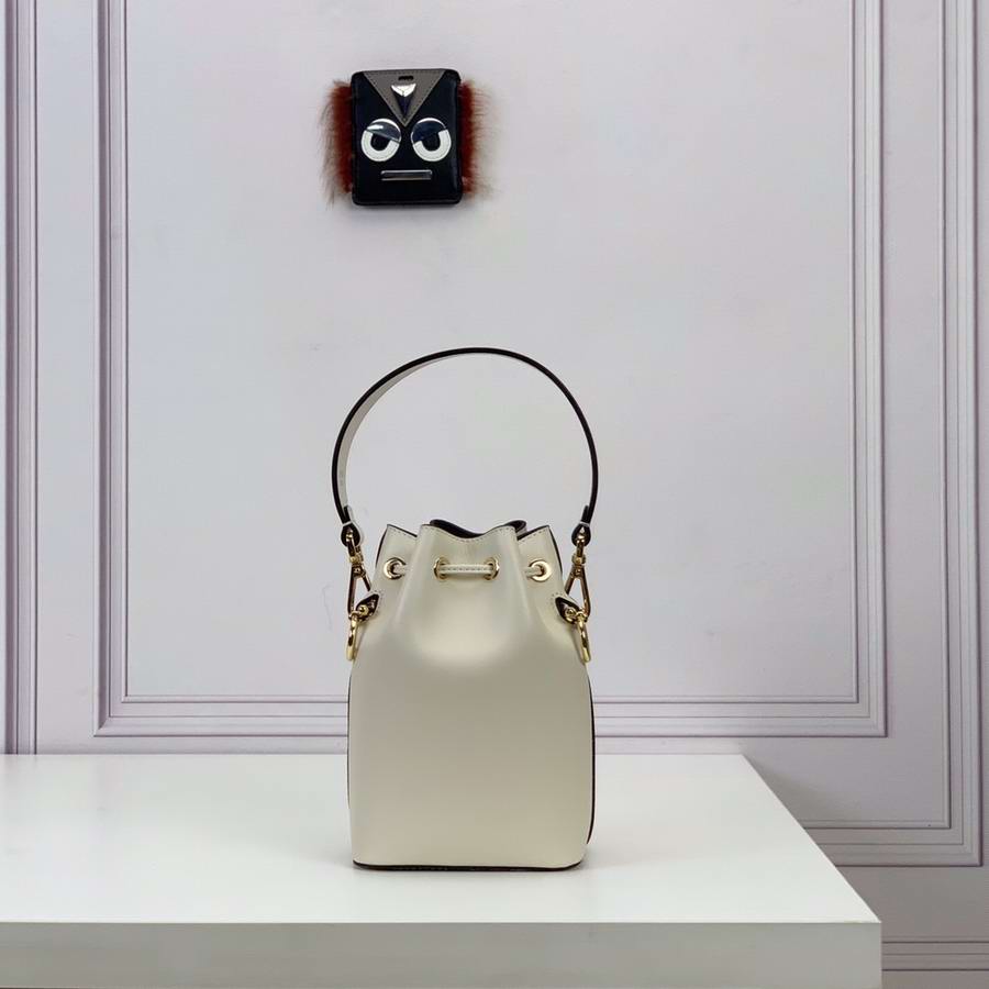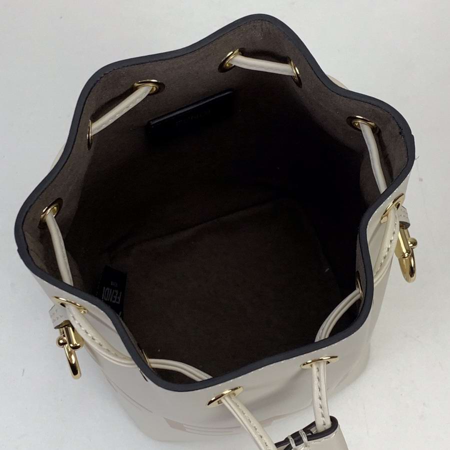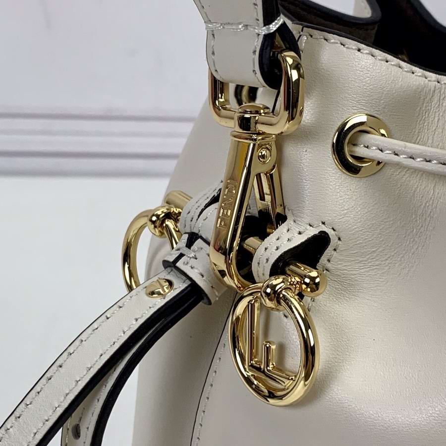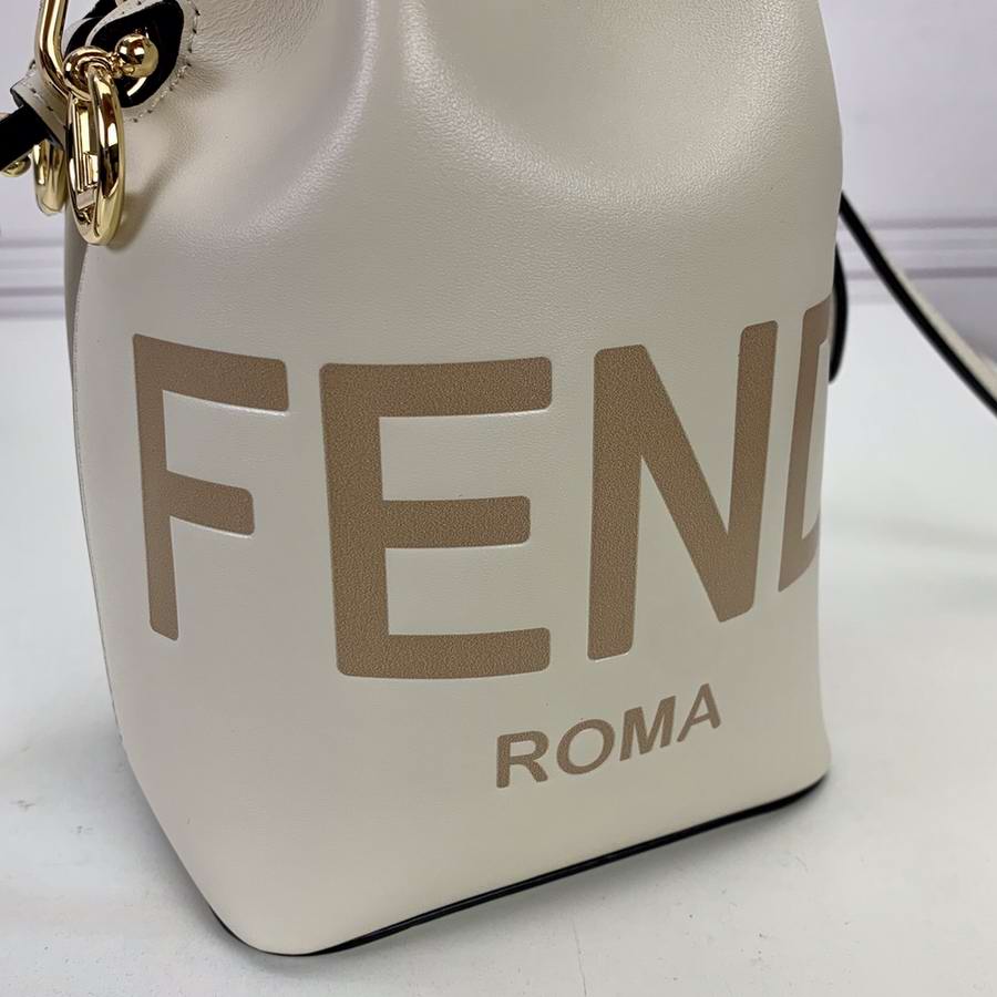 Small Mon Tresor bucket bag with drawstring fastening and metal decorations in the Fendi logo shape. Two detachable shoulder straps, one long and one short, to wear the bag over the shoulder or cross-body. Made of white leather with heat-stamped FENDI ROMA motif. Gold-finish metalware.