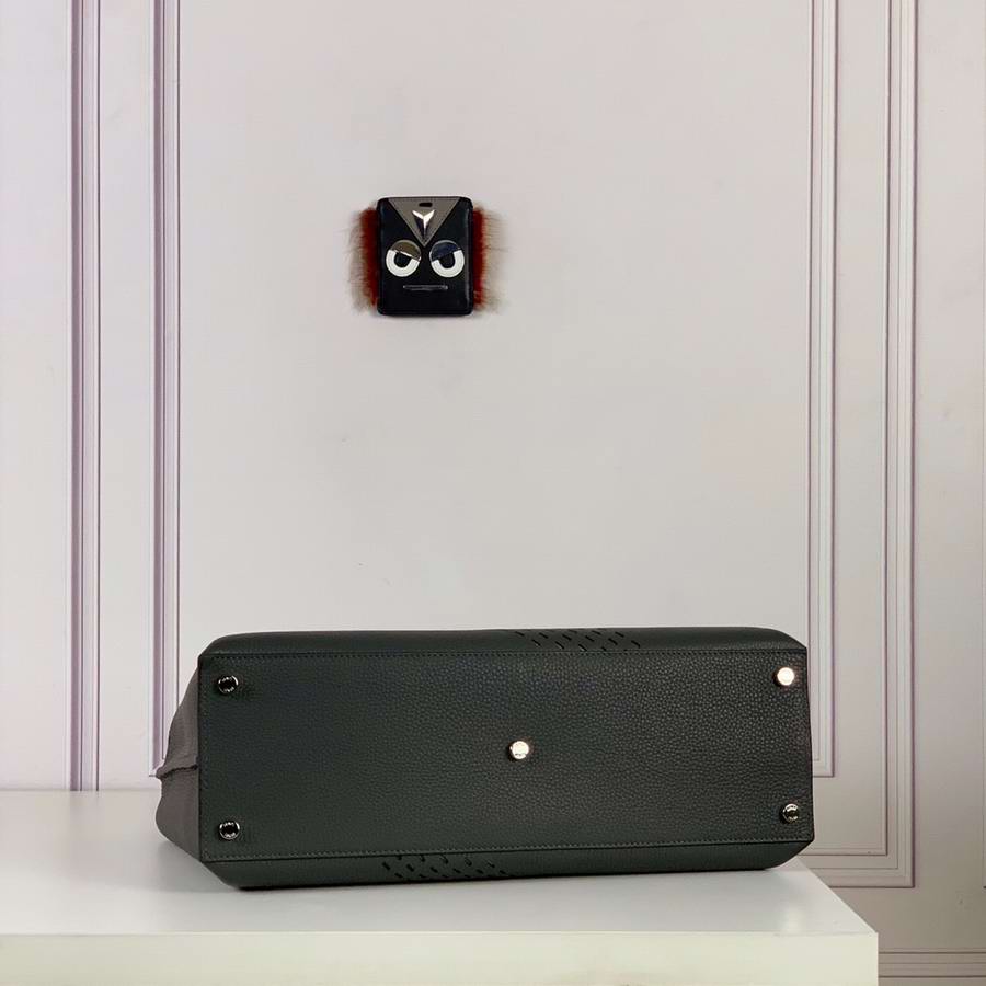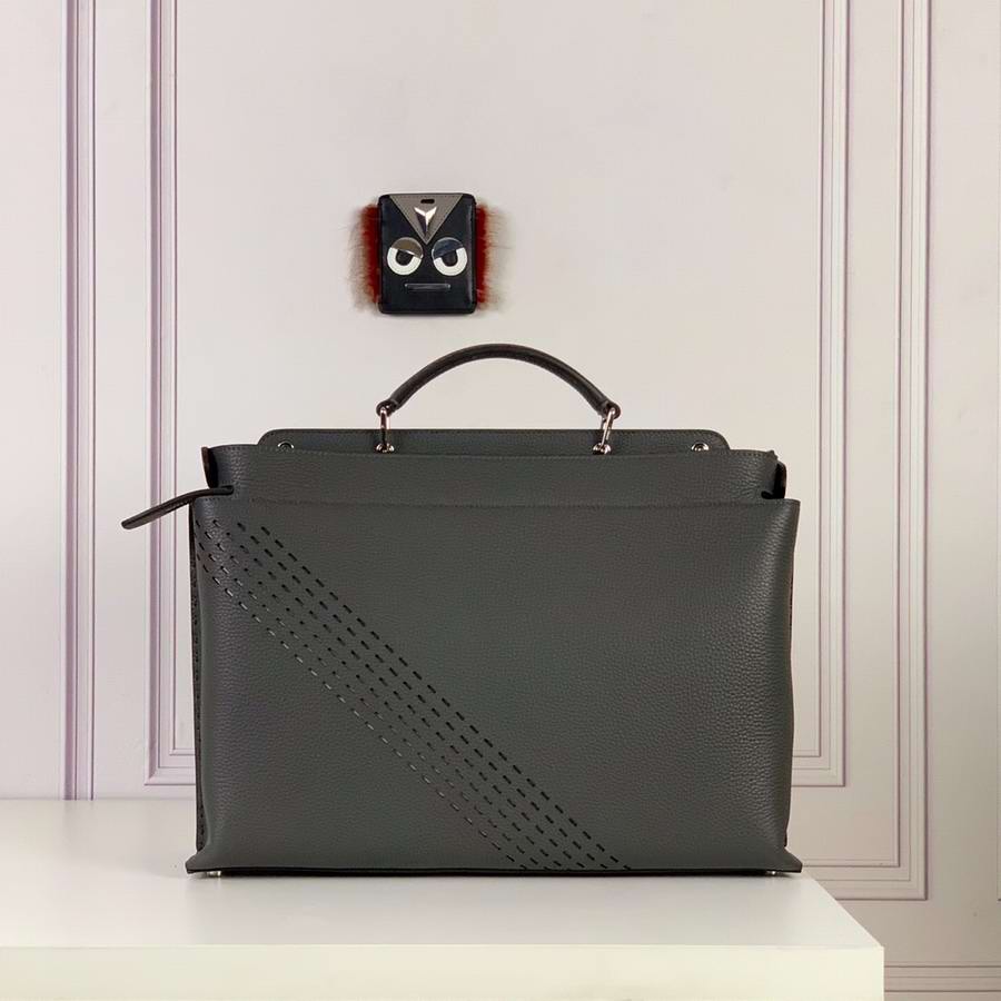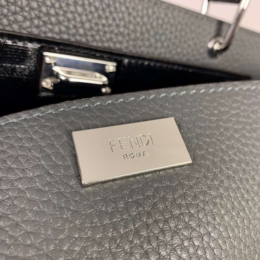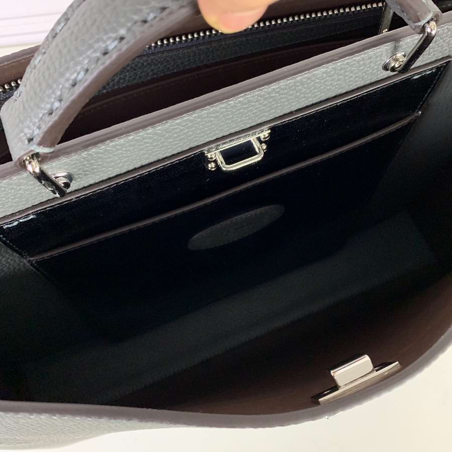 Lightweight handbag with a simple design consisting of two compartments divided by a stiff partition. Briefcase handle and an adjustable, detachable shoulder strap. Patch pocket on the inside and iconic twist lock. Made of gray Romano leather. Laser detail and trimmed with graduated, printed fabric. The pocket is made of glazed fabric with an FF motif and customized with a metal name plate. Palladium-finish metalware.