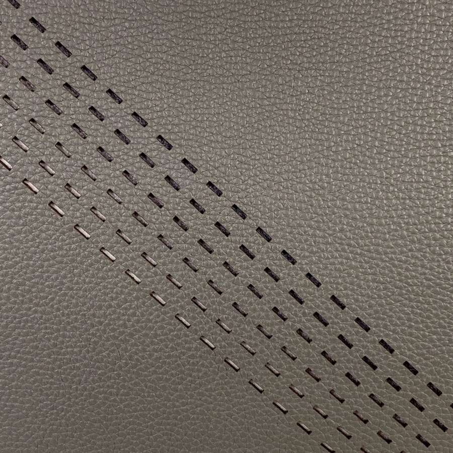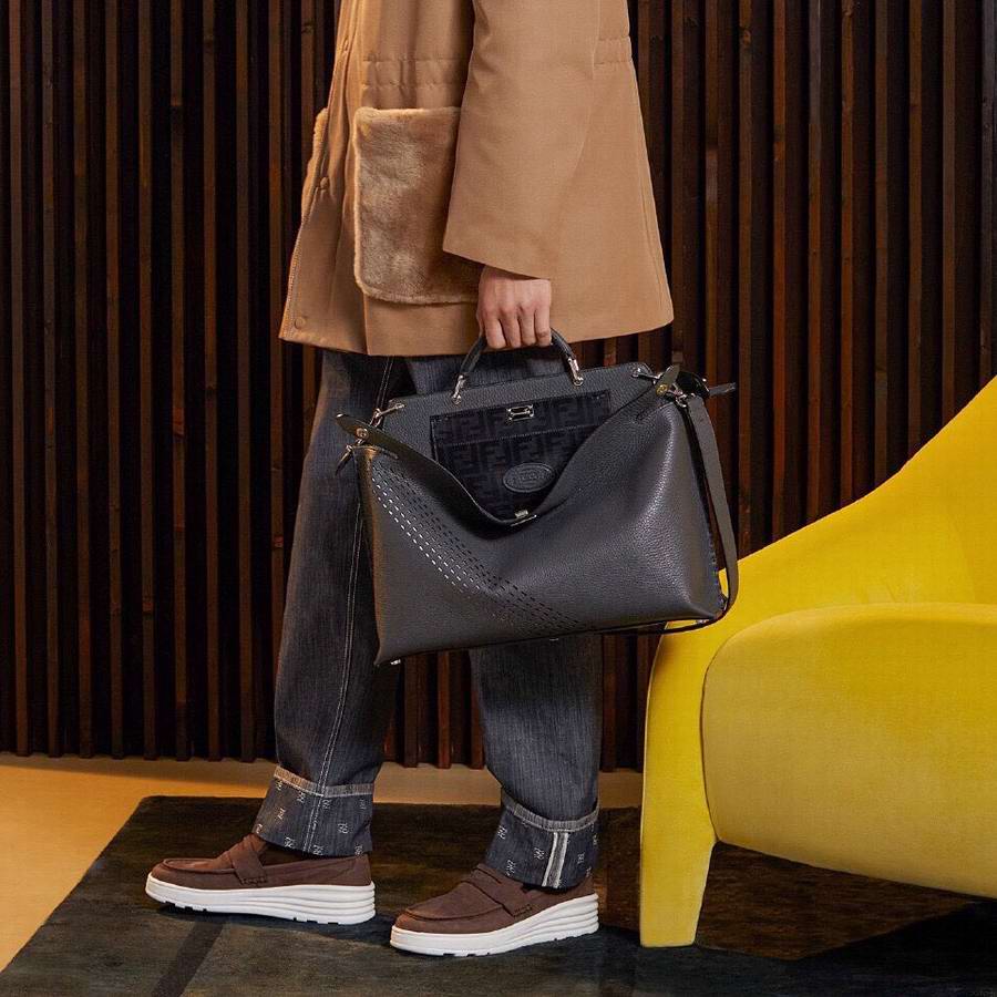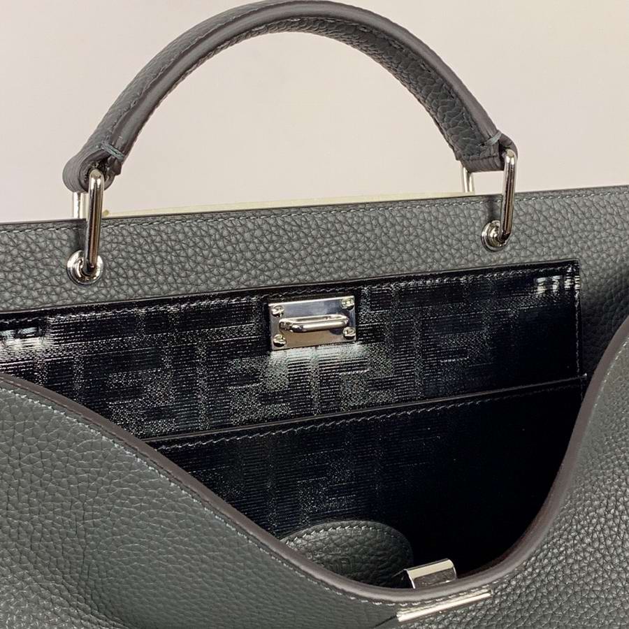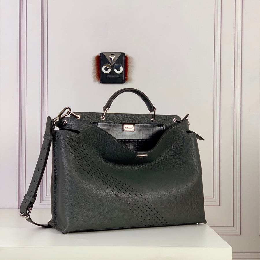 Lightweight handbag with a simple design consisting of two compartments divided by a stiff partition. Briefcase handle and an adjustable, detachable shoulder strap. Patch pocket on the inside and iconic twist lock. Made of gray Romano leather. Laser detail and trimmed with graduated, printed fabric. The pocket is made of glazed fabric with an FF motif and customized with a metal name plate. Palladium-finish metalware.