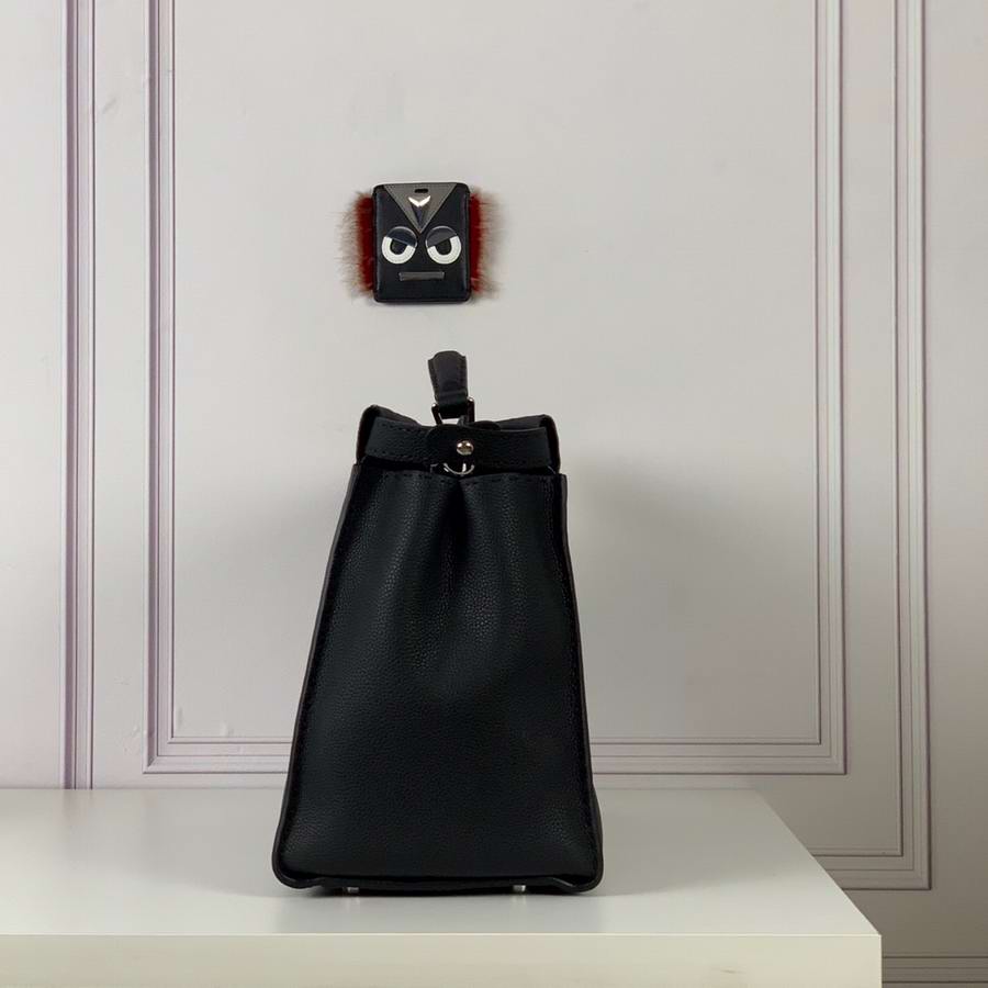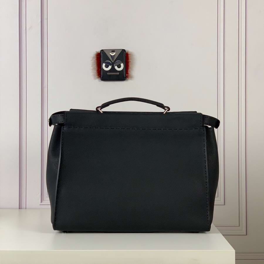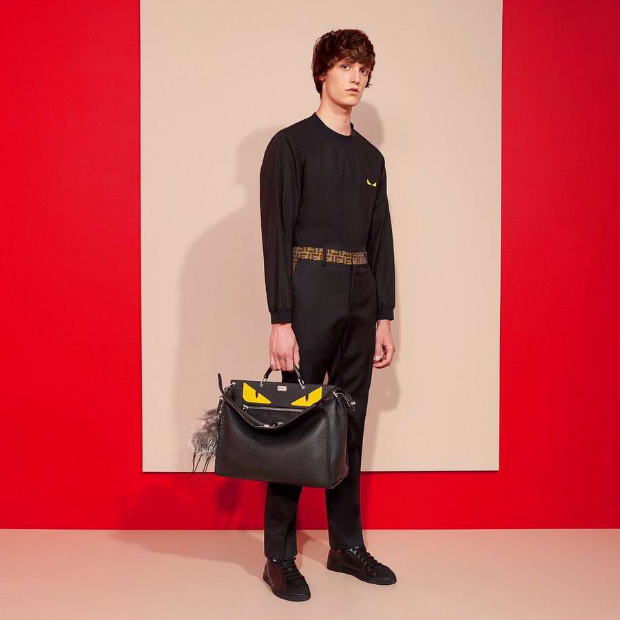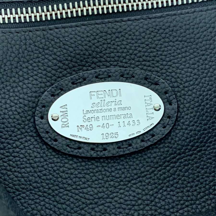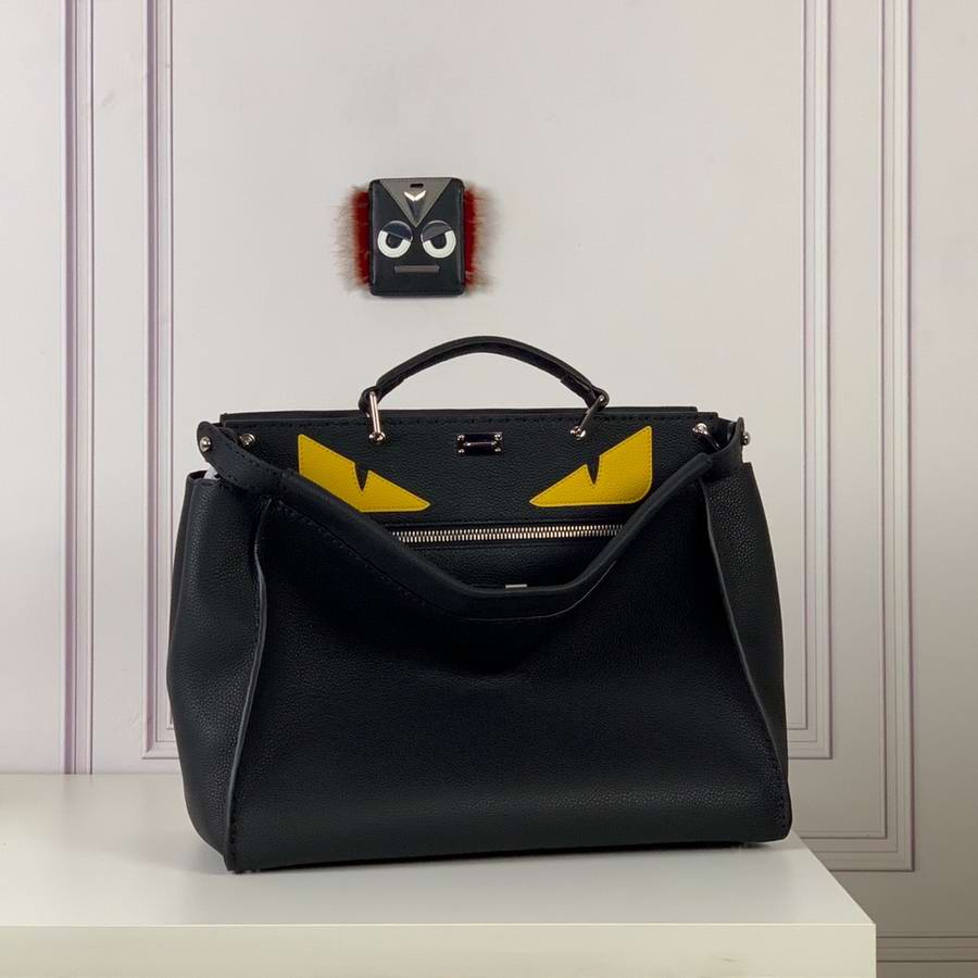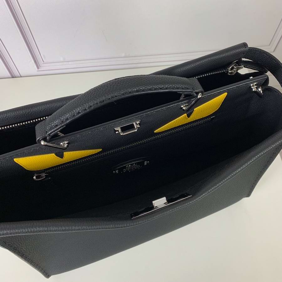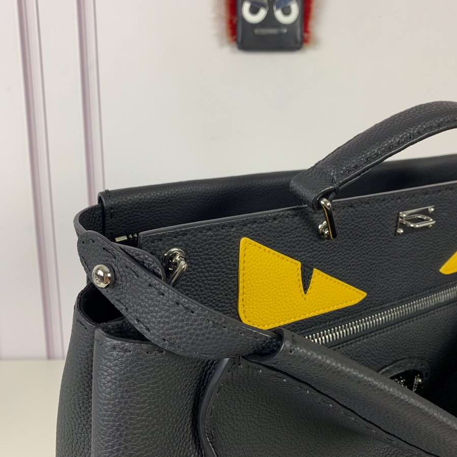 Black Roman leather handbag, with raw edge and 1204 hand-sewn stitches and Bag Bugs inlay. Two compartments with stiff yellow leather partition. Palladium front hook, zipper and metalware. Satchel handle and adjustable, detachable shoulder strap. Silver Selleria plaque with engraved serial number.