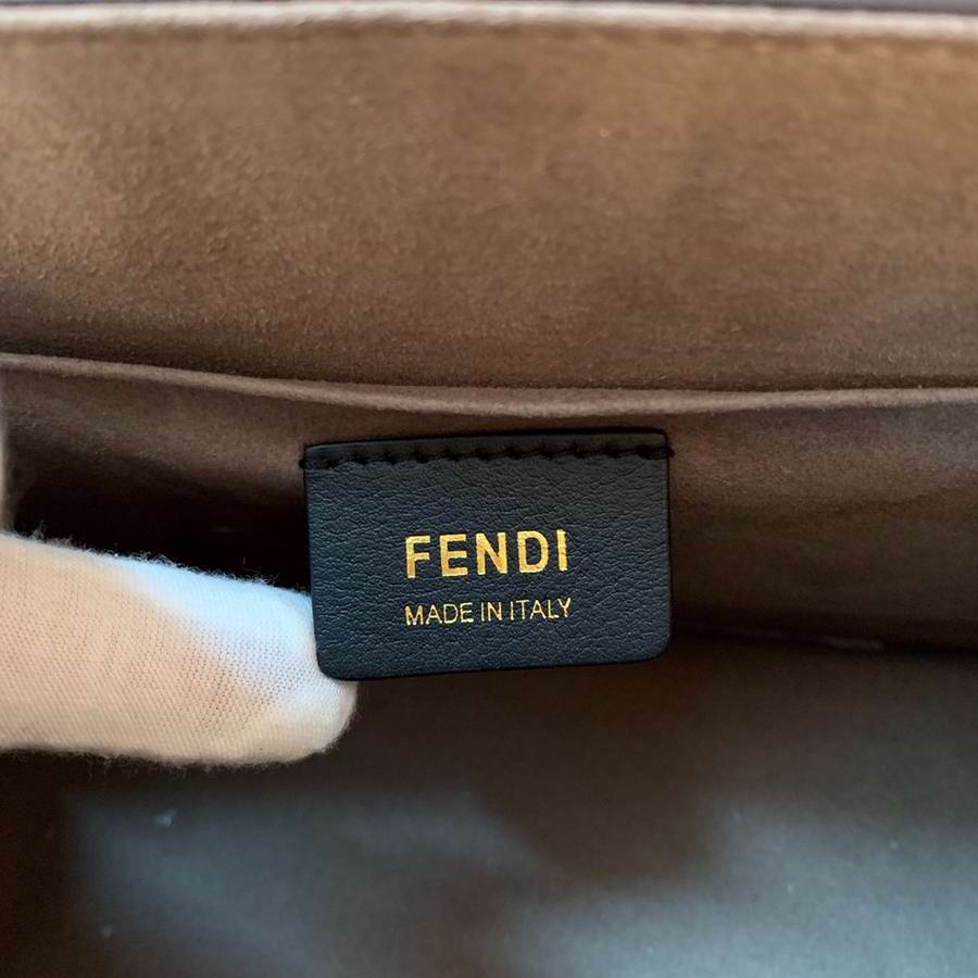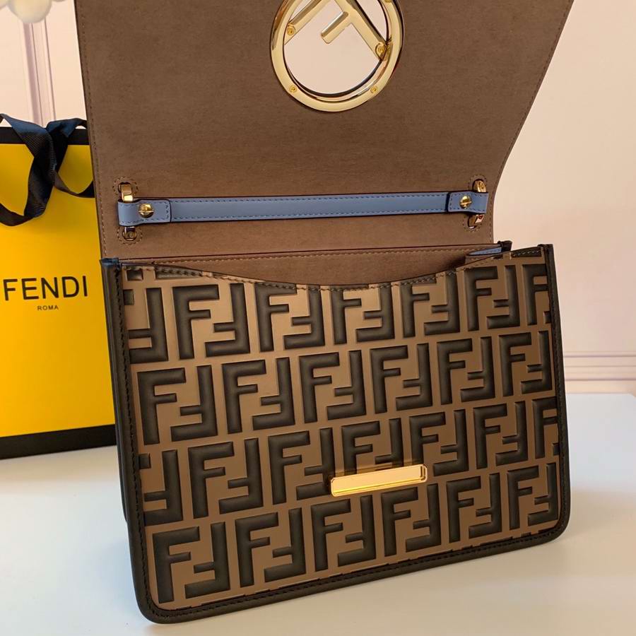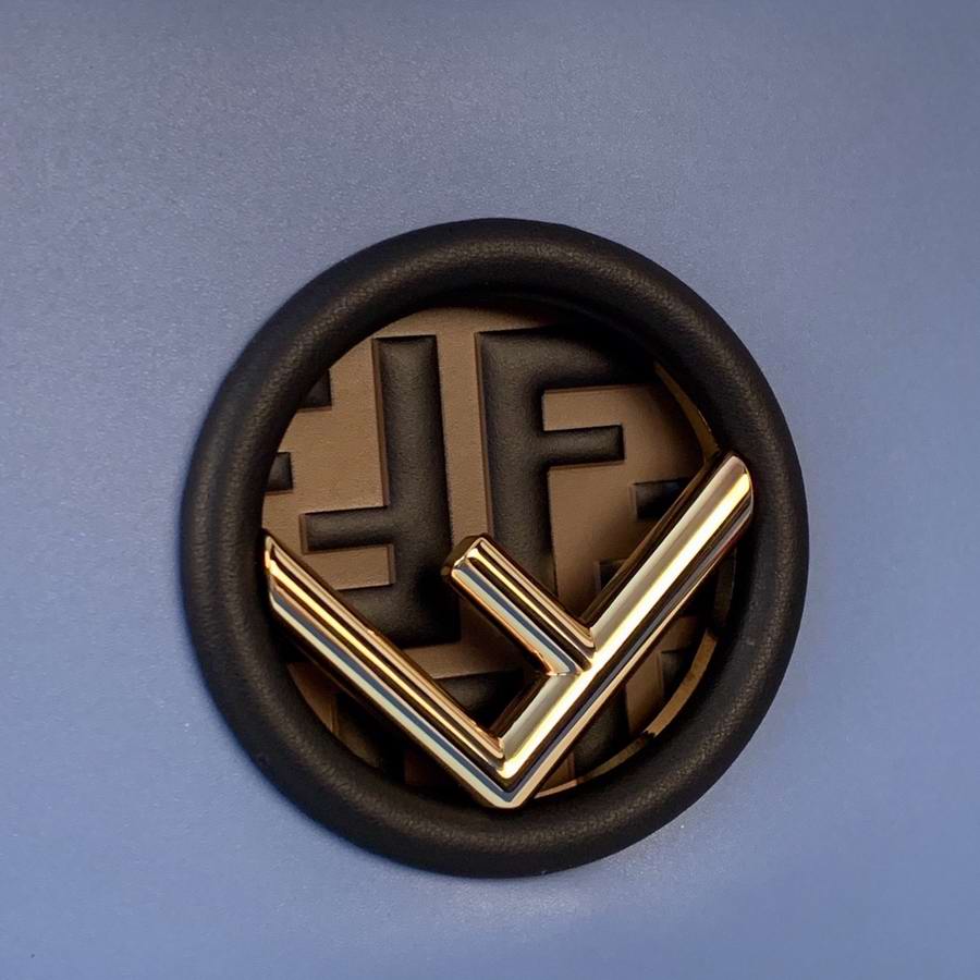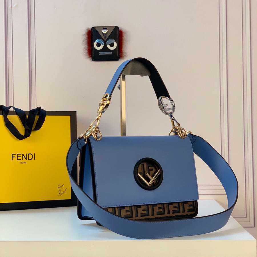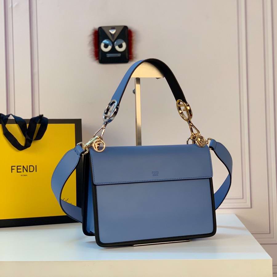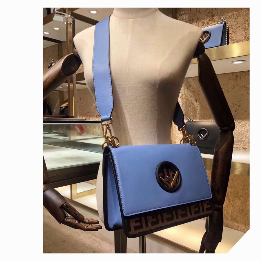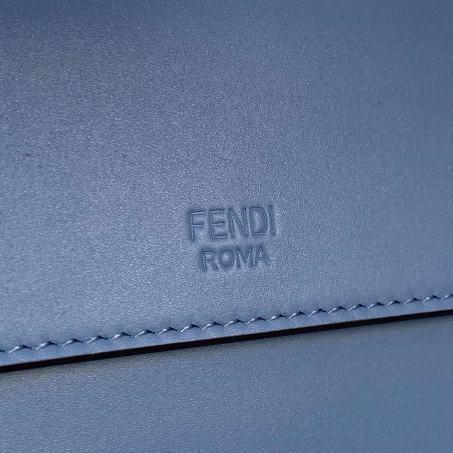 blue leather bag with flap, decorated with an F is Fendi metal logo. Embossed and hand-painted FF motif on the underside of the flap. Featuring an inside pocket, magnetic clasp and metal accessories in a mix of palladium and gold finishes. Can be worn cross-body or carried by hand thanks to the detachable shoulder strap.