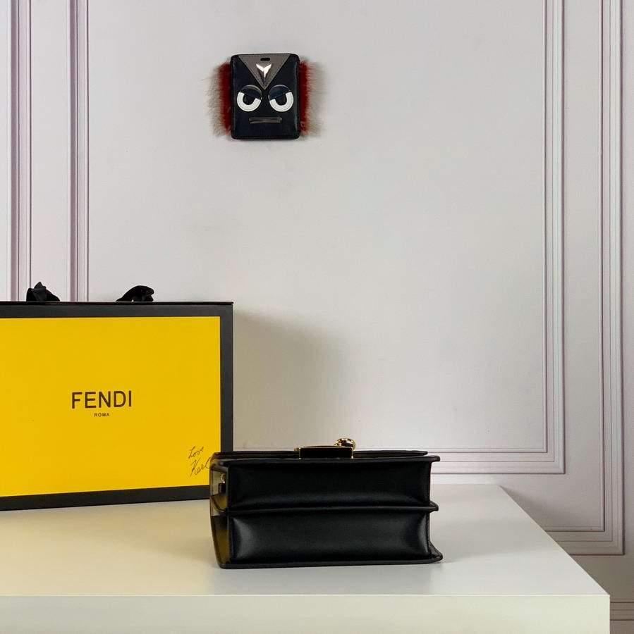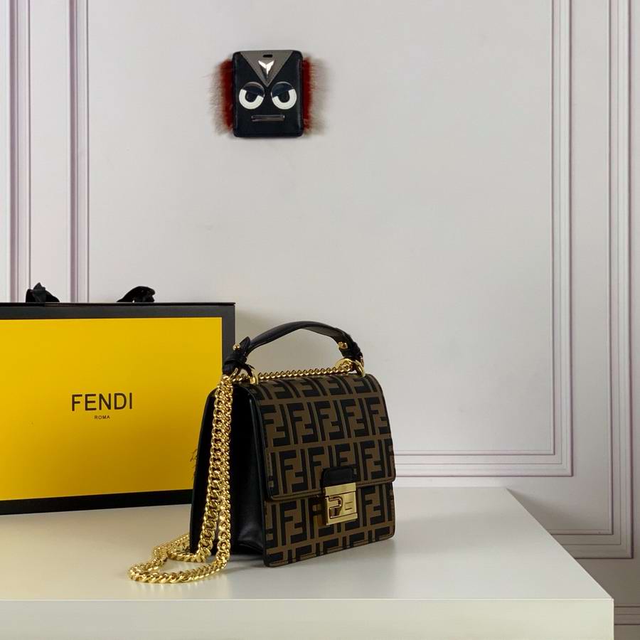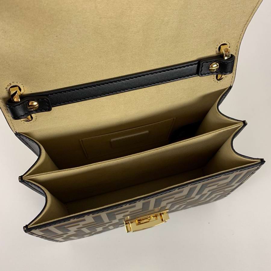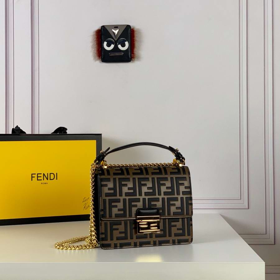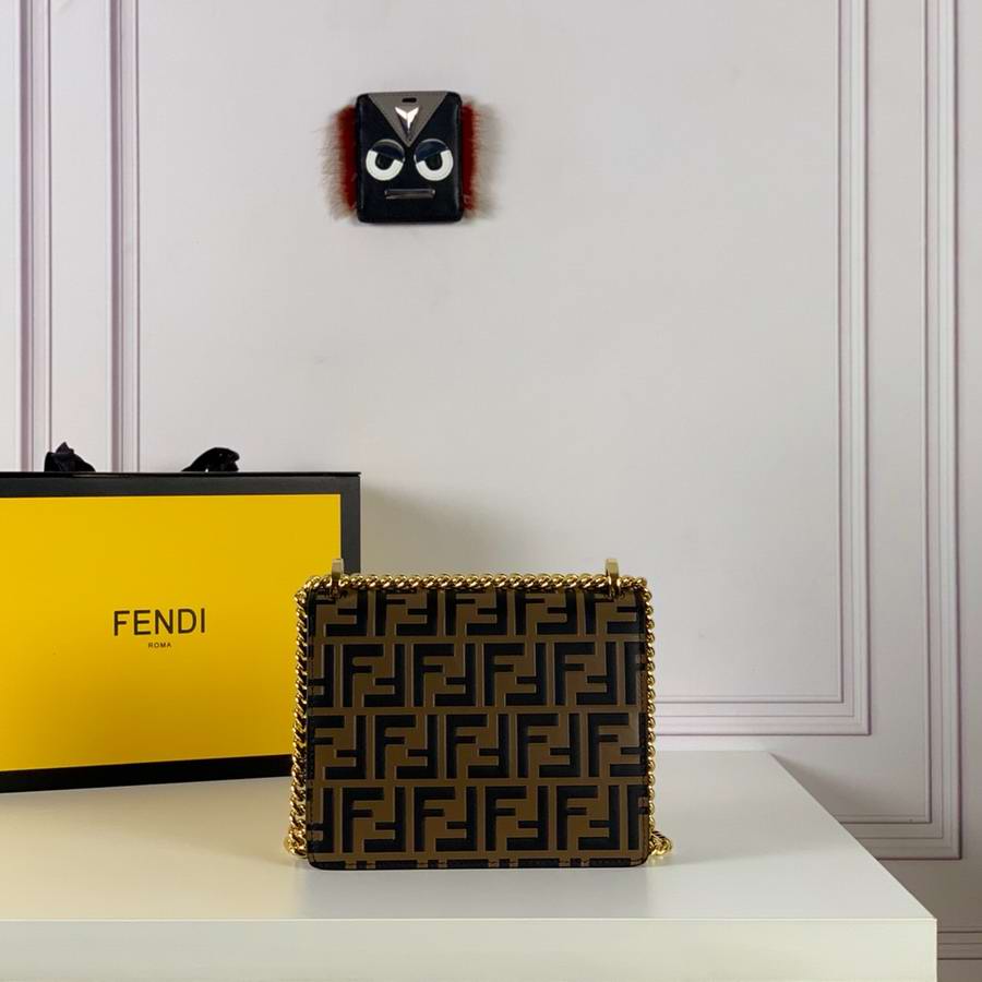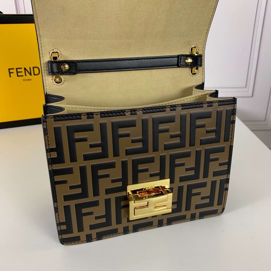 Mini-bag with flap made of leather with embossed FF motif hand-painted in brown and black. Decorated with iconic FF press fastening. Featuring two gusseted compartments separated by a stiff partition, with an inner pocket and gold-finish metalware. Can be worn cross-body or carried by hand thanks to the detachable shoulder strap.