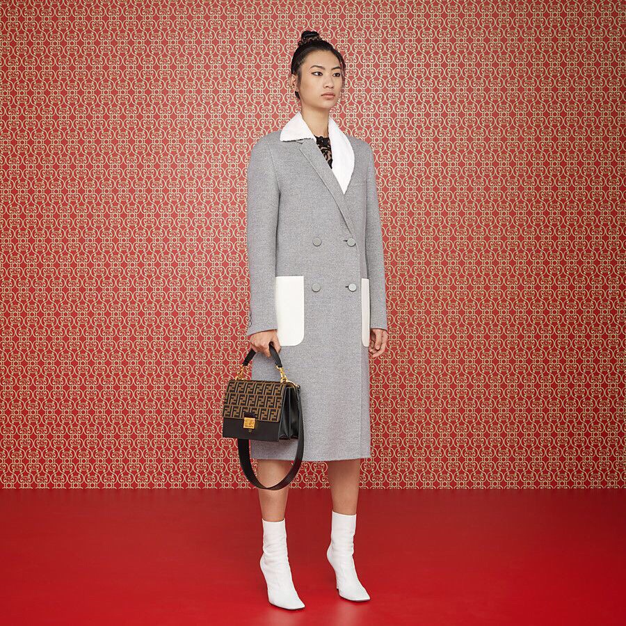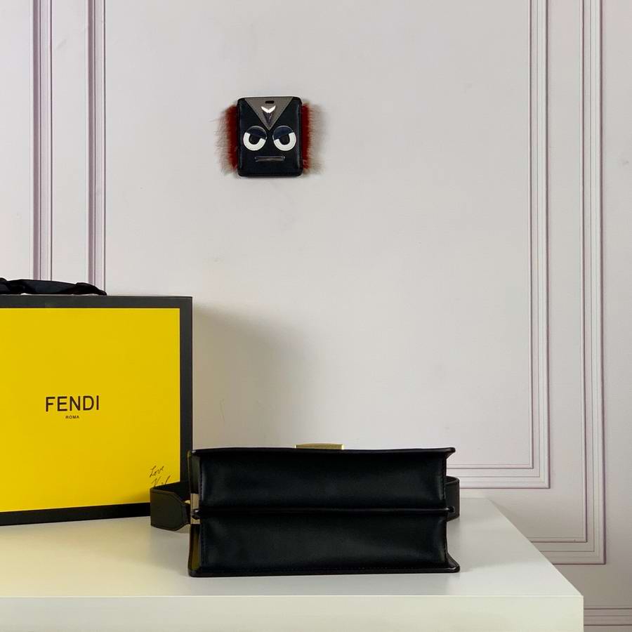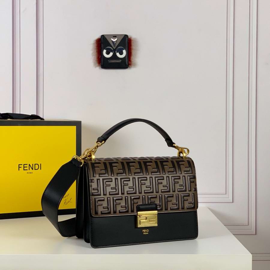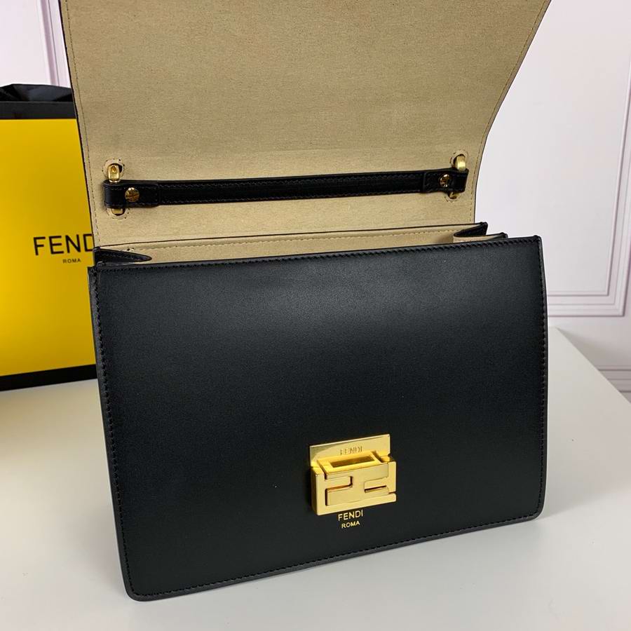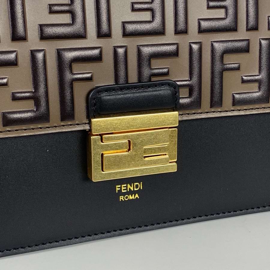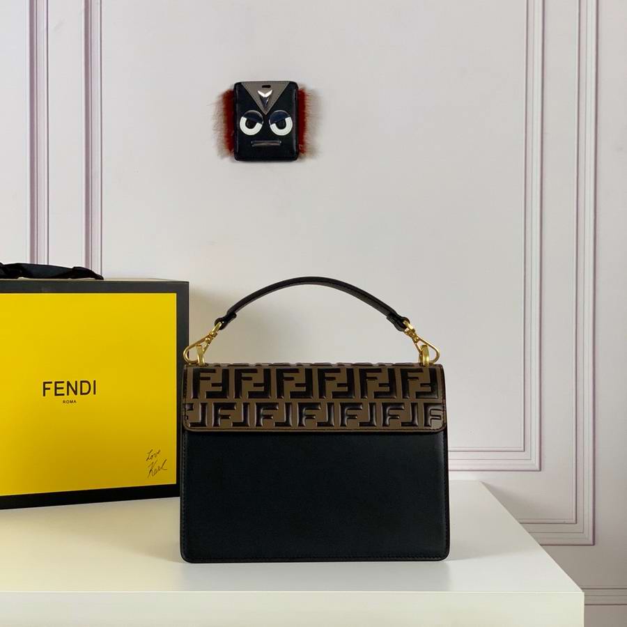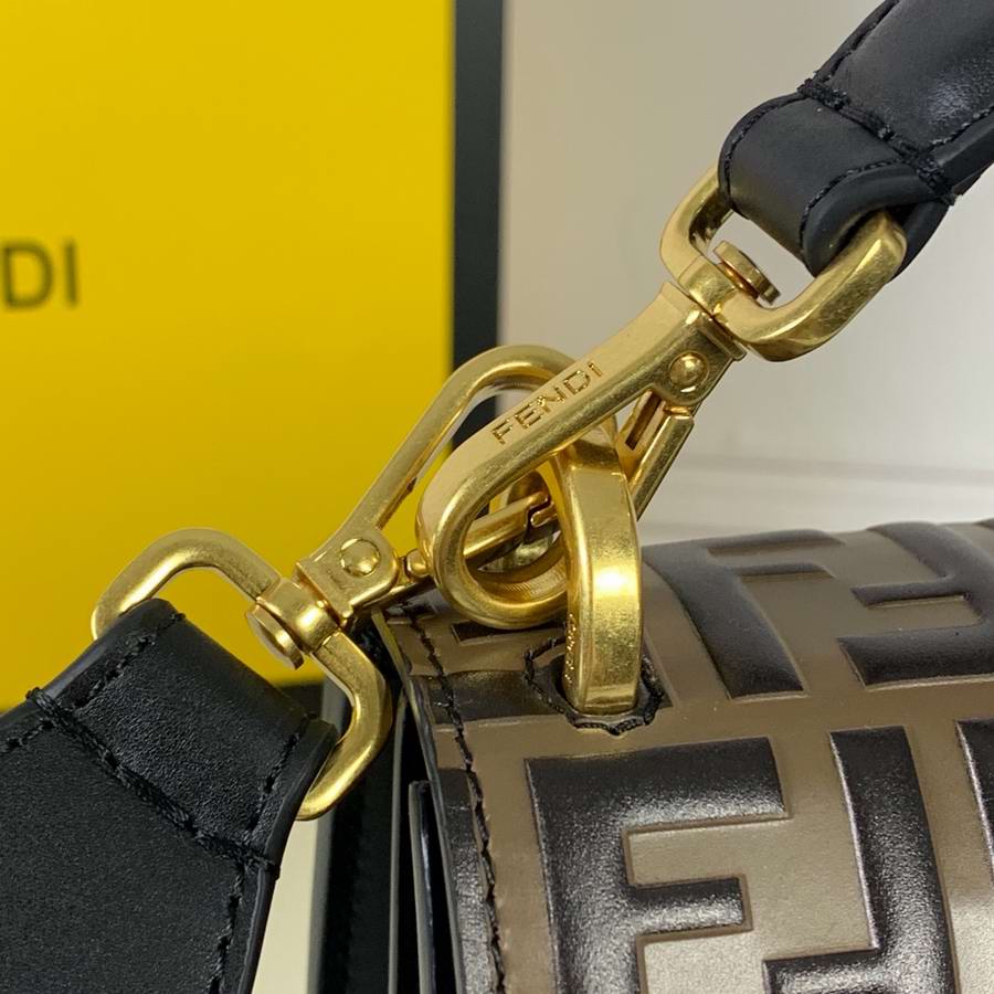Bag with flap made of black leather embossed and hand-painted with the FF motif in brown. Decorated with iconic FF press fastening.