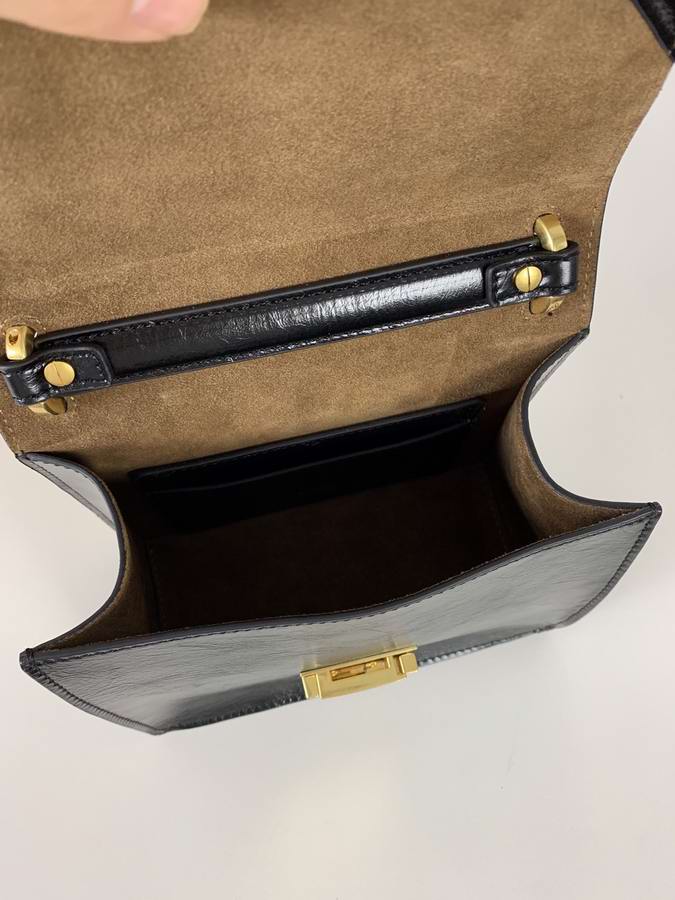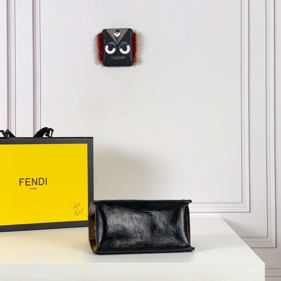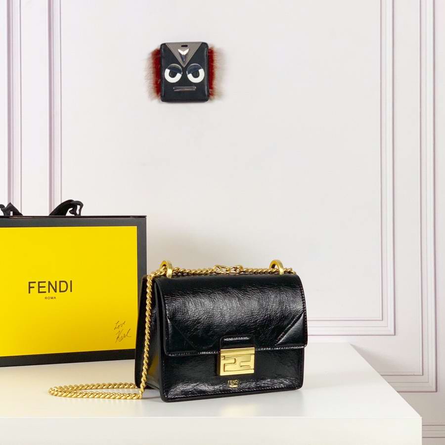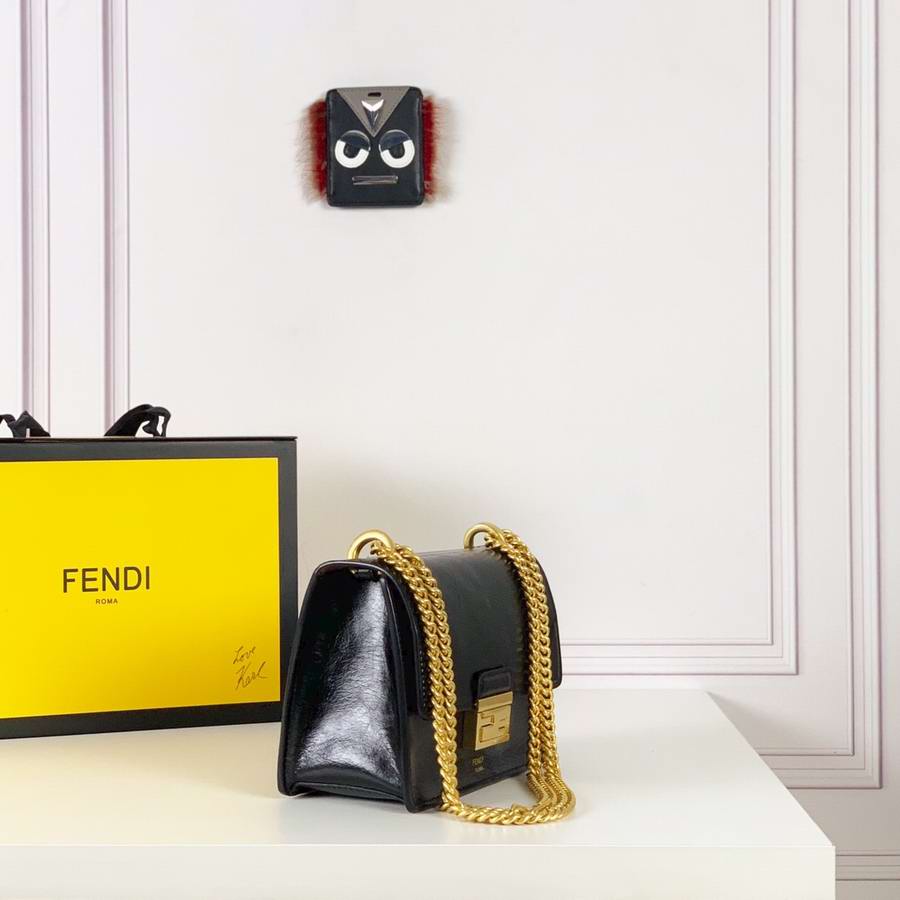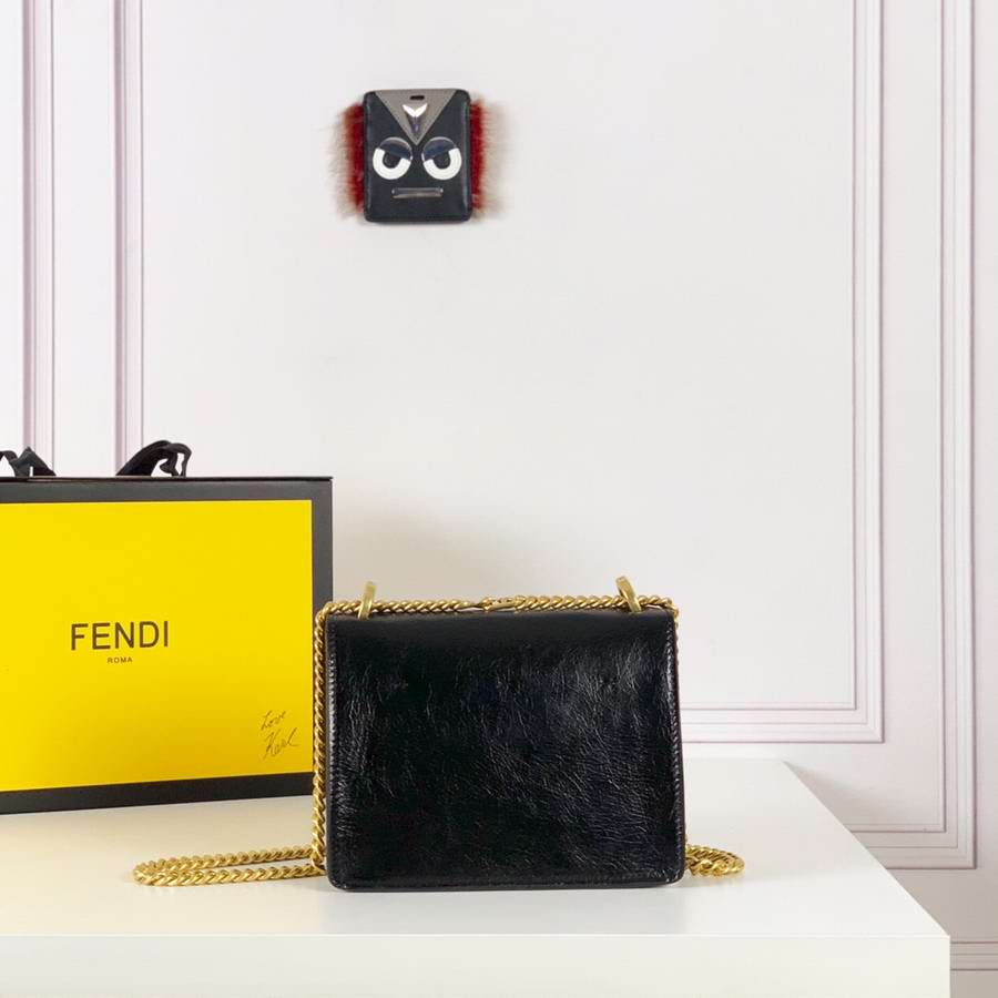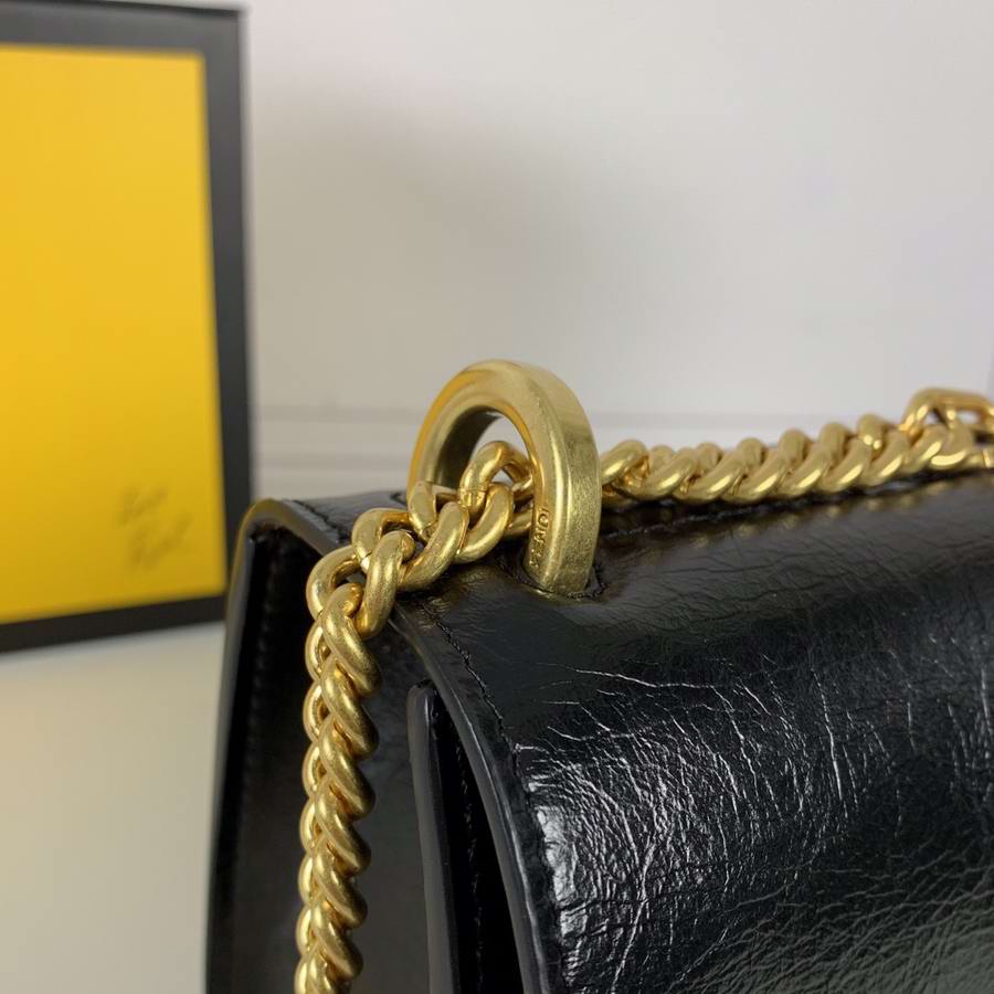 Geometric bag made of matte black leather, with the flap embellished with embossed corners and iconic FF press fastening. Featuring a gusseted interior compartment, flat inner pocket and gold-finish metalware. Can be worn either on the shoulder or cross-body thanks to the double detachable shoulder straps, one long and adjustable and one short with a chain.