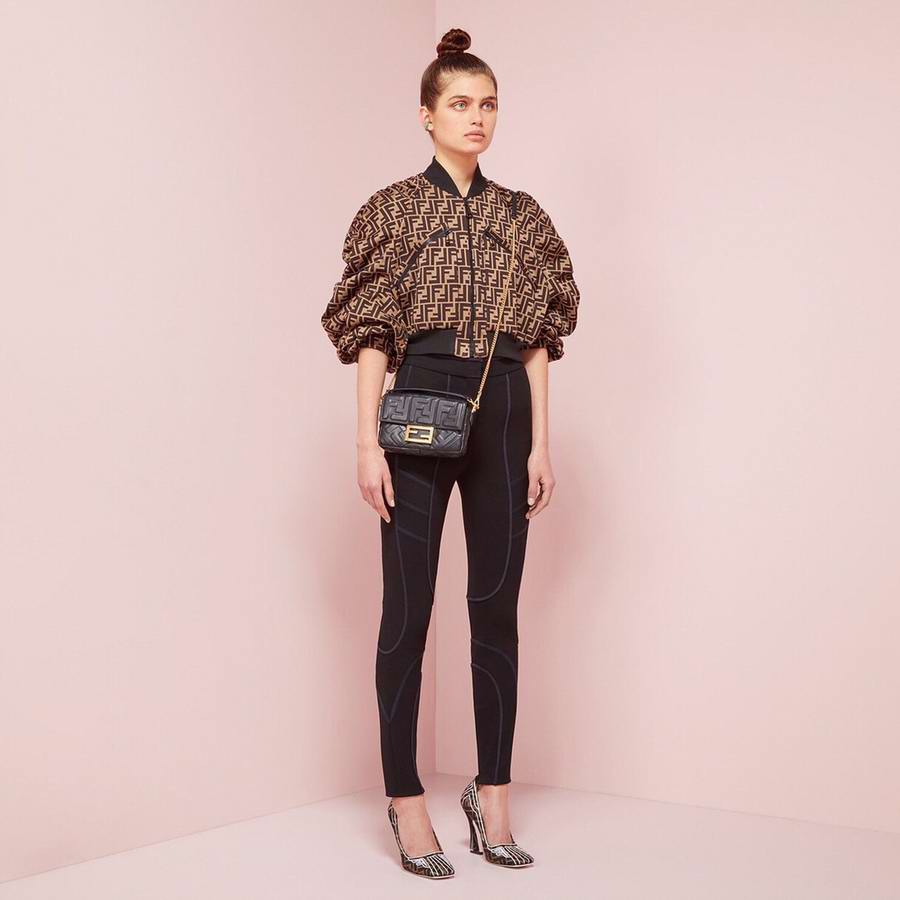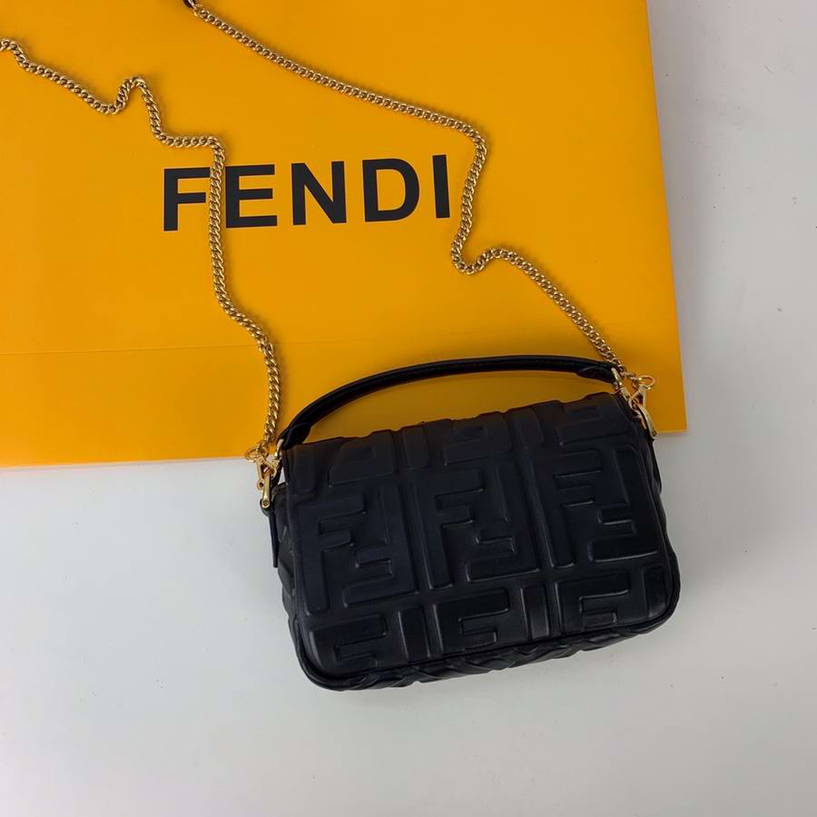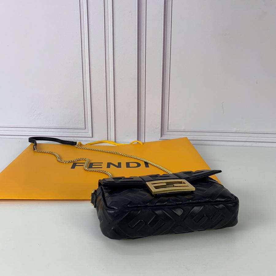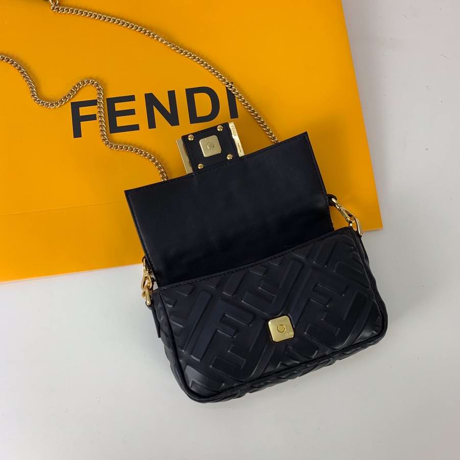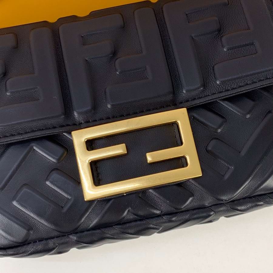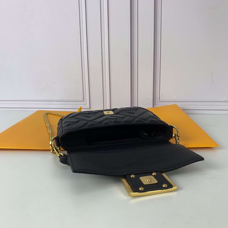 Iconic mini Baguette bag made of black soft nappa leather with a three-dimensional texture FF motif. Decorated with an FF clasp.