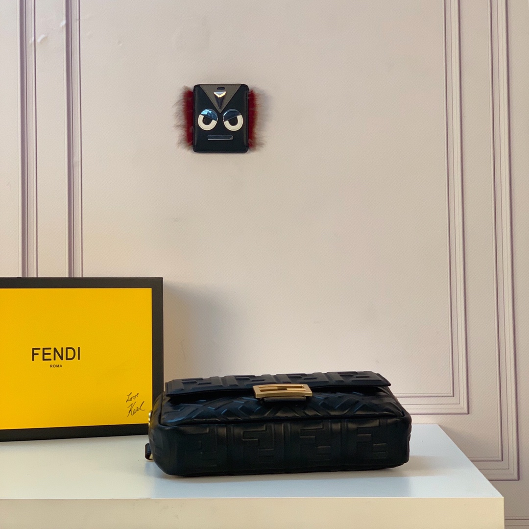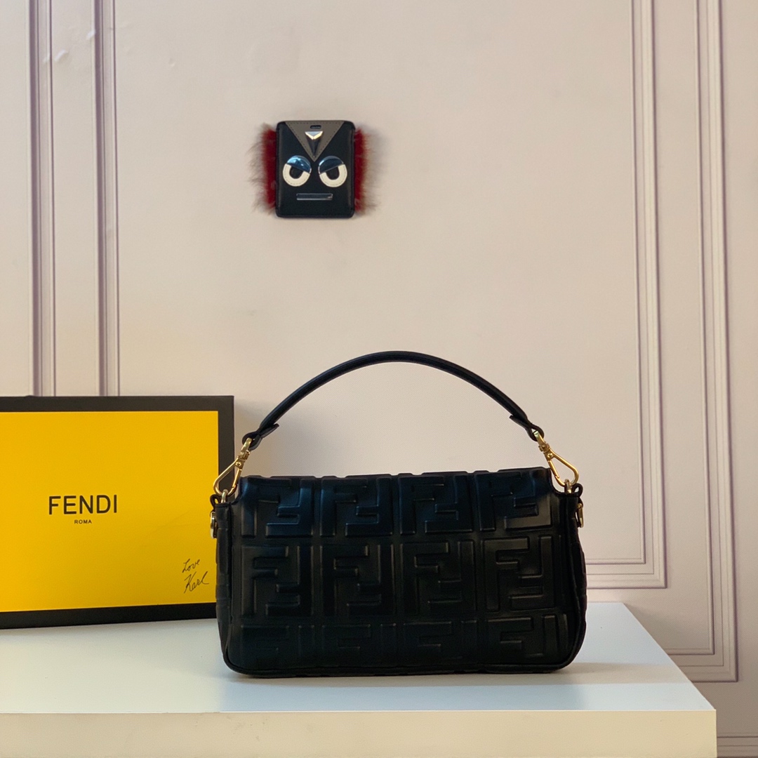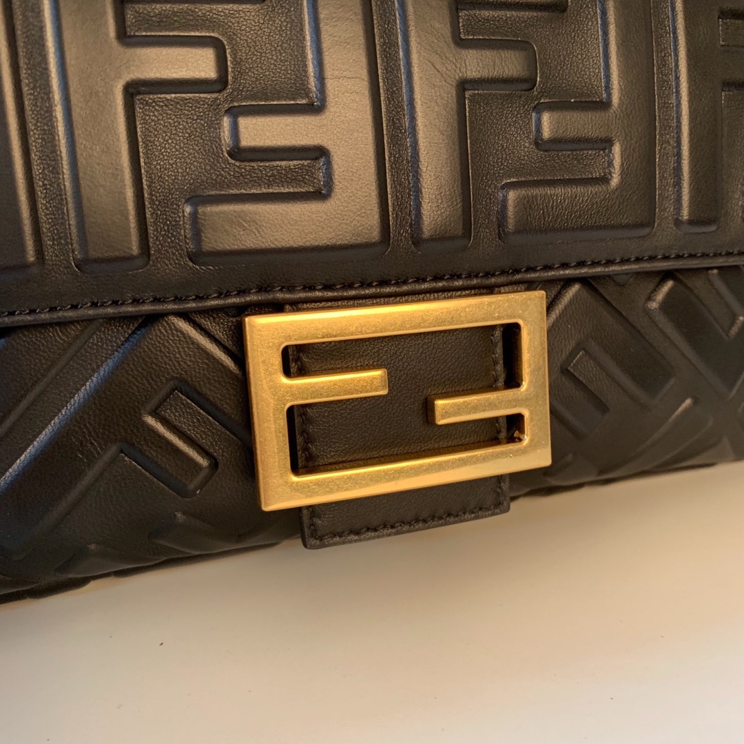 Iconic mini Baguette bag made of black soft nappa leather with a three-dimensional texture FF motif. Decorated with an FF clasp.