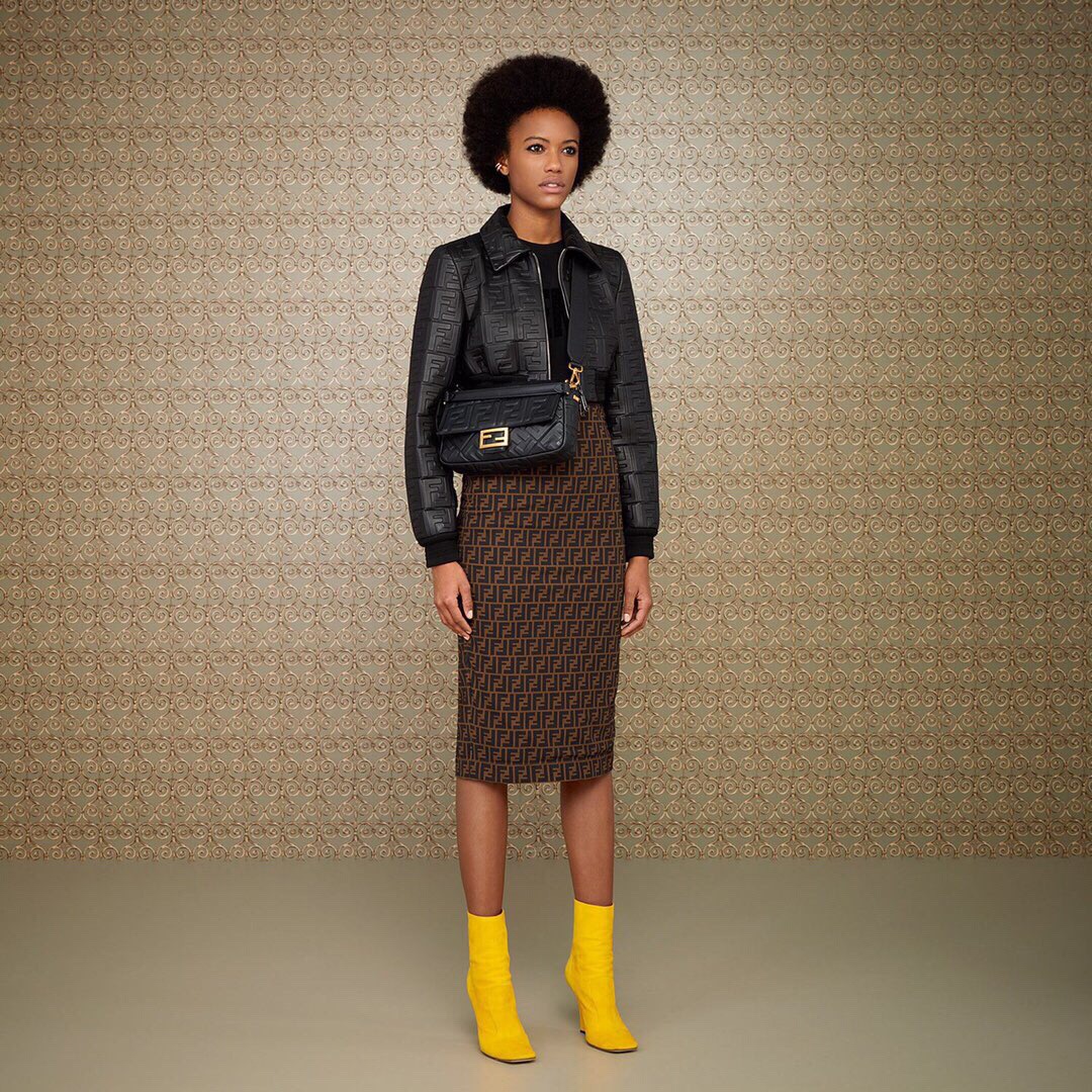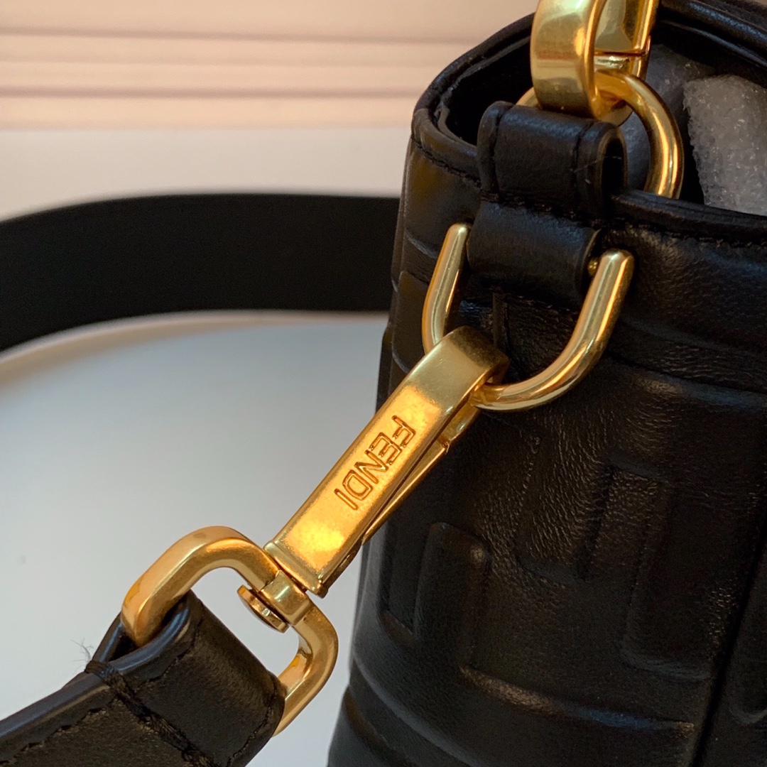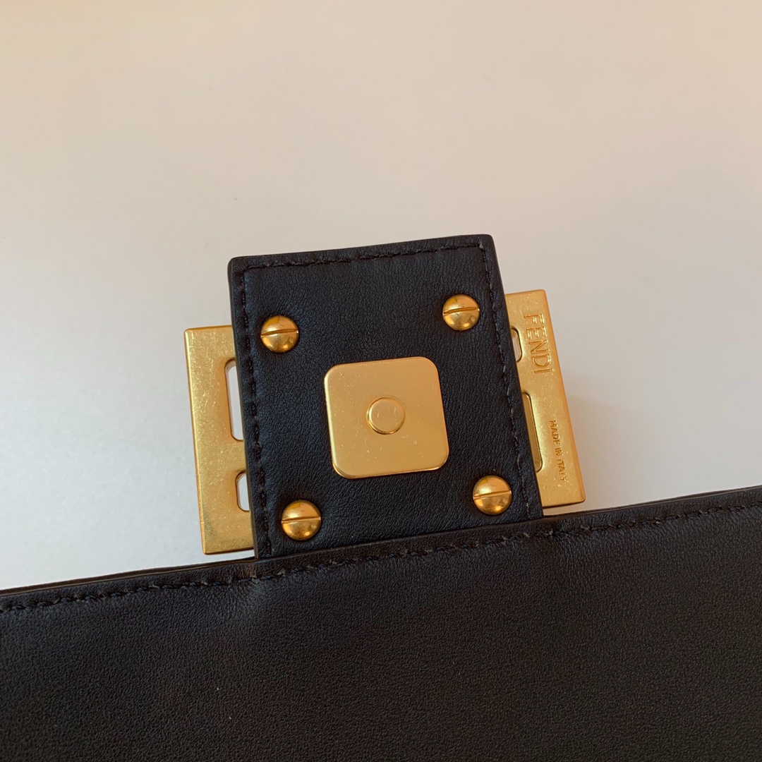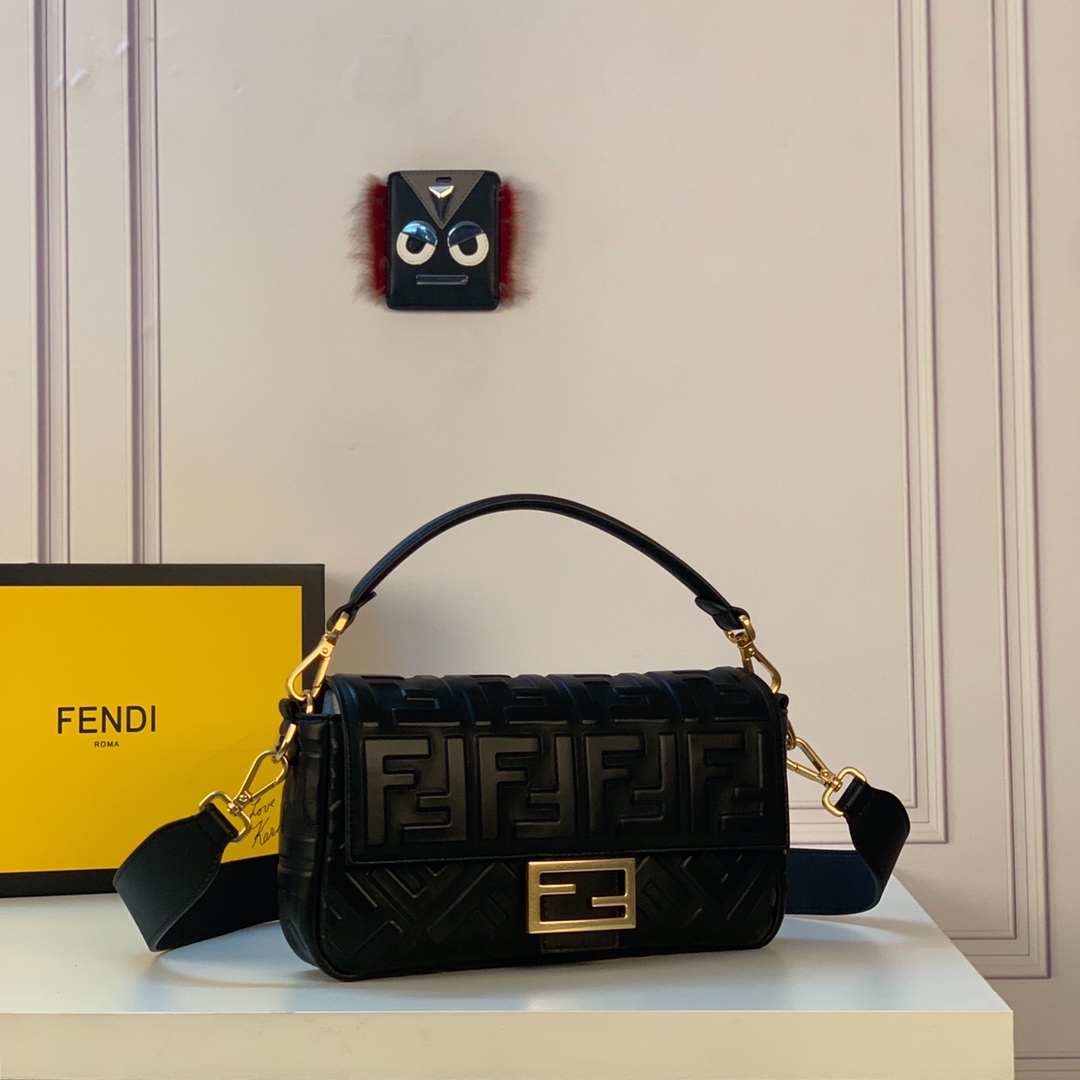 Iconic mini Baguette bag made of black soft nappa leather with a three-dimensional texture FF motif. Decorated with an FF clasp.