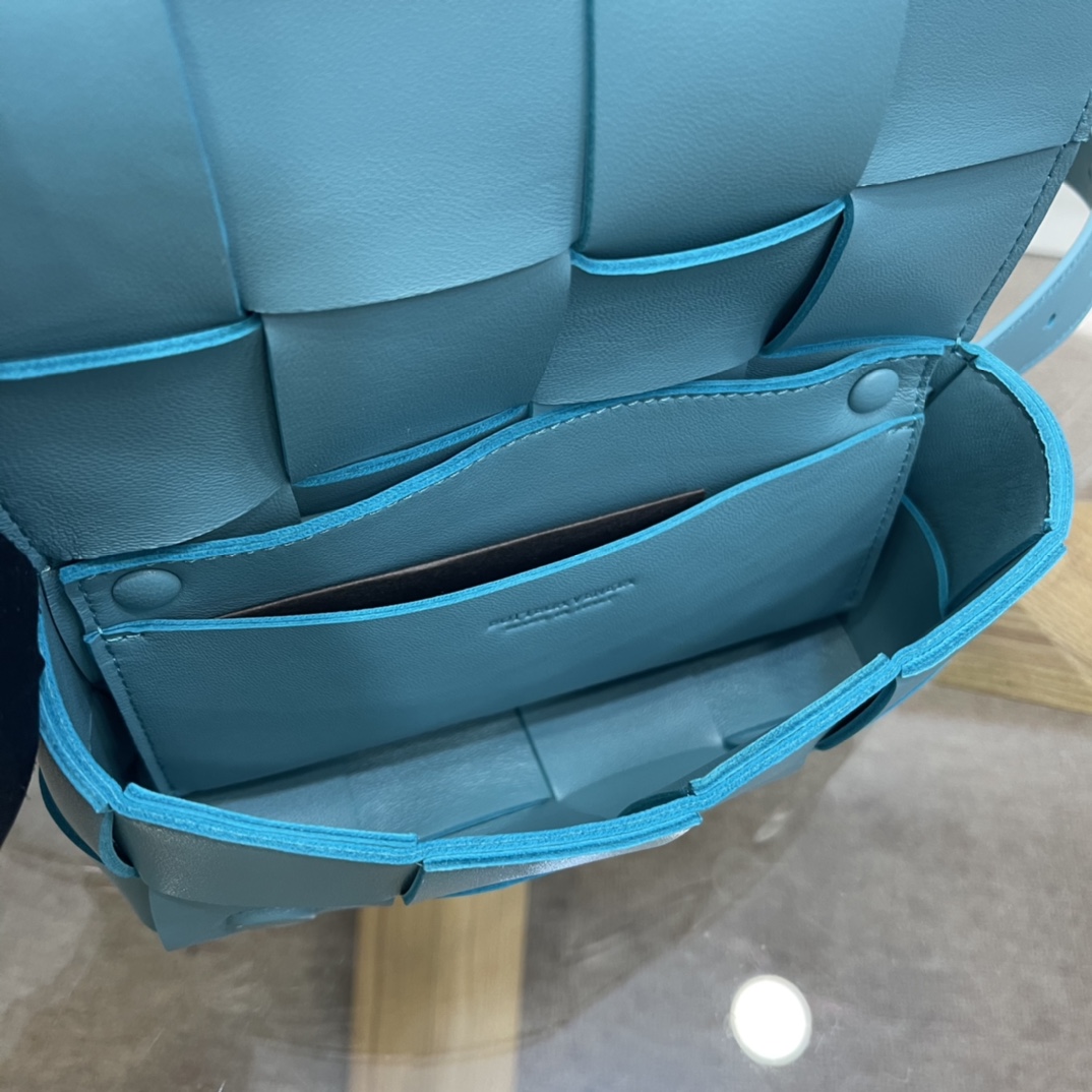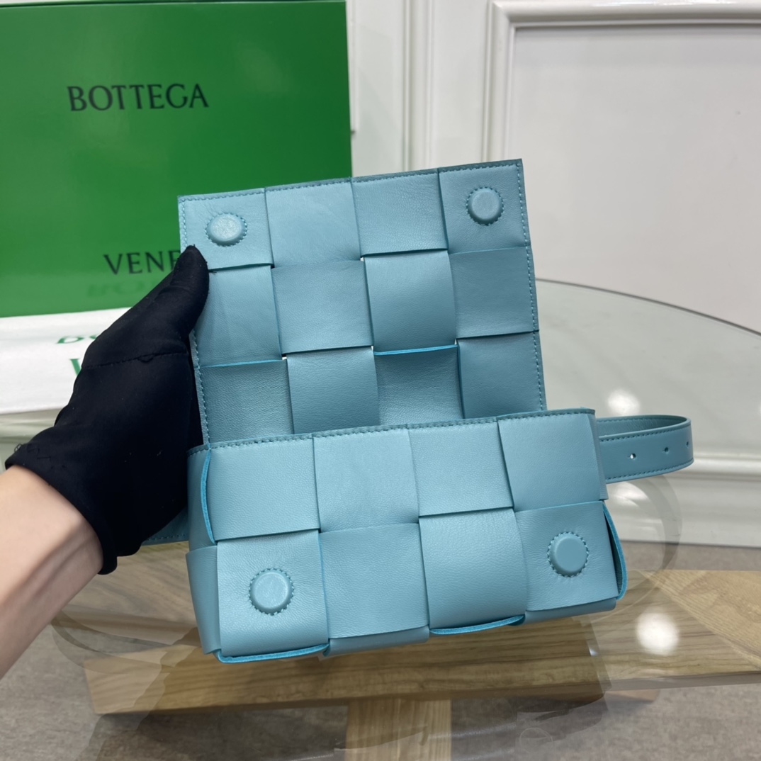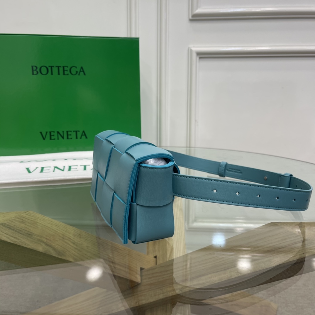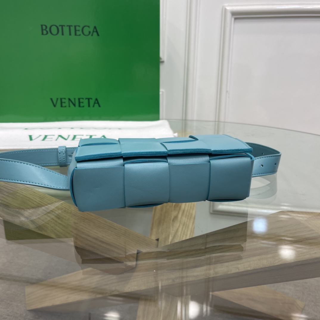 Cassette belt bag in Intrecciato Nappa leather One interior flat pocket Adjustable belt with 15 holes and a pin fastening Magnetic closure Nappa interior
