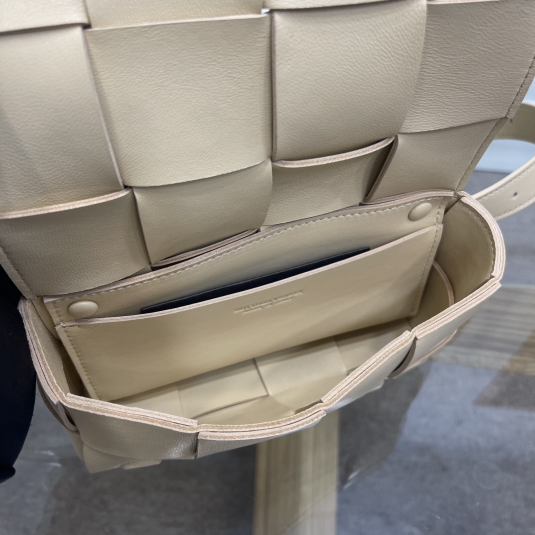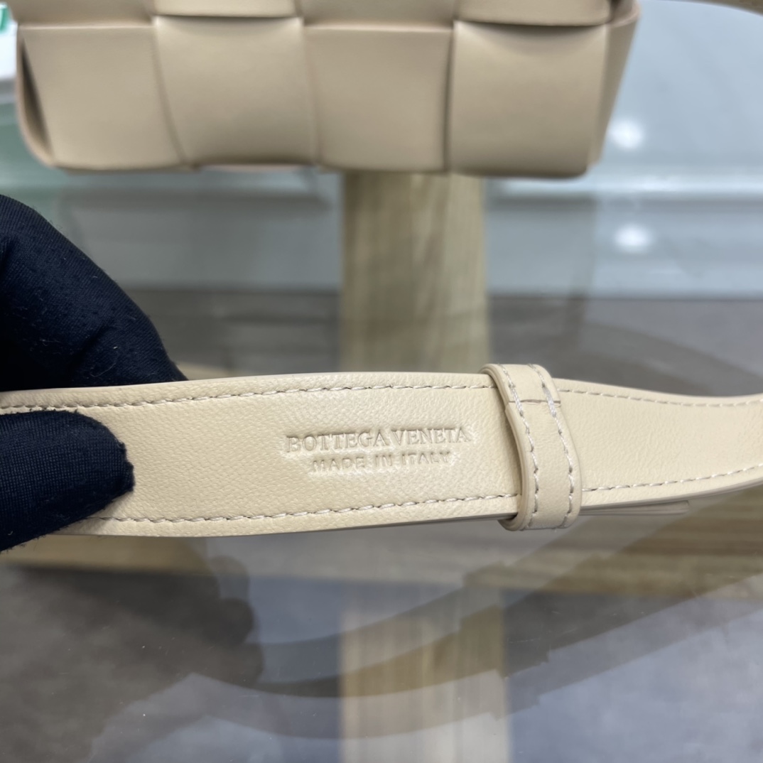 Cassette belt bag in Intrecciato Nappa leather One interior flat pocket Adjustable belt with 15 holes and a pin fastening Magnetic closure Nappa interior