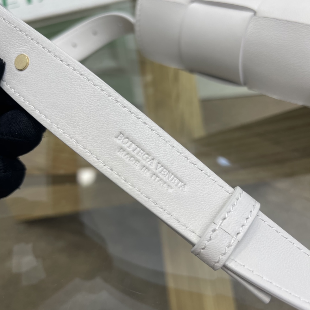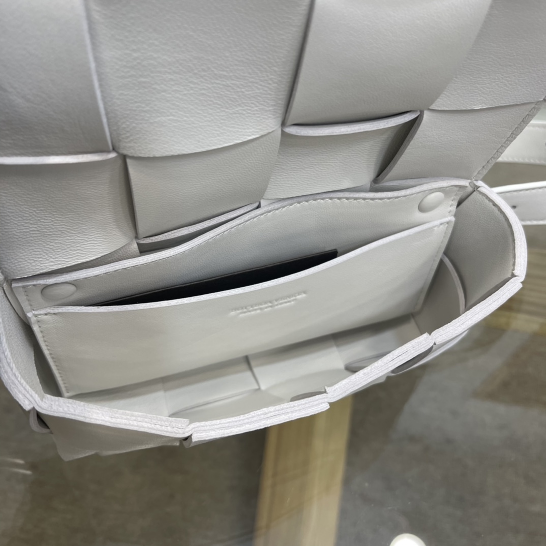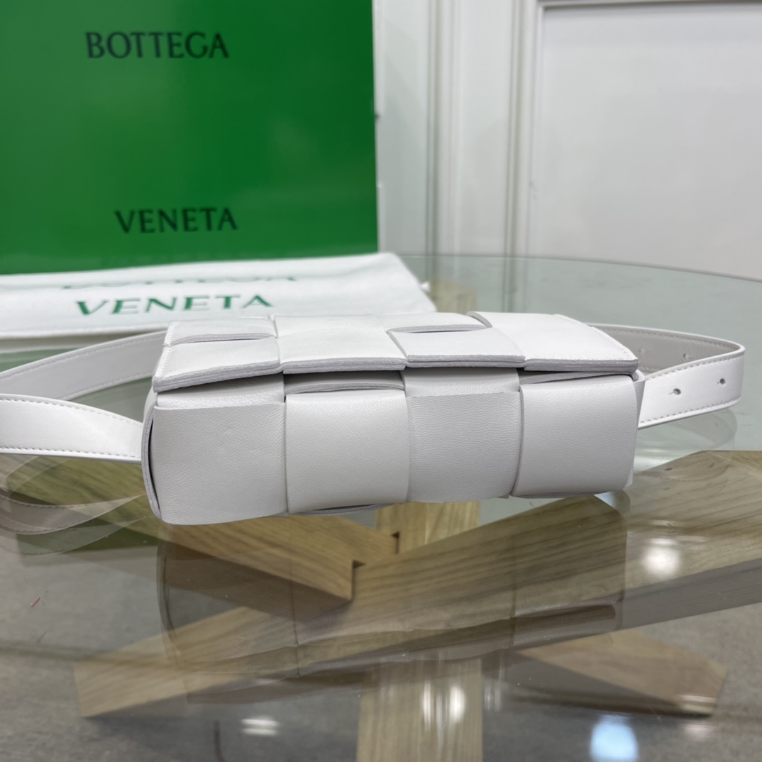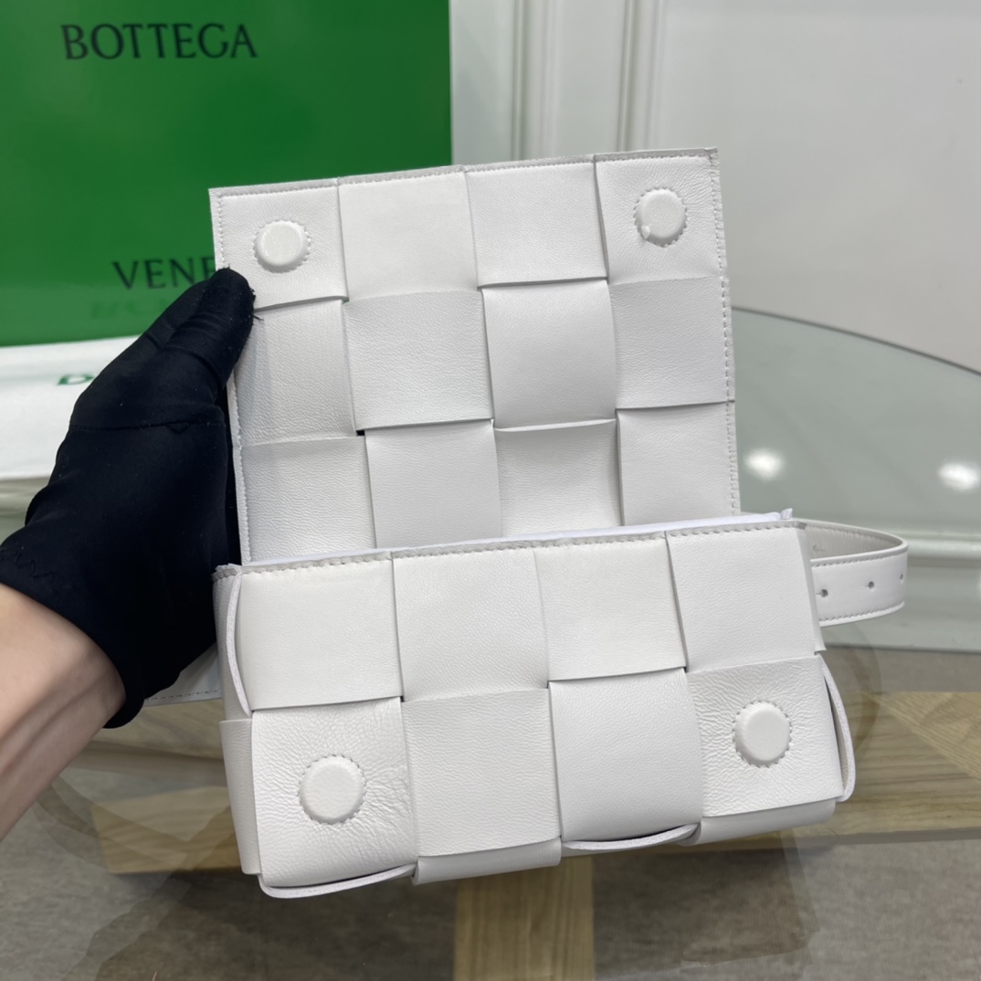 Cassette belt bag in Intrecciato Nappa leather One interior flat pocket Adjustable belt with 15 holes and a pin fastening Magnetic closure Nappa interior