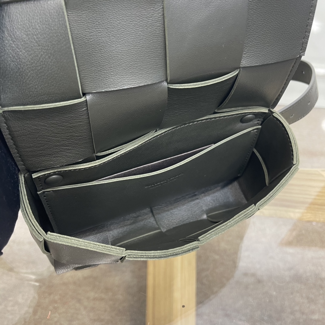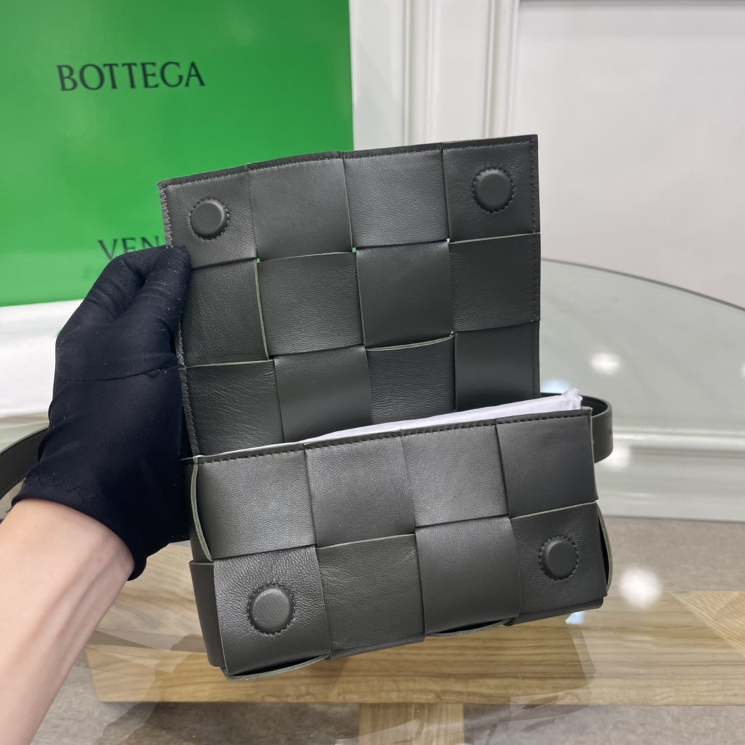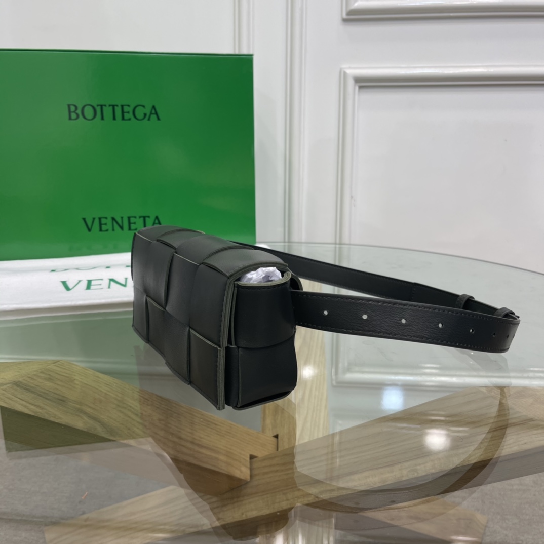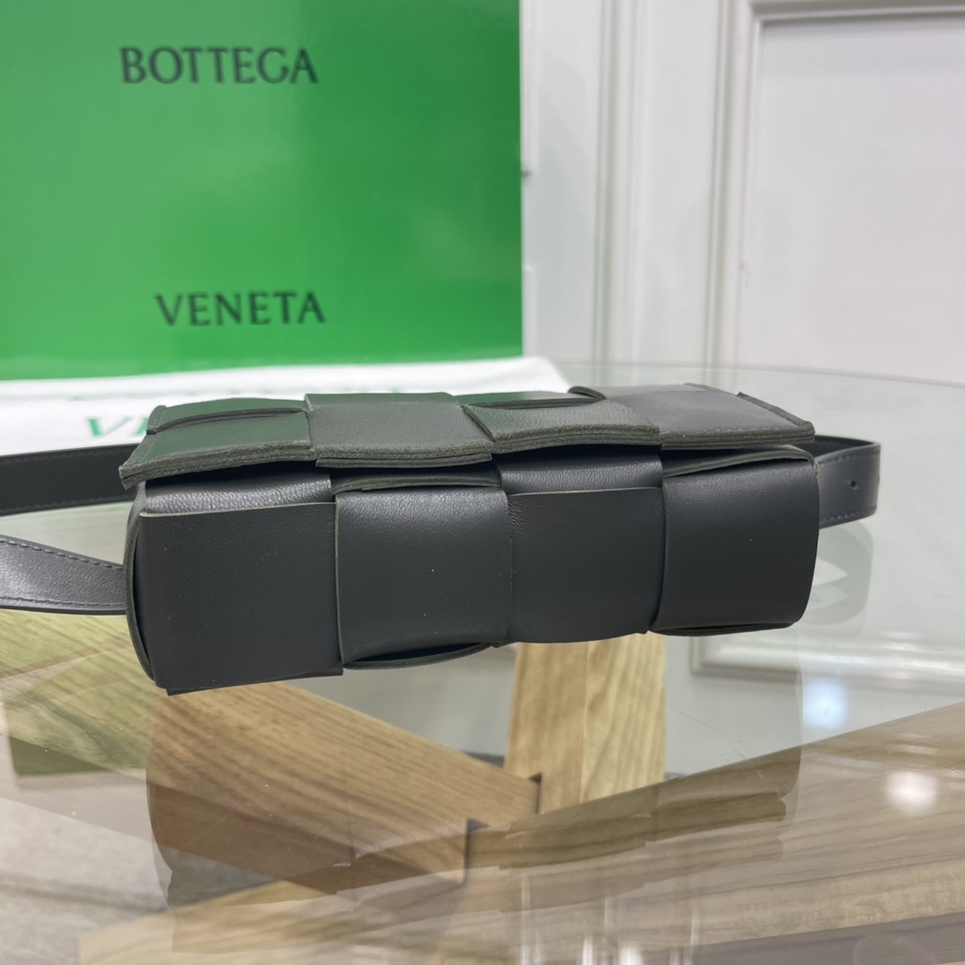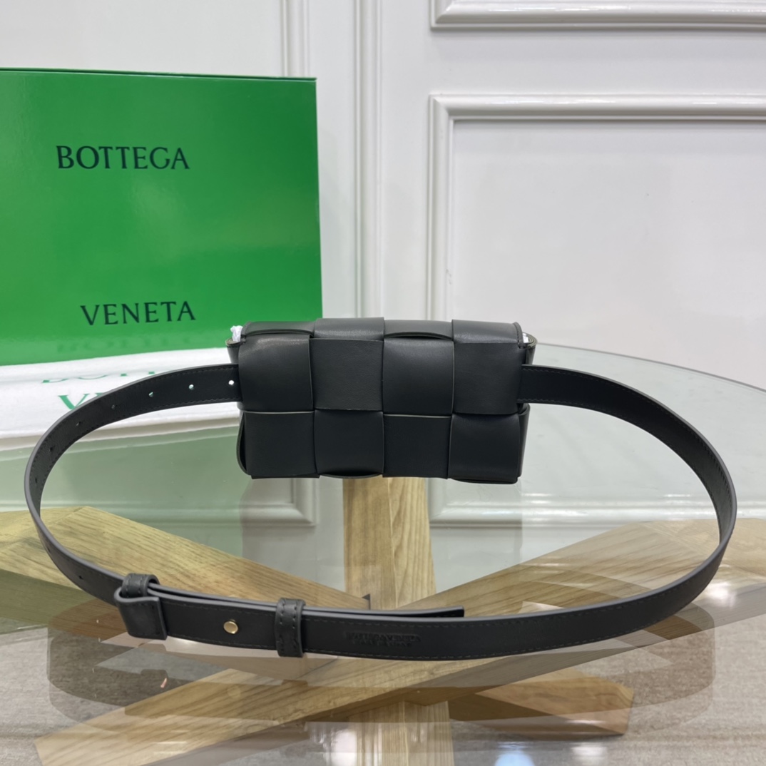 Cassette belt bag in Intrecciato Nappa leather One interior flat pocket Adjustable belt with 15 holes and a pin fastening Magnetic closure Nappa interior