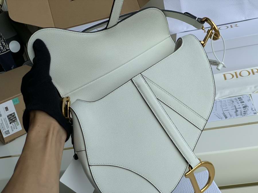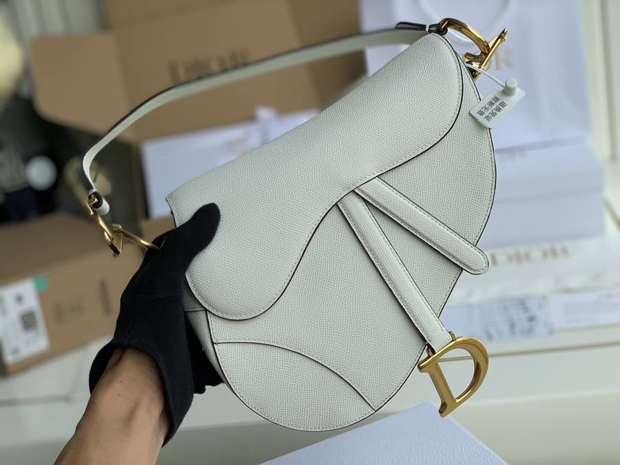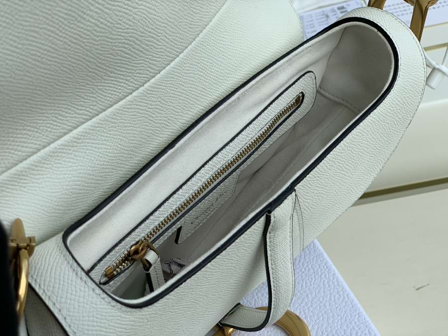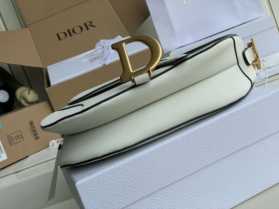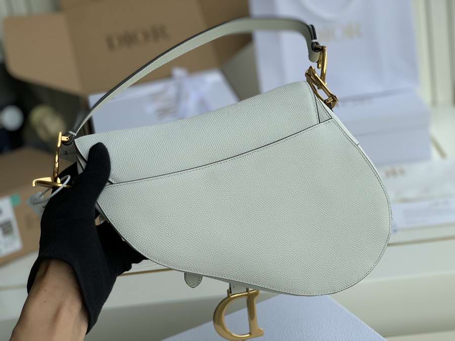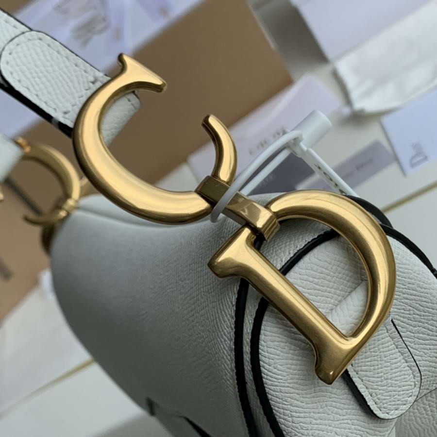 Maria Grazia Chiuri brings a fresh update to the iconic Saddle bag. The heritage design showcases the emblematic 'D'-stirrup magnetic clasp and Saddle flap with the signature 'CD' structure on both sides of the handle. Crafted in white grained calfskin and embellished with antique gold-finish metal hardware, the modern style may be customized with alternative straps.