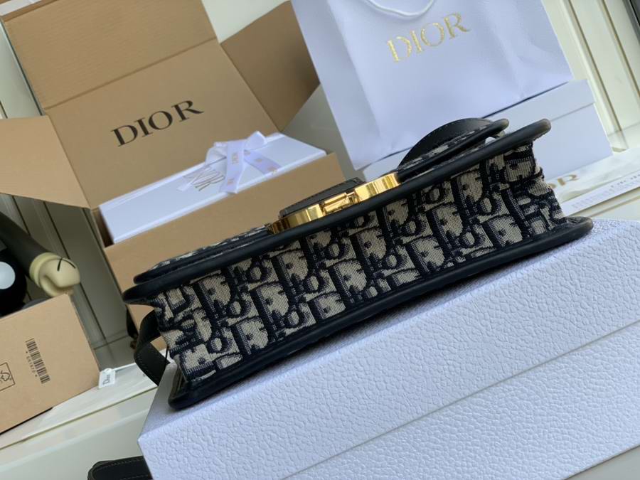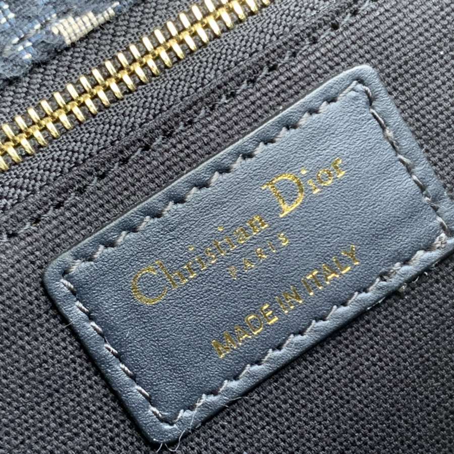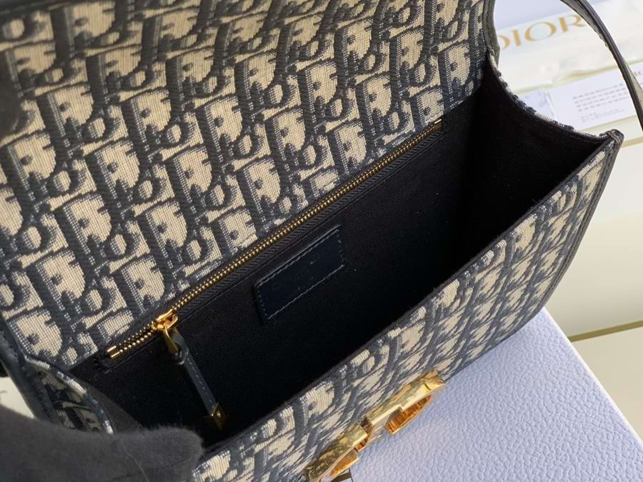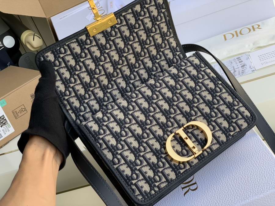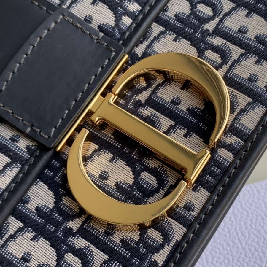 The 30 Montaigne line, inspired by the historic, emblematic address, presents essential pieces that portray the iconic codes of the House. The handbag is crafted in blue Dior Oblique jacquard for an elegant and timeless look. The flap is embellished with an antique gold-finish metal 'CD' clasp. Refined details such as an embossed '30 Montaigne' signature on the back and the softer calfskin sides spotlight the sleek, meticulous design.