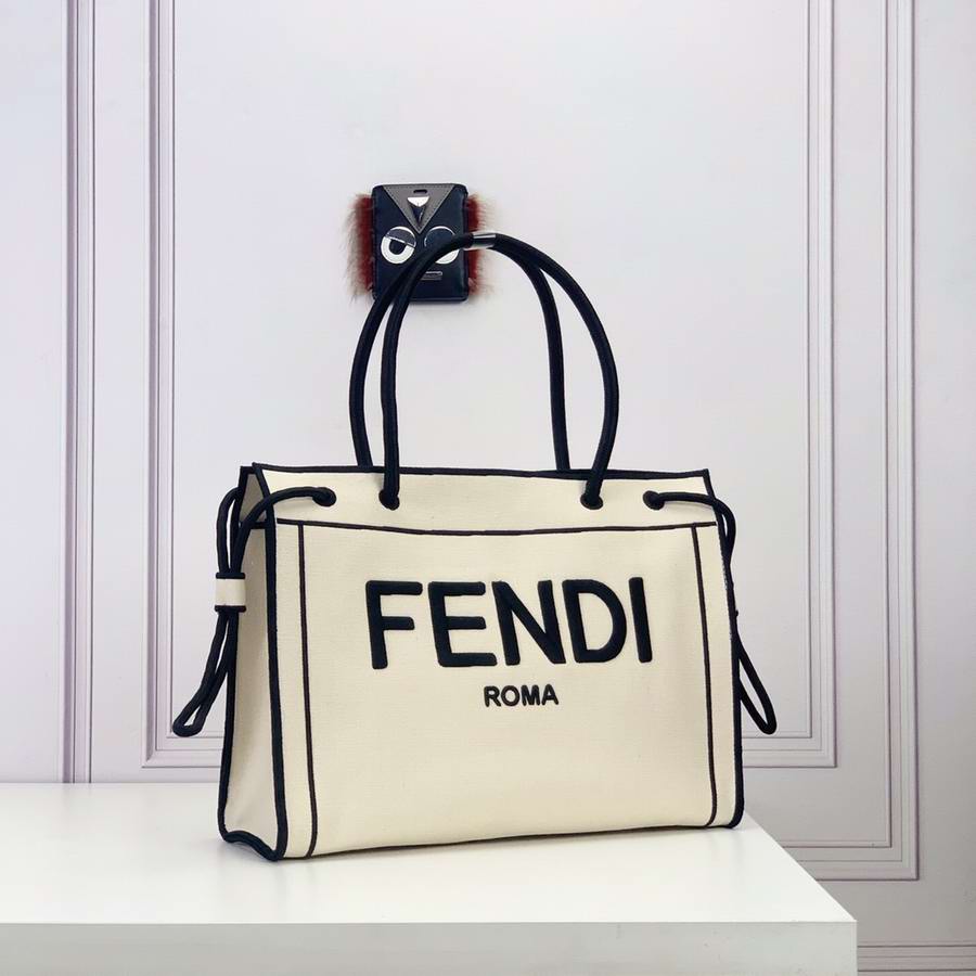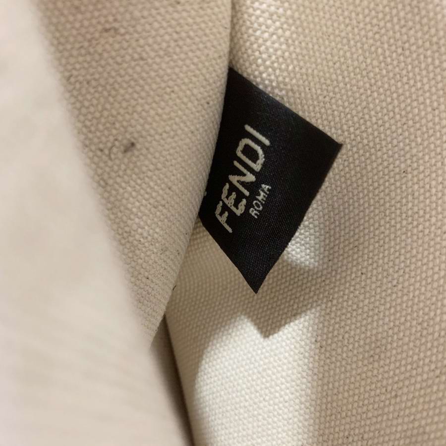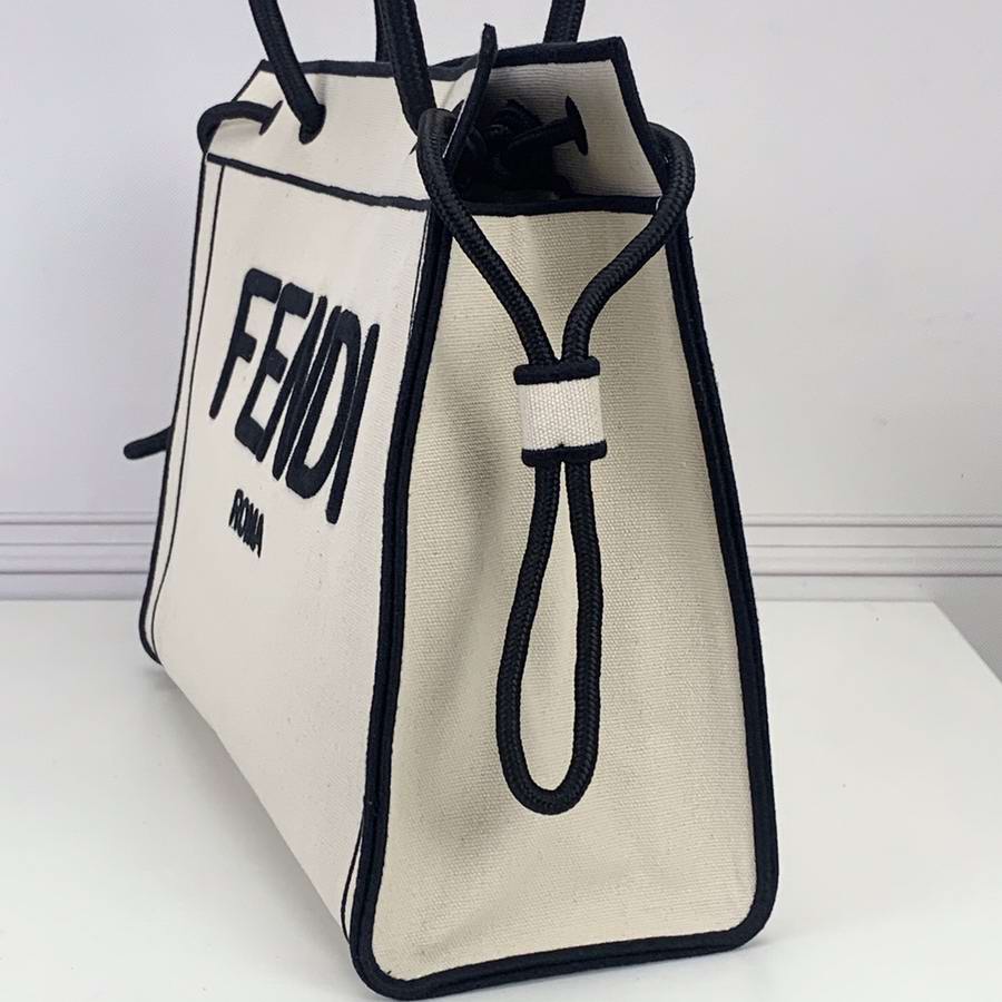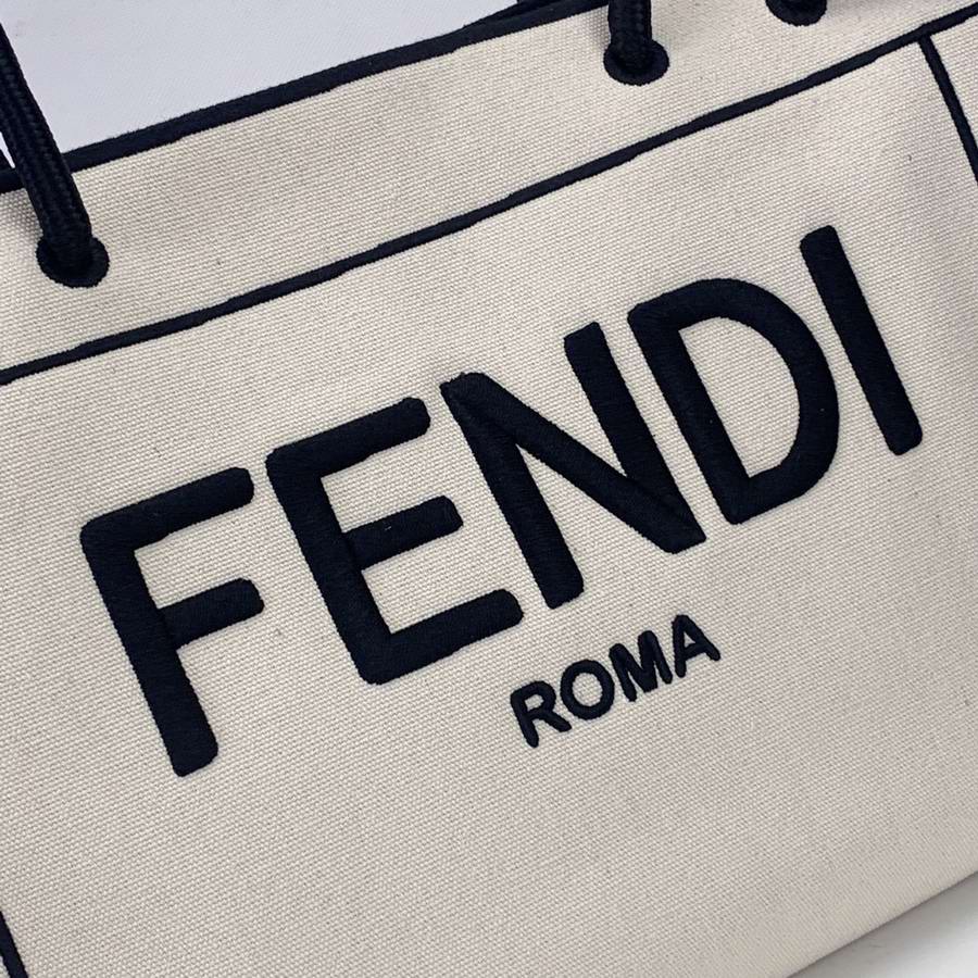 FENDI ROMA Shopper bag, size medium, made of natural color fabric, finished with edges and ?�FENDI ROMA?� lettering embroidered in contrasting black thread. Featuring a spacious unlined compartment with pockets. Can be carried by hand thanks to the two black rope handles.