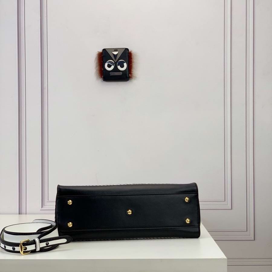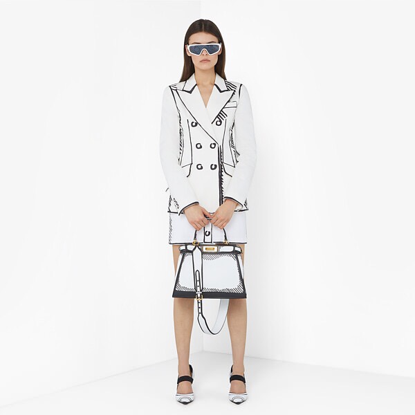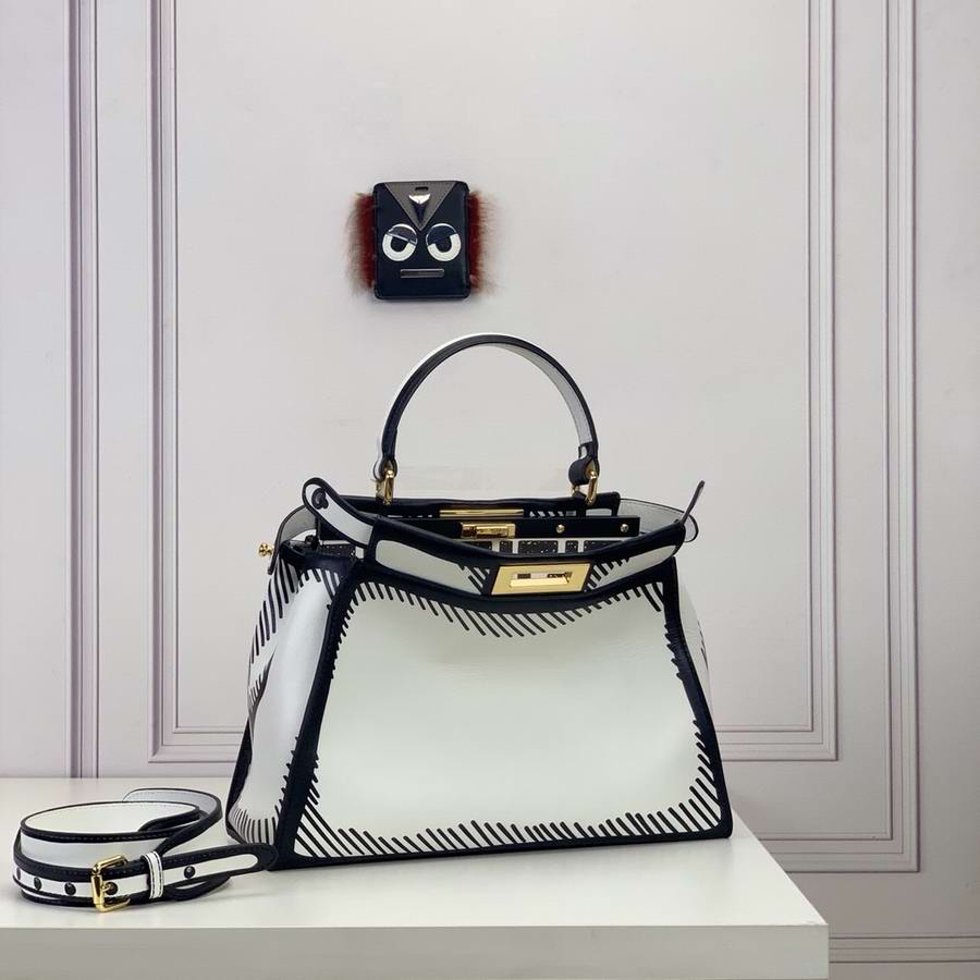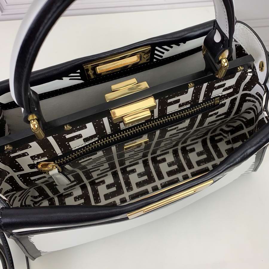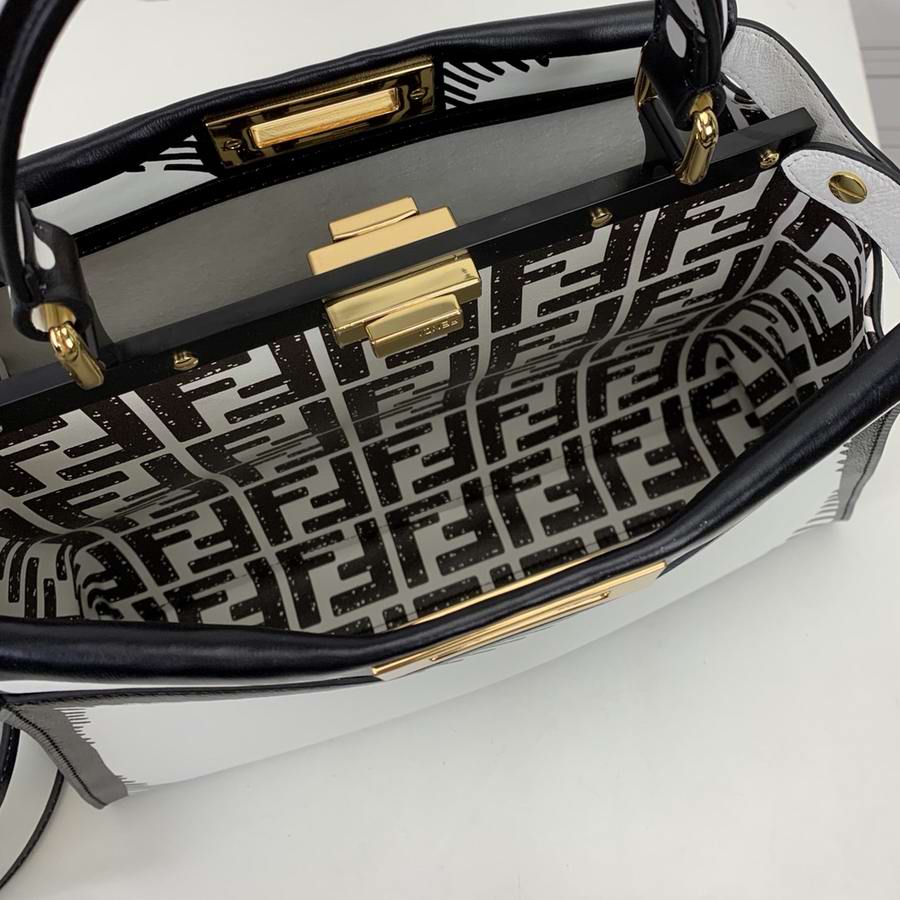 Iconica borsa Peekaboo misura media, realizzata in pelle color bianco e decorata con l'iconica chiusura a girello su entrambi i lati. Dotata di interni rifiniti in tessuto bianco con ricamo FF a contrasto di color nero, due scompartimenti interni divisi da una tramezza rigida, una tasca interna con zip, accessori metallici con finitura dorata. Pu?� essere portata a mano, a spalla o cross-body grazie al manico e alla tracolla regolabile e rimovibile.