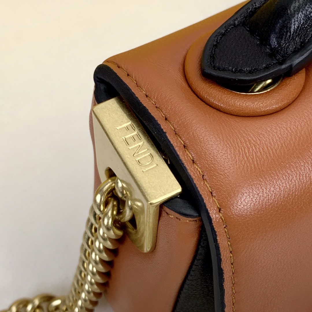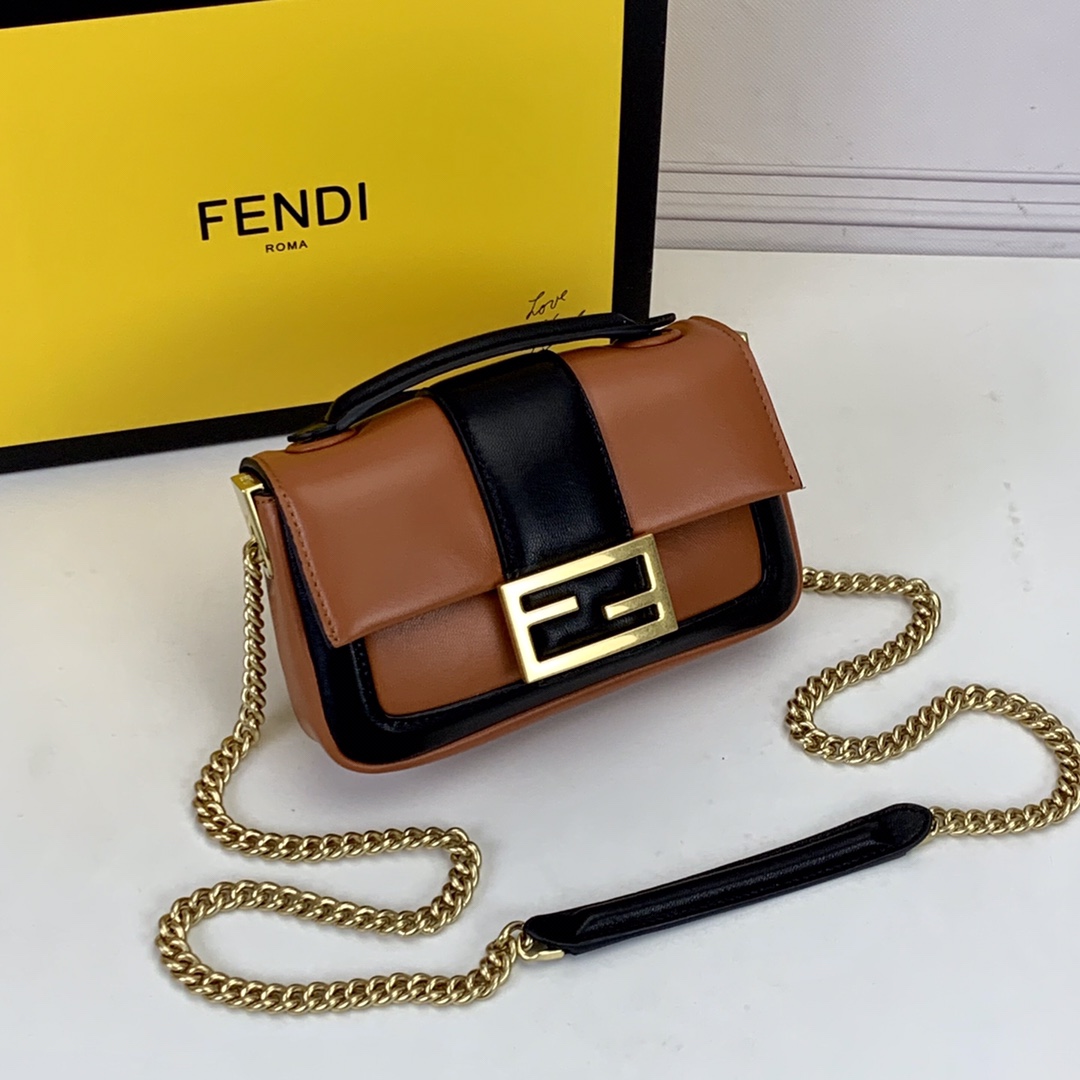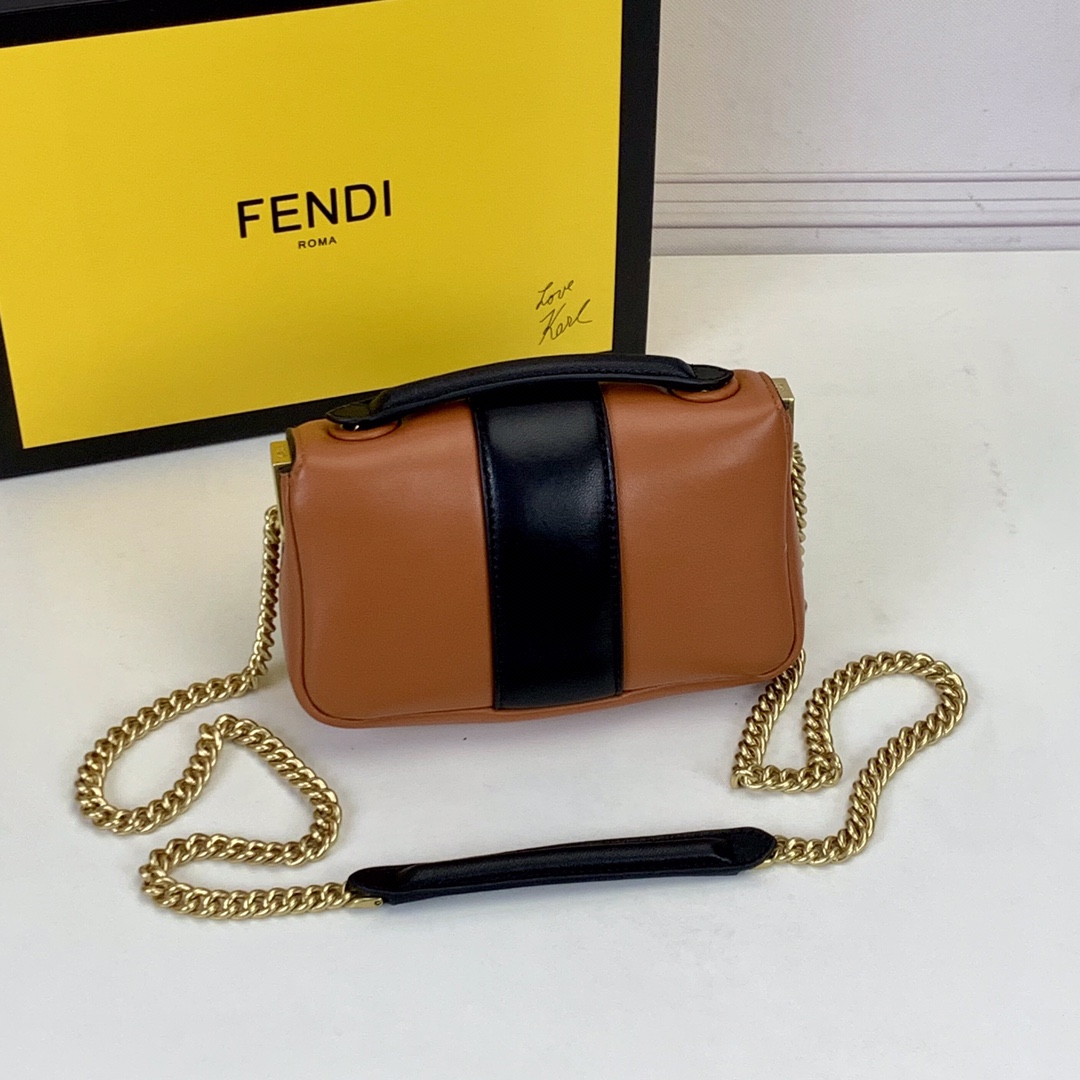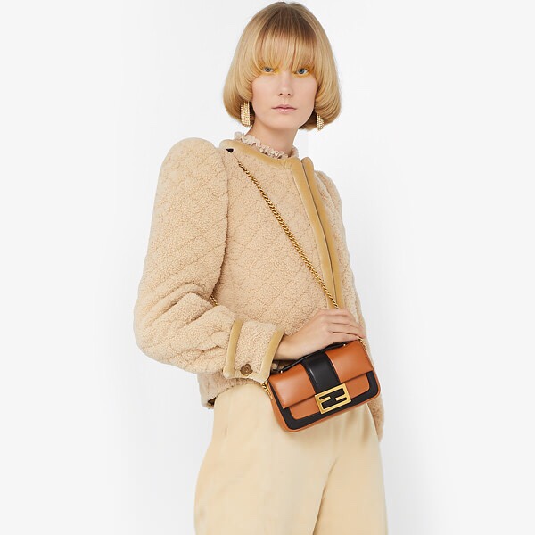 Baguette mini-bag with sliding chain made from brown nappa leather finished with black nappa leather details. Decorated with an FF clasp.