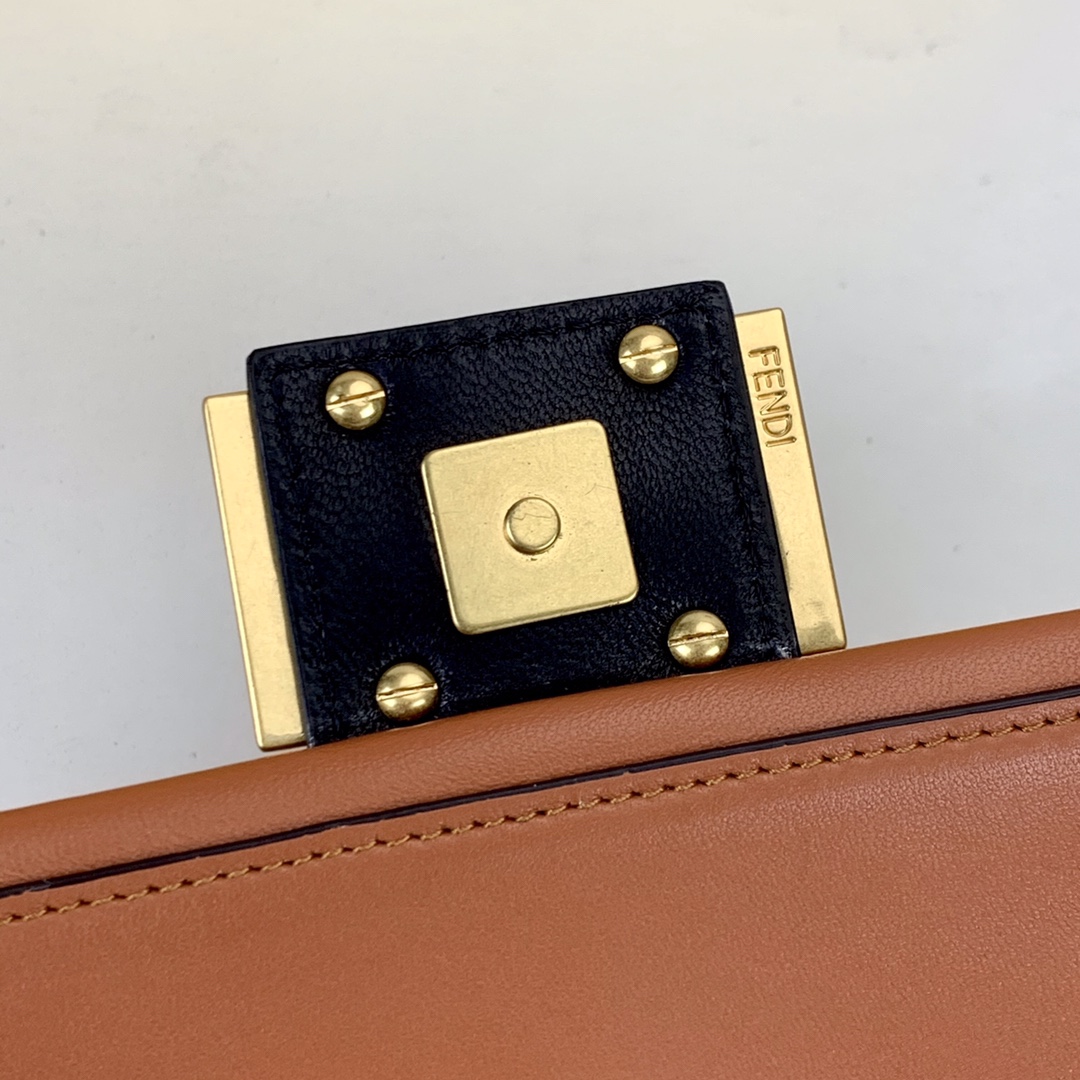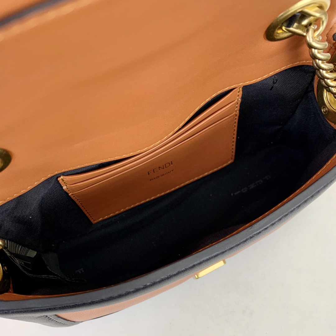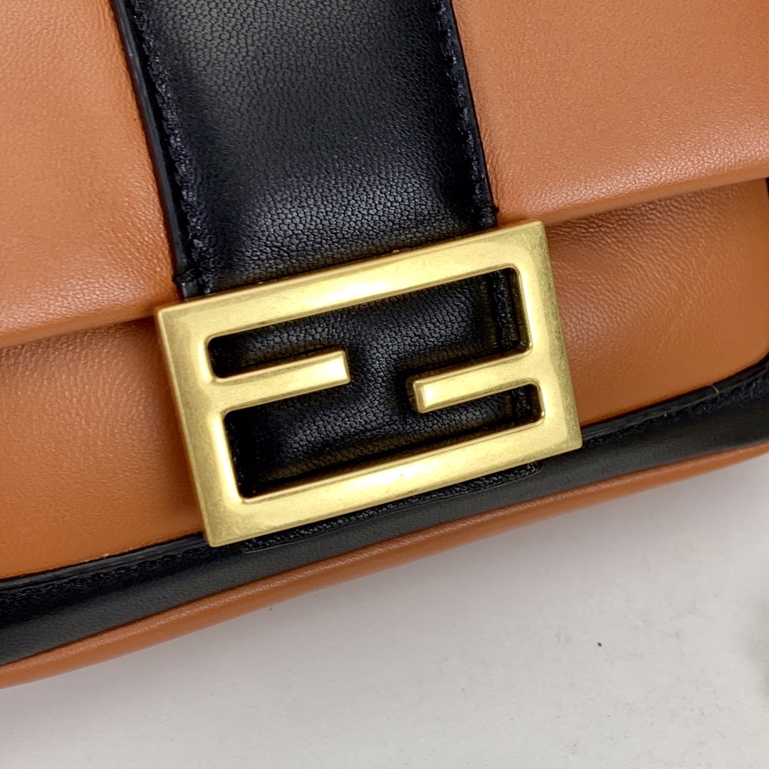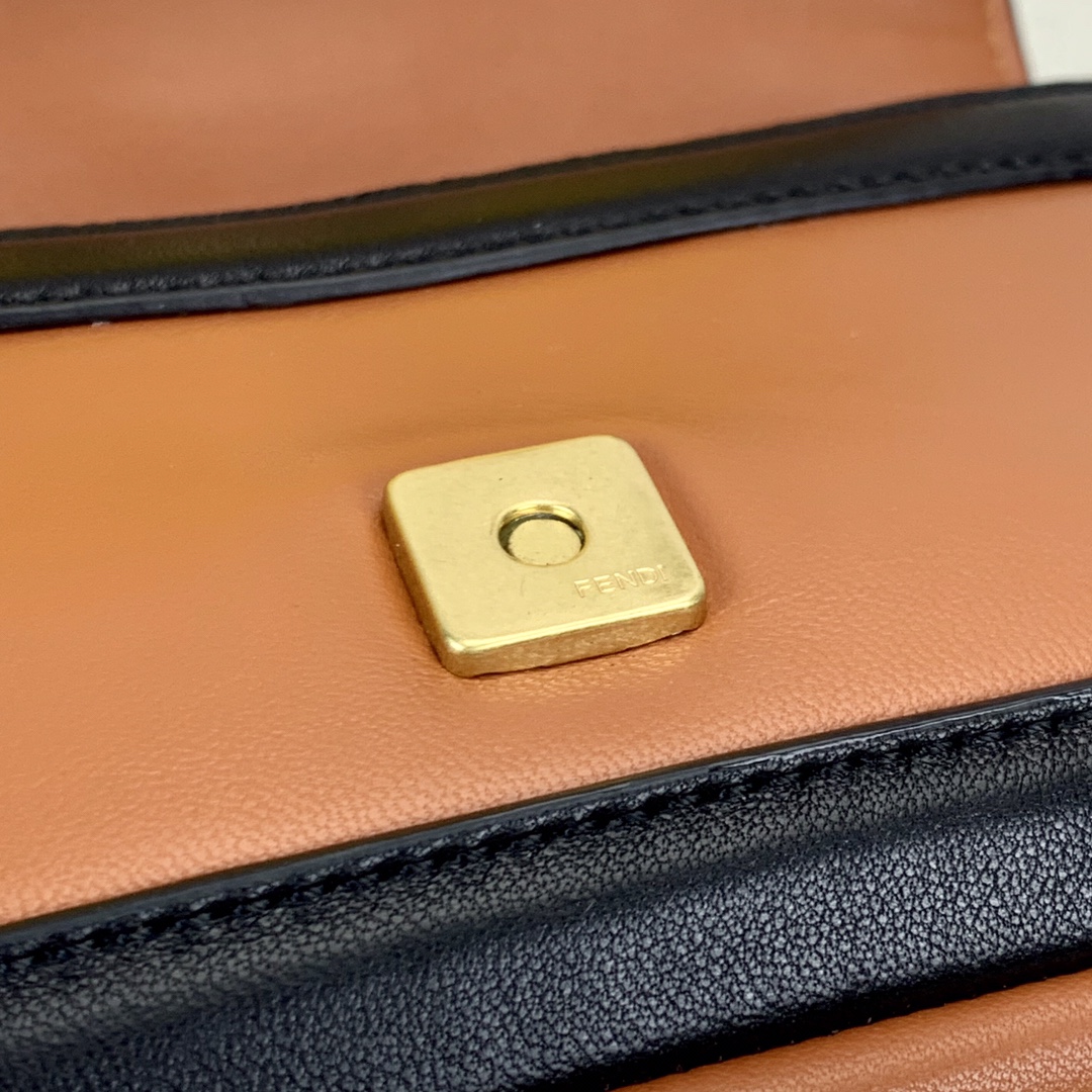 Baguette mini-bag with sliding chain made from brown nappa leather finished with black nappa leather details. Decorated with an FF clasp.