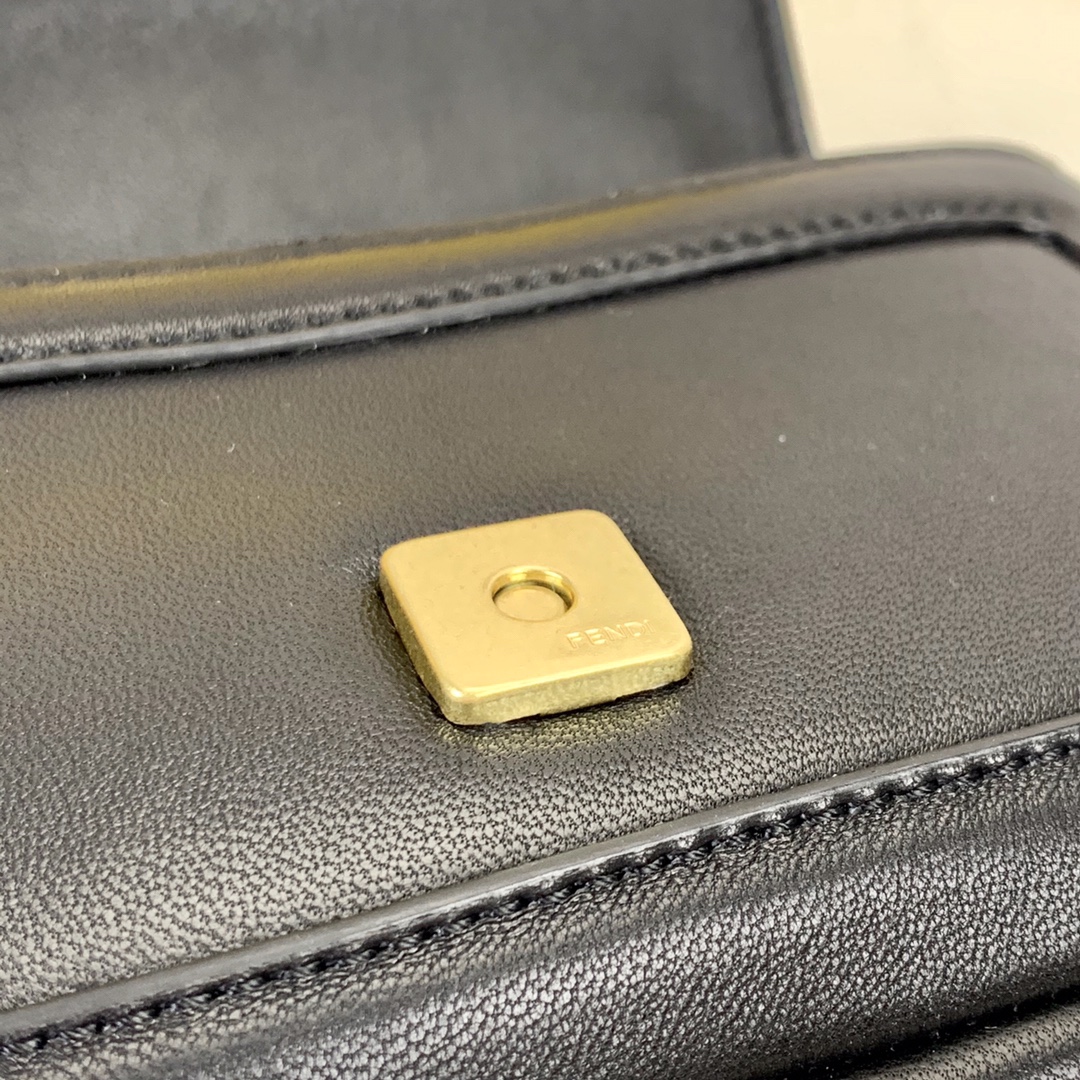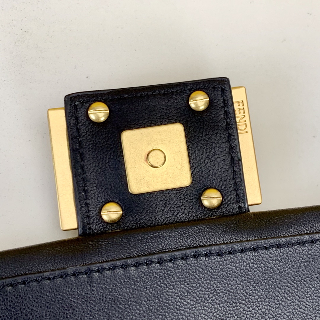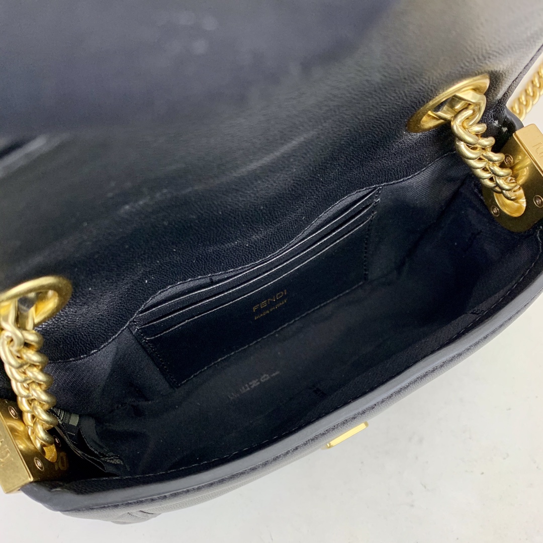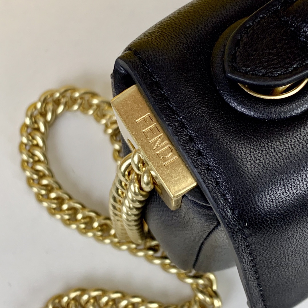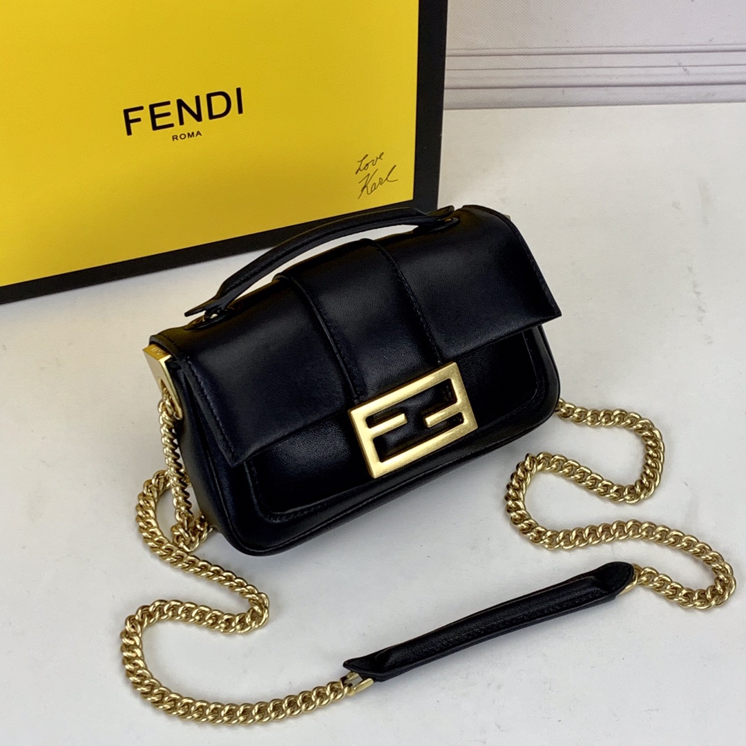 Mini Baguette bag, made of soft, black nappa leather with sliding chain and decorated with an FF clasp.