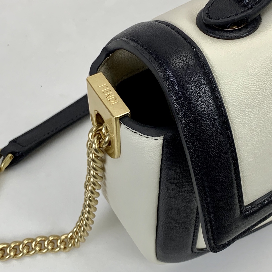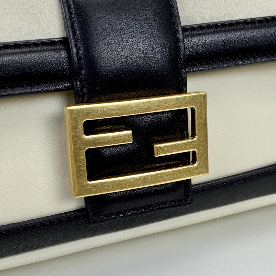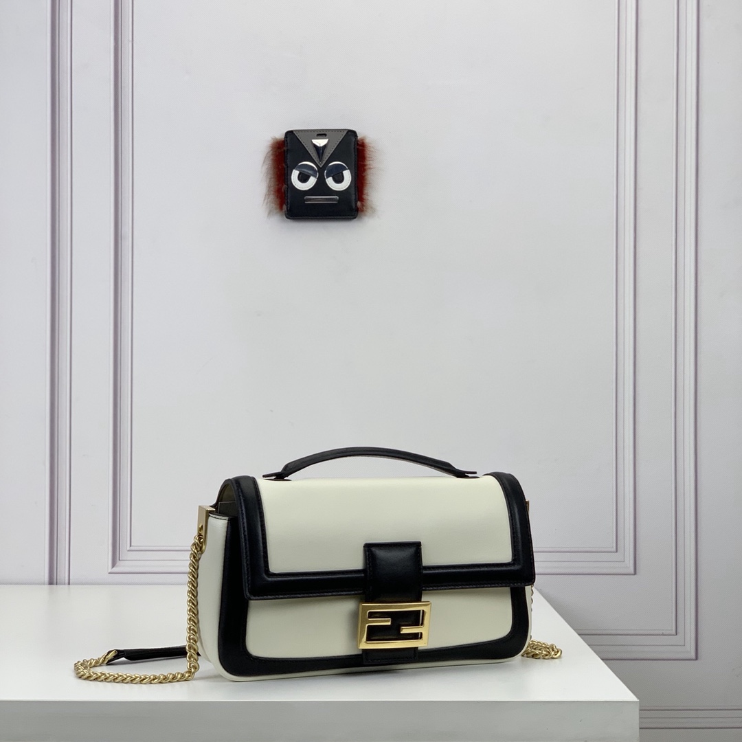 Baguette bag with sliding chain made from soft white nappa leather, finished with black nappa leather trims and details. Decorated with an FF clasp.