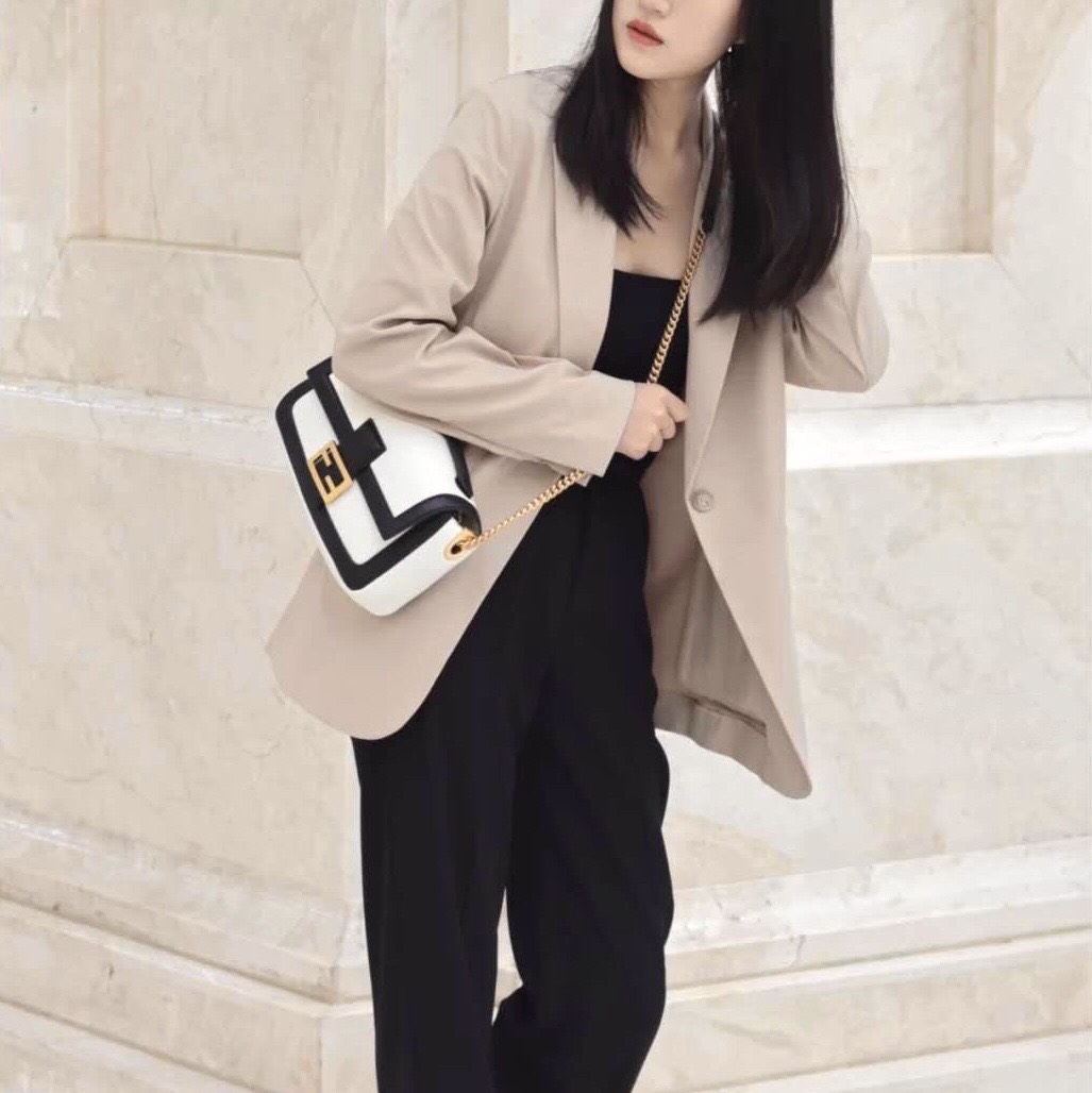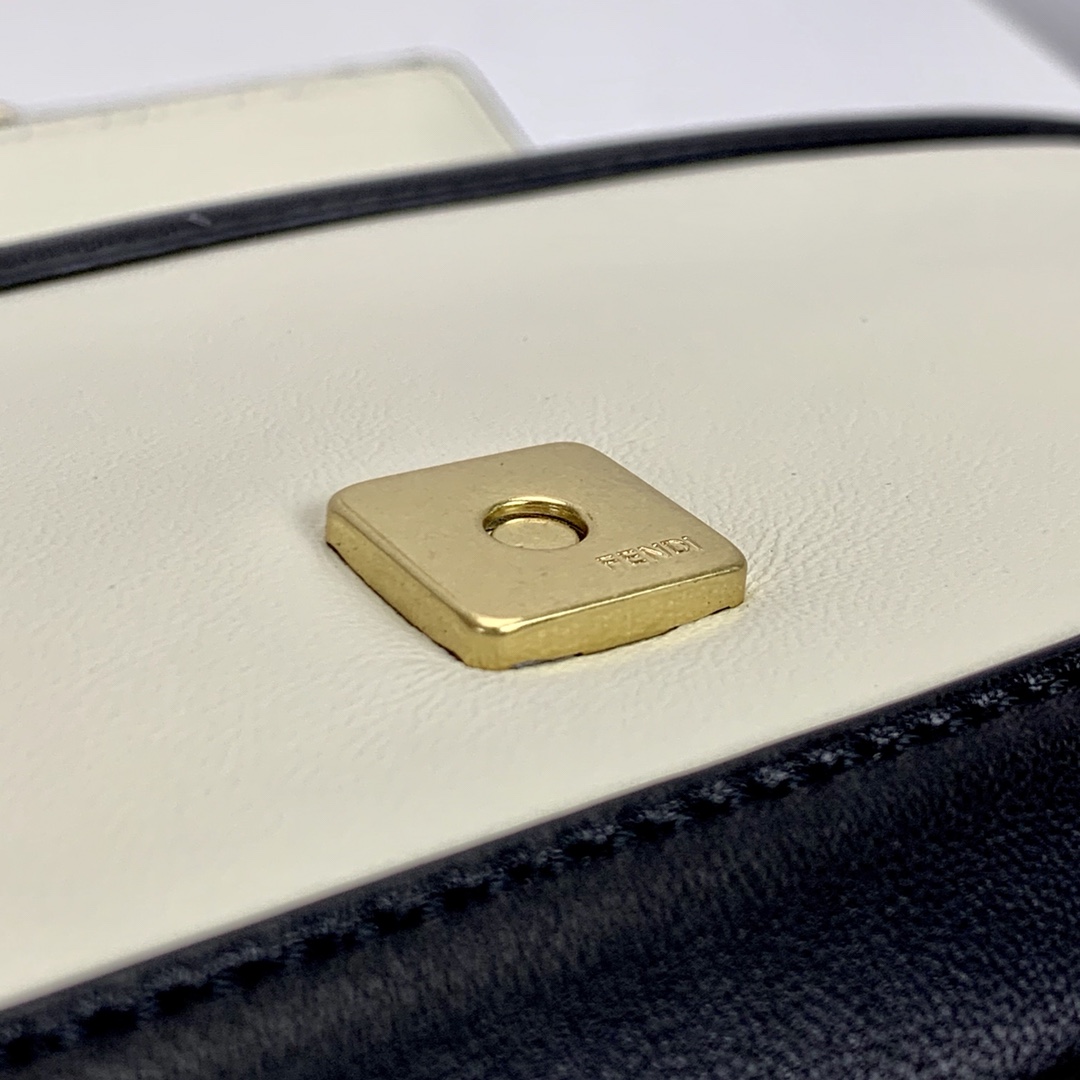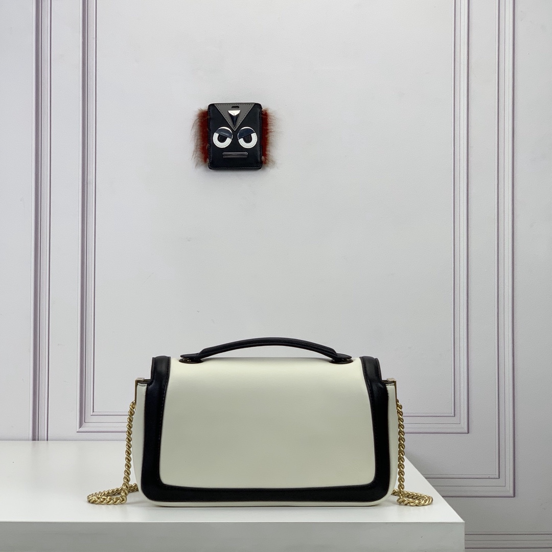 Baguette bag with sliding chain made from soft white nappa leather, finished with black nappa leather trims and details. Decorated with an FF clasp.