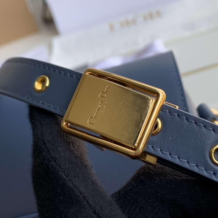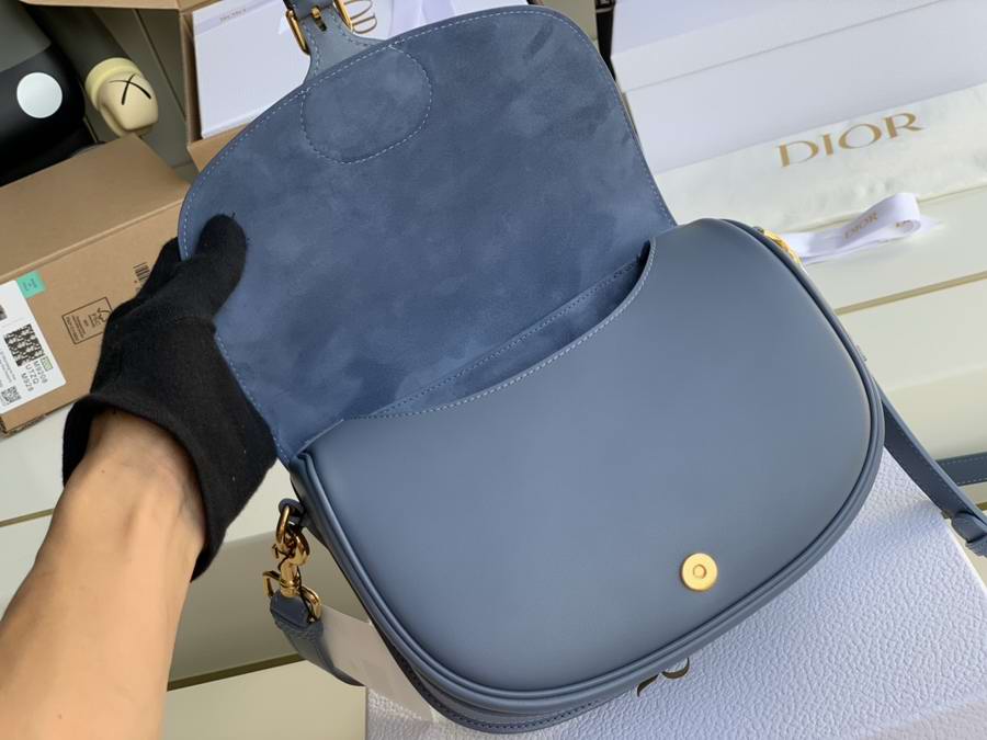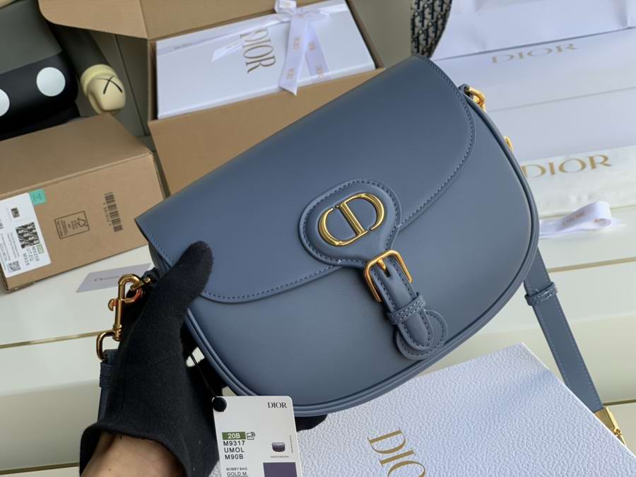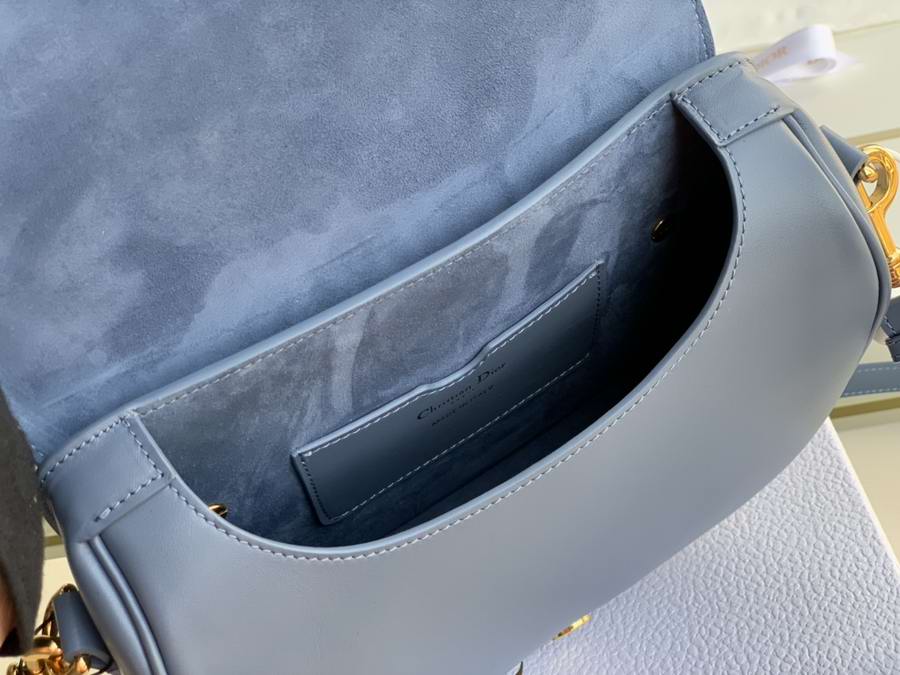 The Dior Bobby is a hobo style showcasing sophisticated lines and harmonious proportions. This medium style is crafted from cloud blue box calfskin with a flexible suede calfskin interior, and is enhanced by antique gold-finish metal hardware. Its removable and adjustable shoulder strap has a military-inspired buckle and allows it to be carried by hand, worn over the shoulder or crossbody.