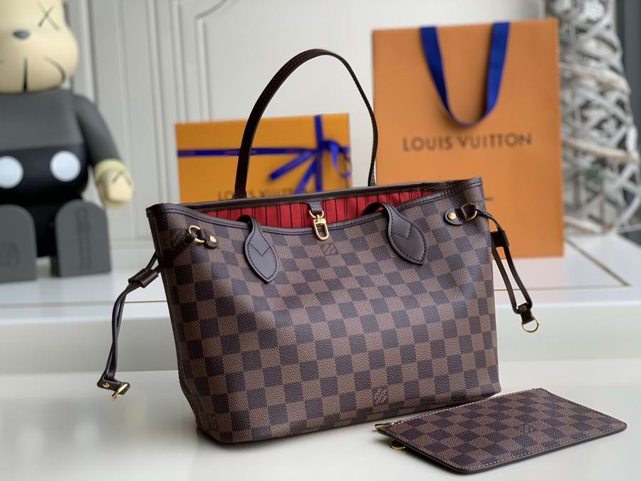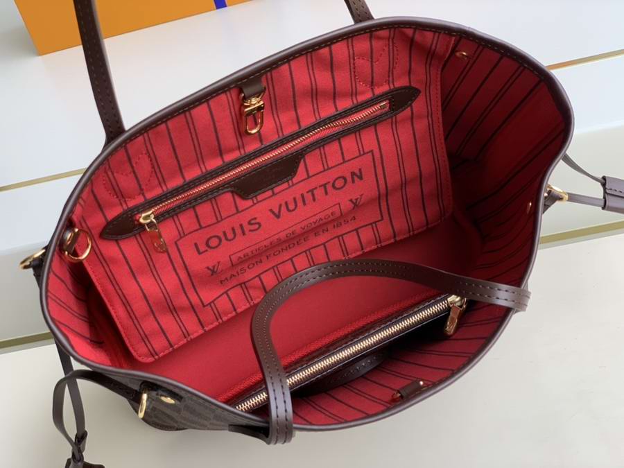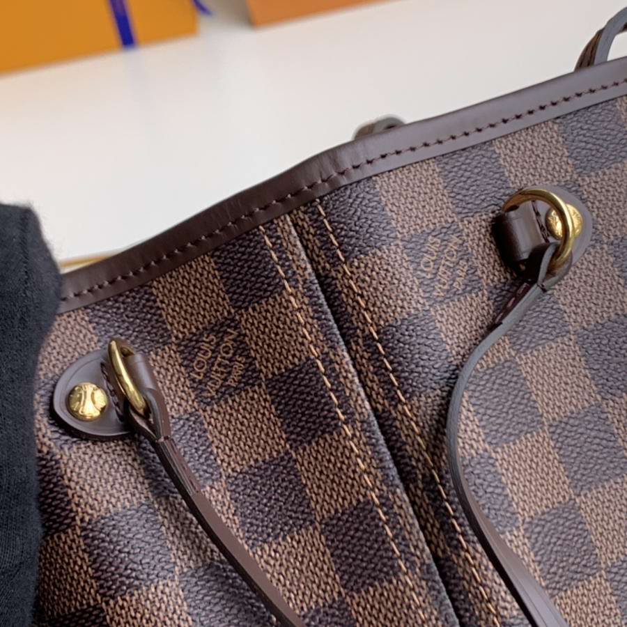 The Neverfull PM tote pairs timeless design with heritage details. Crafted from Damier Eb??ne canvas with natural cowhide trim, it is capacious yet not bulky, with side laces that cinch for a sleek allure or loosen for a casual look. Slim, comfortable handles slip easily over the shoulder or arm. Lined in colourful textile, it features a removable pouch that can be used as a clutch or an extra pocket.