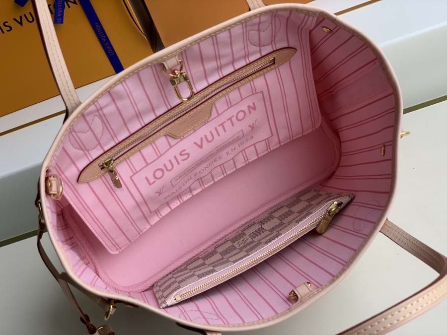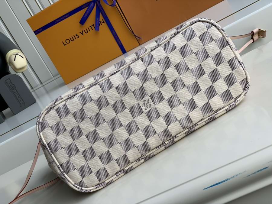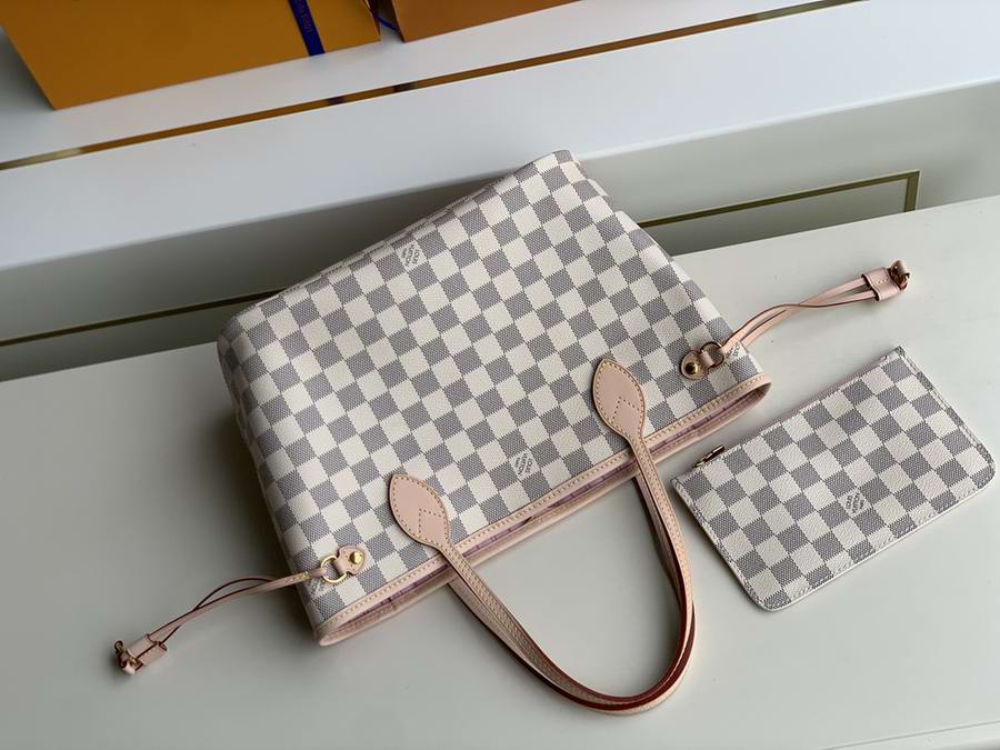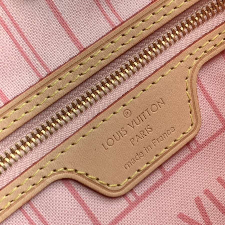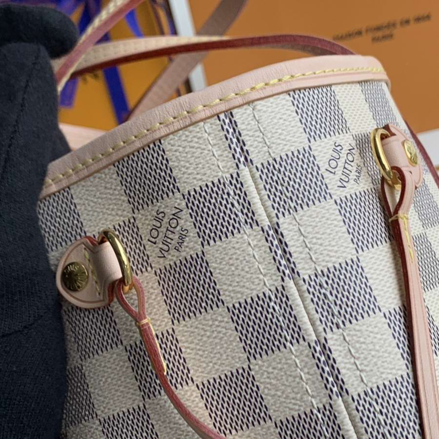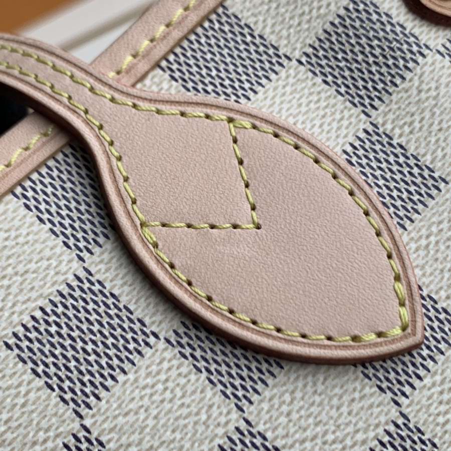 The Neverfull MM tote unites timeless design with heritage details. Made from fresh Damier Azur canvas with natural cowhide trim, it is roomy yet not bulky, with side laces that cinch for a sleek allure or loosen for a casual look. The slim leather handles slip easily over the shoulder or arm. Lined in colourful textile, it features a removable pouch that can be used as a clutch or an extra pocket.