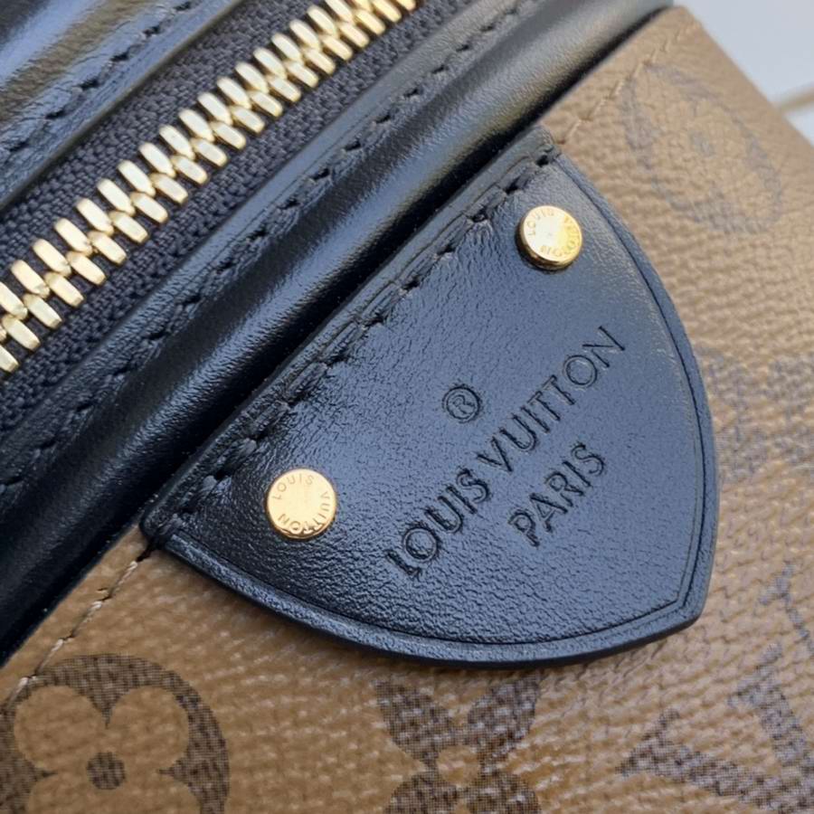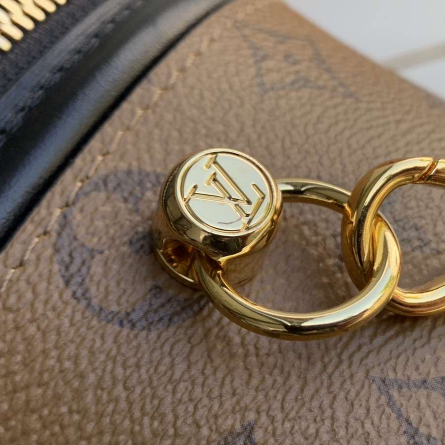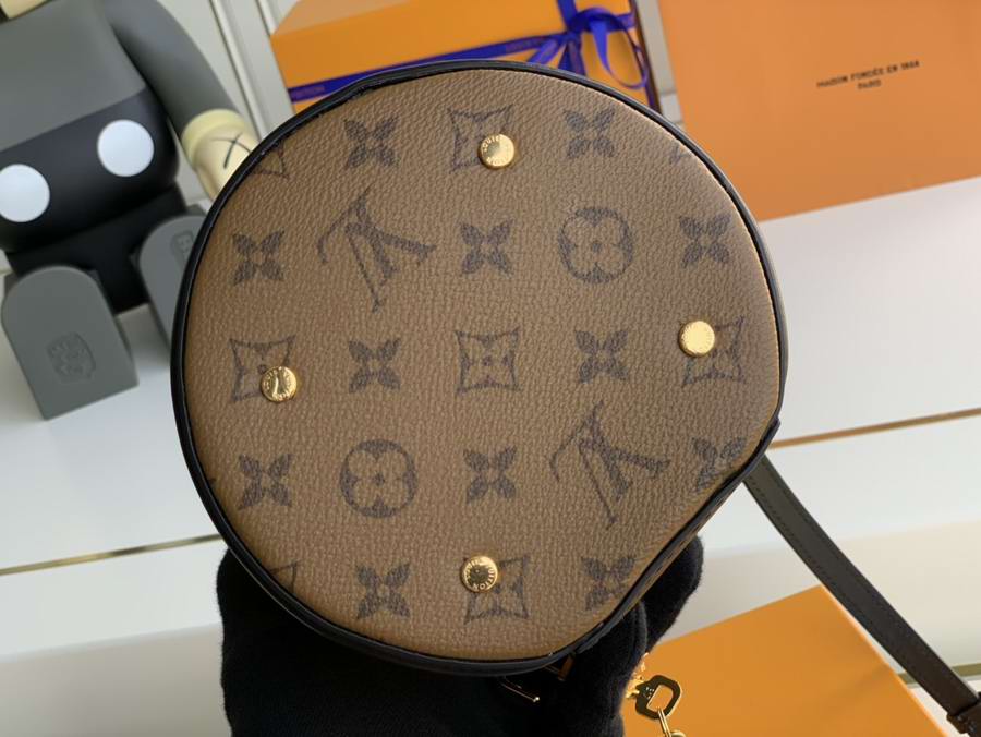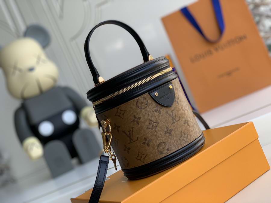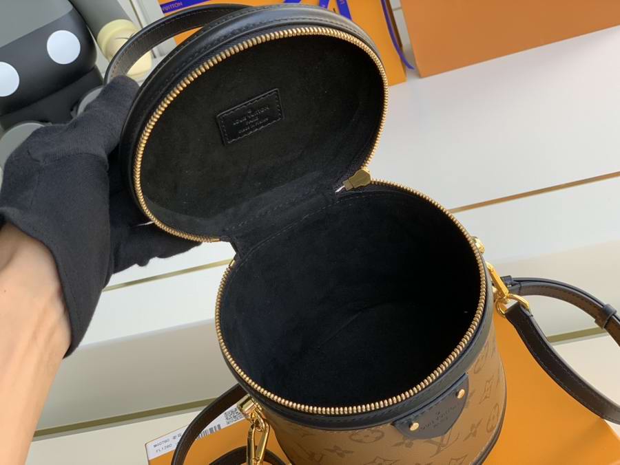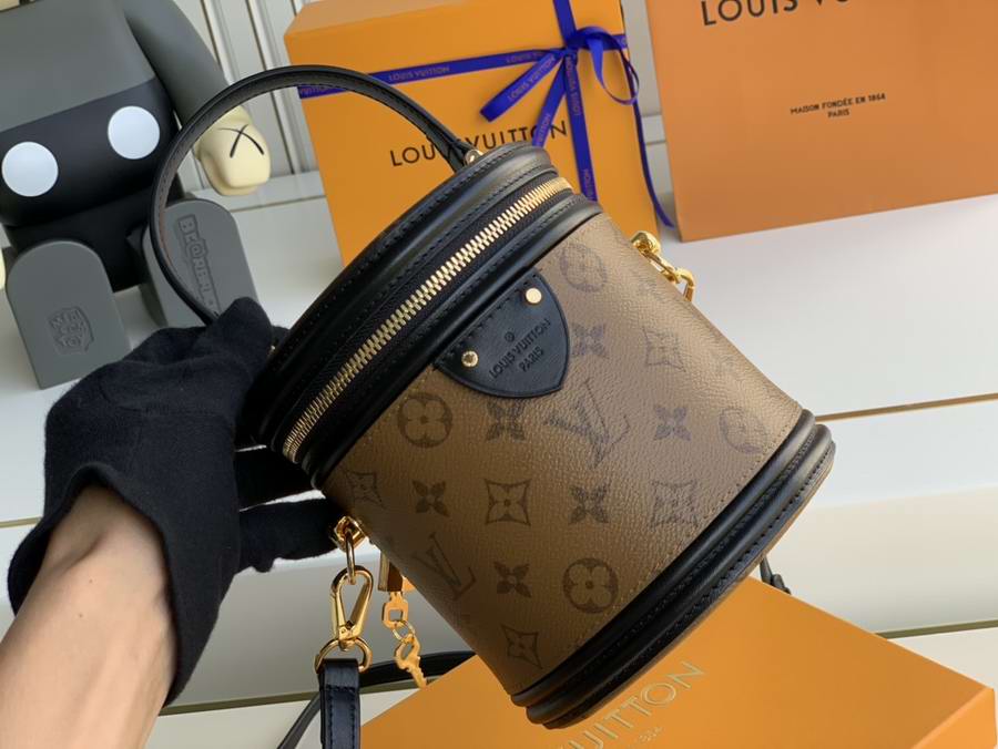 Designer Nicolas Ghesqui??re reworks the classic shape of the LV Cannes beauty case, a masterpiece infused with the House's heritage, to create the Cannes handbag. This petitely proportioned bag is fashioned in Monogram and Monogram Reverse coated canvas. It can be carried in a variety of ways by means of its top handle and a removable leather strap.
