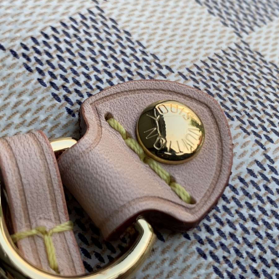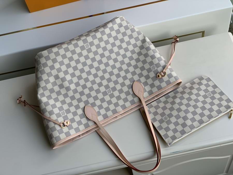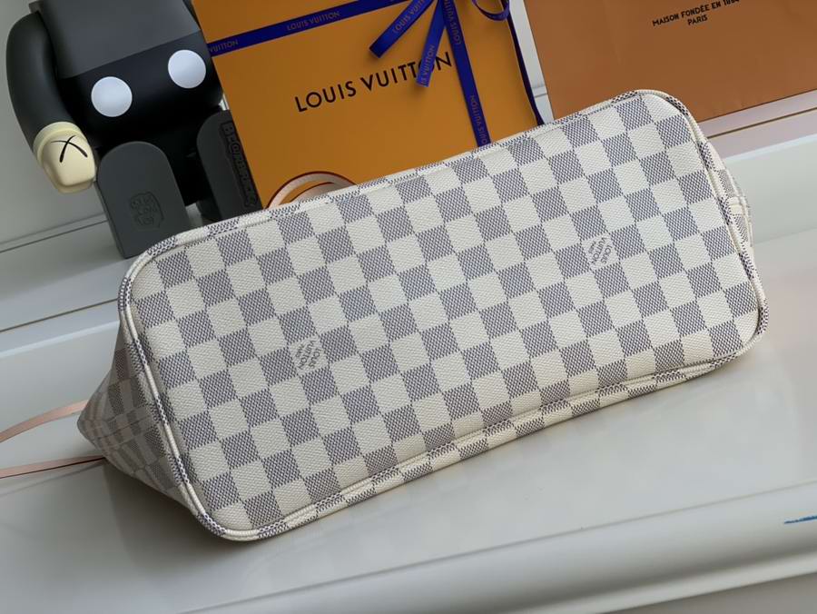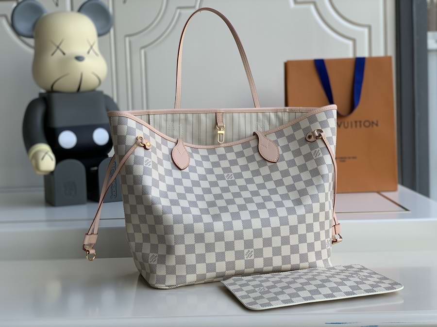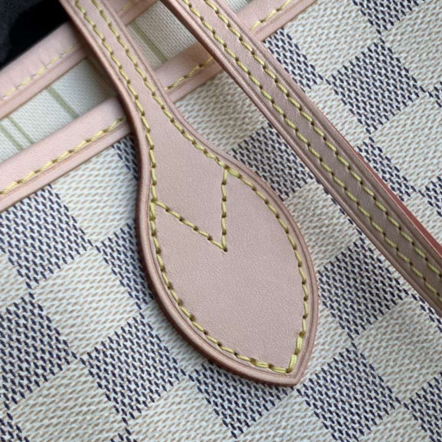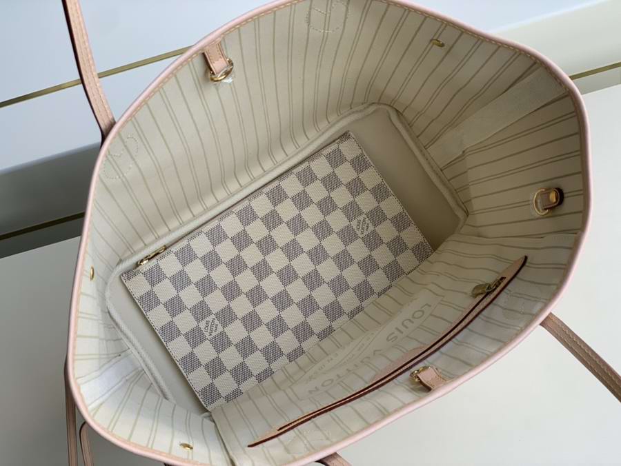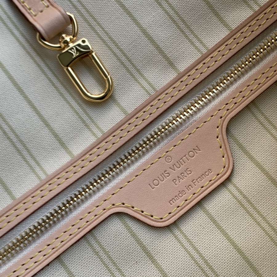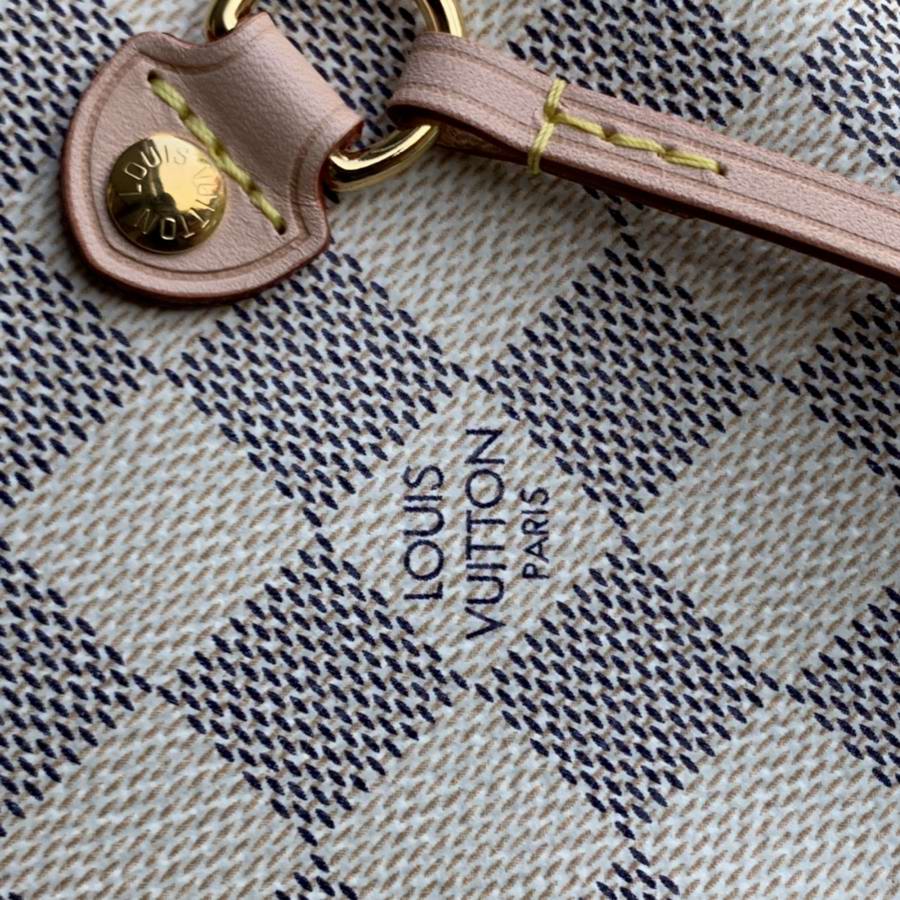 The Neverfull MM tote unites timeless design with heritage details. Made from fresh Damier Azur canvas with natural cowhide trim, it is roomy yet not bulky, with side laces that cinch for a sleek allure or loosen for a casual look. The slim leather handles slip easily over the shoulder or arm. Lined in colourful textile, it features a removable pouch that can be used as a clutch or an extra pocket.