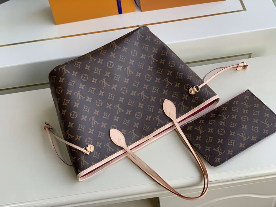 The Neverfull MM tote unites timeless design with heritage details. Made from supple Monogram canvas with natural cowhide trim, it is roomy yet not bulky, with side laces that cinch for a sleek allure or loosen for a casual look. Slim, comfortable handles slip easily over the shoulder or arm. Lined in colourful textile, it features a removable pouch that can be used as a clutch or an extra pocket.