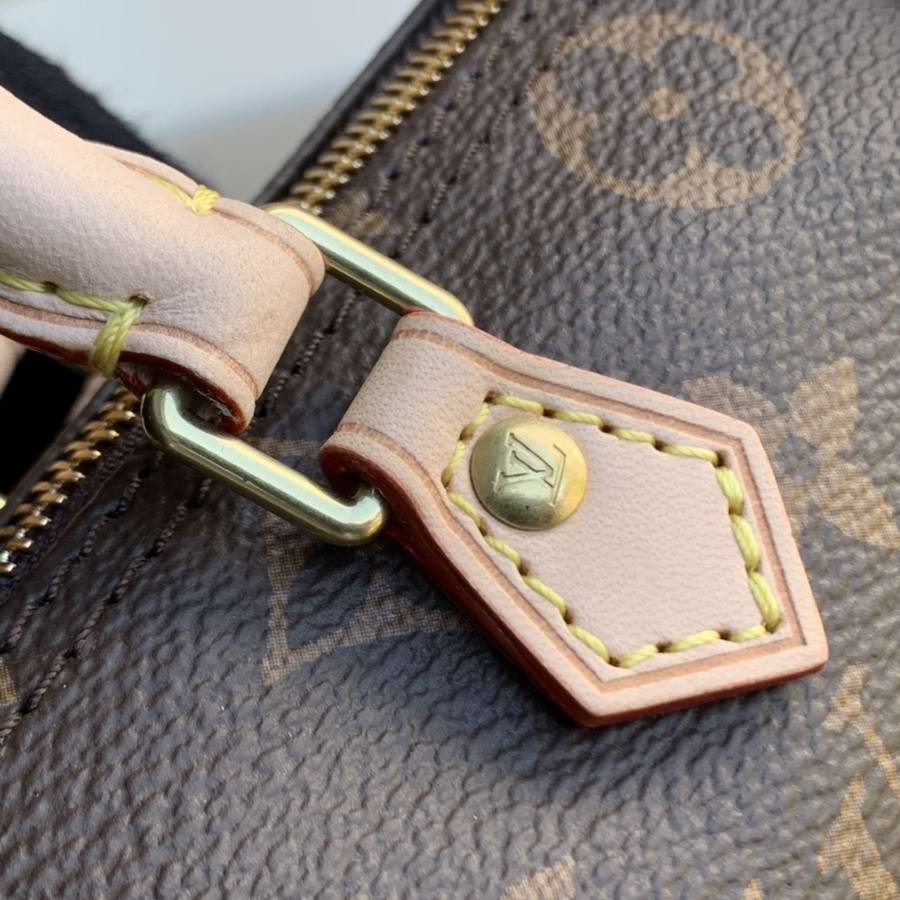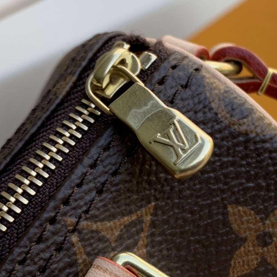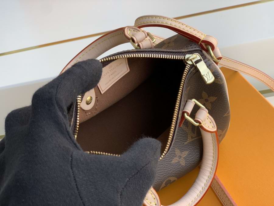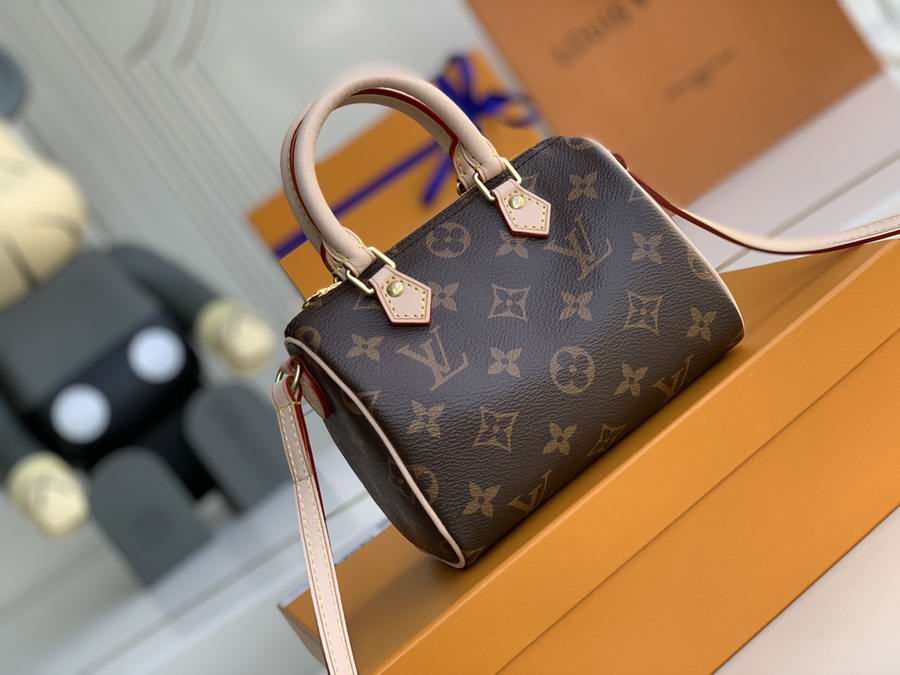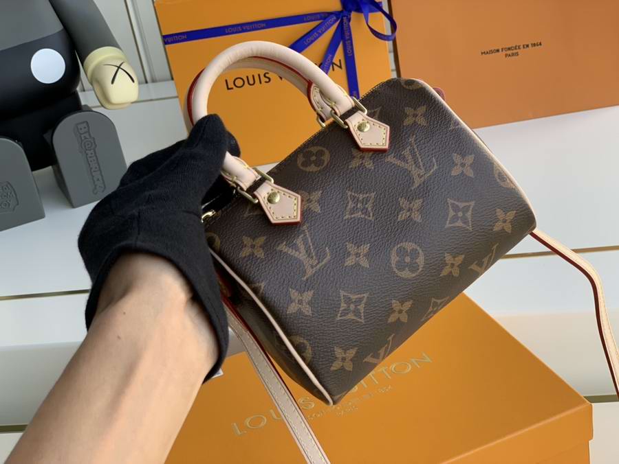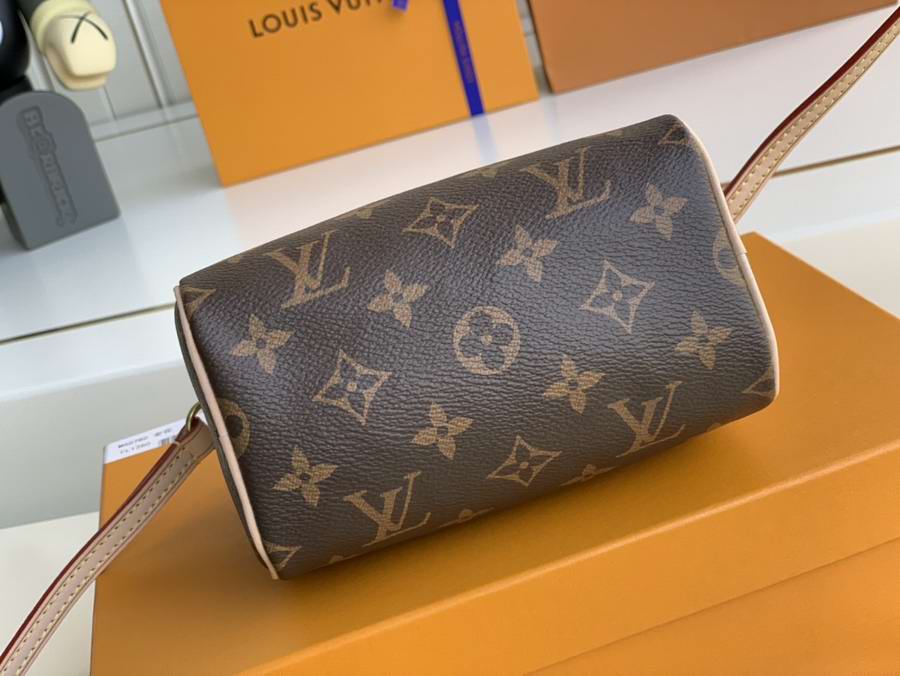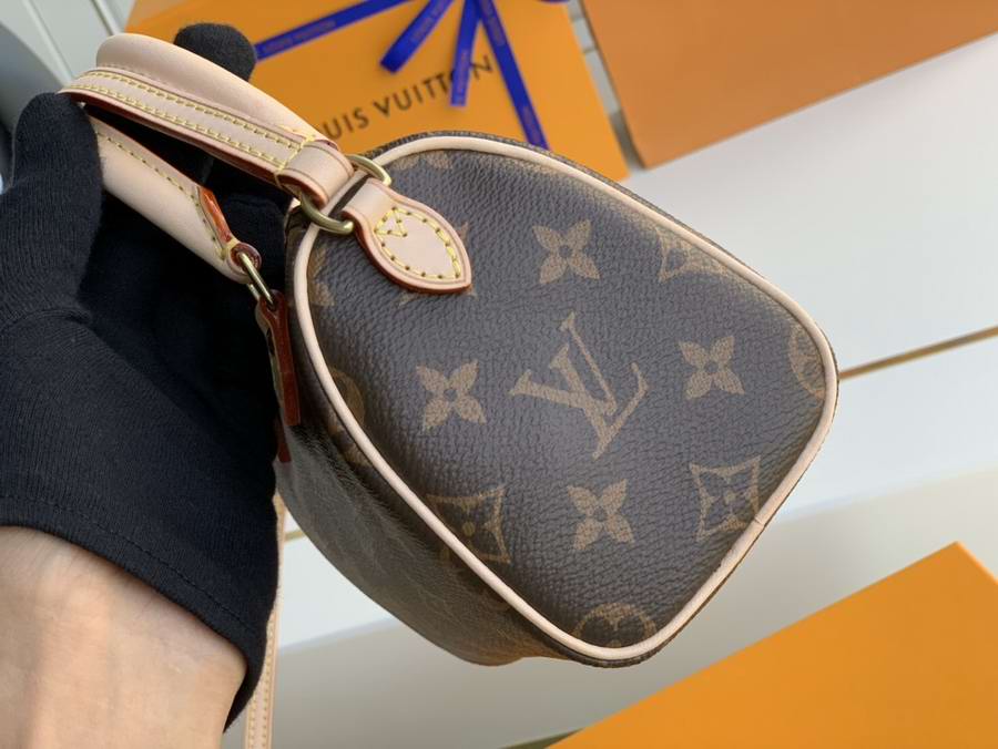 The Nano Speedy is a perfect miniature version of Louis Vuitton's iconic Speedy bag. Crafted from Monogram canvas with natural leather trim, it features two handles and a long strap for shoulder or cross-body carry. Extremely lightweight and large enough for a smartphone, cards and keys, it is a stylish way to carry essentials.
