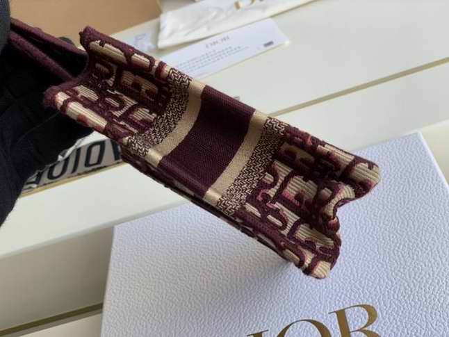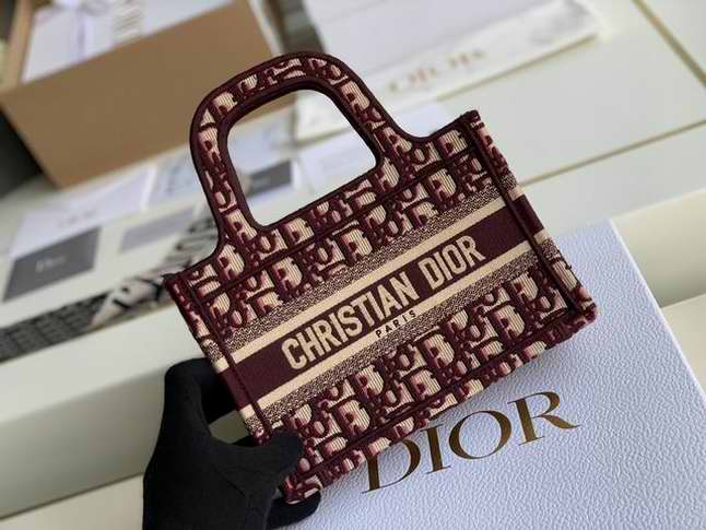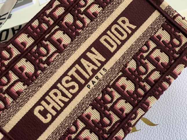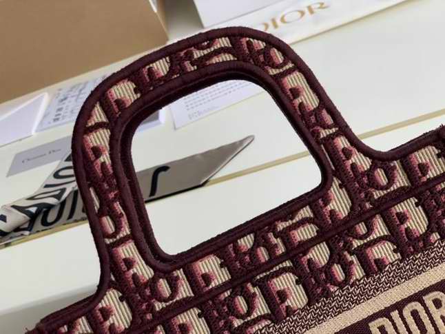 The Dior Book Tote, an original style introduced by Dior??s creative director Maria Grazia Chiuri, has become a staple of the Maison??s aesthetic. The burgundy mini shape is made of fully embroidered canvas and portrays the logo mania original Dior Oblique pattern with the Christian Dior signature on the front. This carryall is a perfect example of the Dior savoir-faire. It may be paired with small leather goods accessories for a complete look.