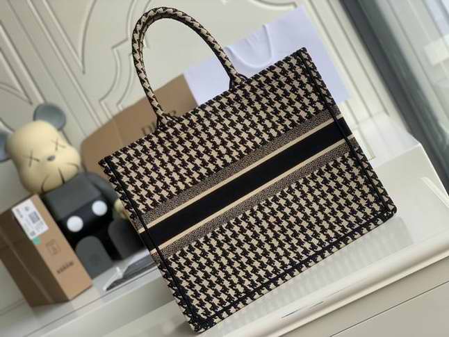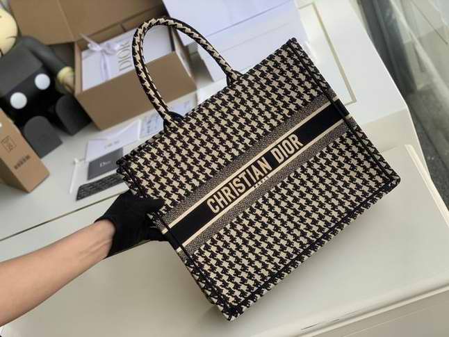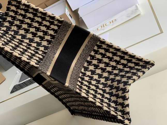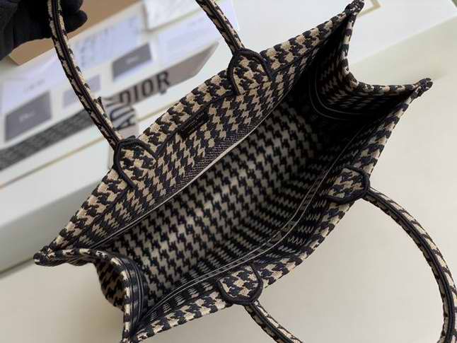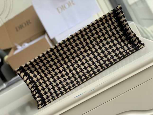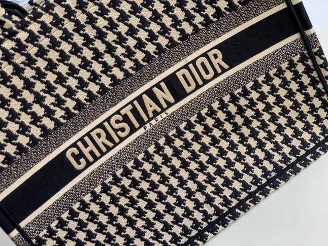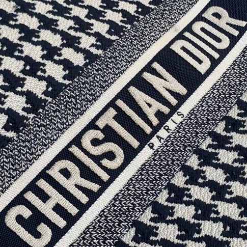 The Dior Book Tote, an original style introduced by Christian Dior's Creative Director, Maria Grazia Chiuri, has become a staple of the Dior aesthetic. Ideally designed to carry all your daily essentials, the large shape features a full houndstooth embroidery, with a cream ?�Christian Dior?? signature on the front. This carryall is a perfect example of the Dior savoir-faire and it may be worn with other small accessories or the Mitzah scarf for a complete look.
