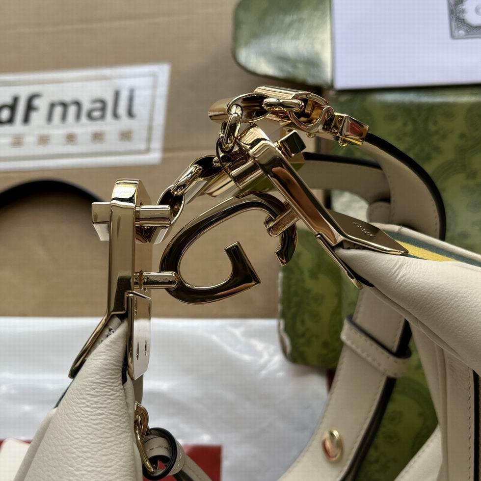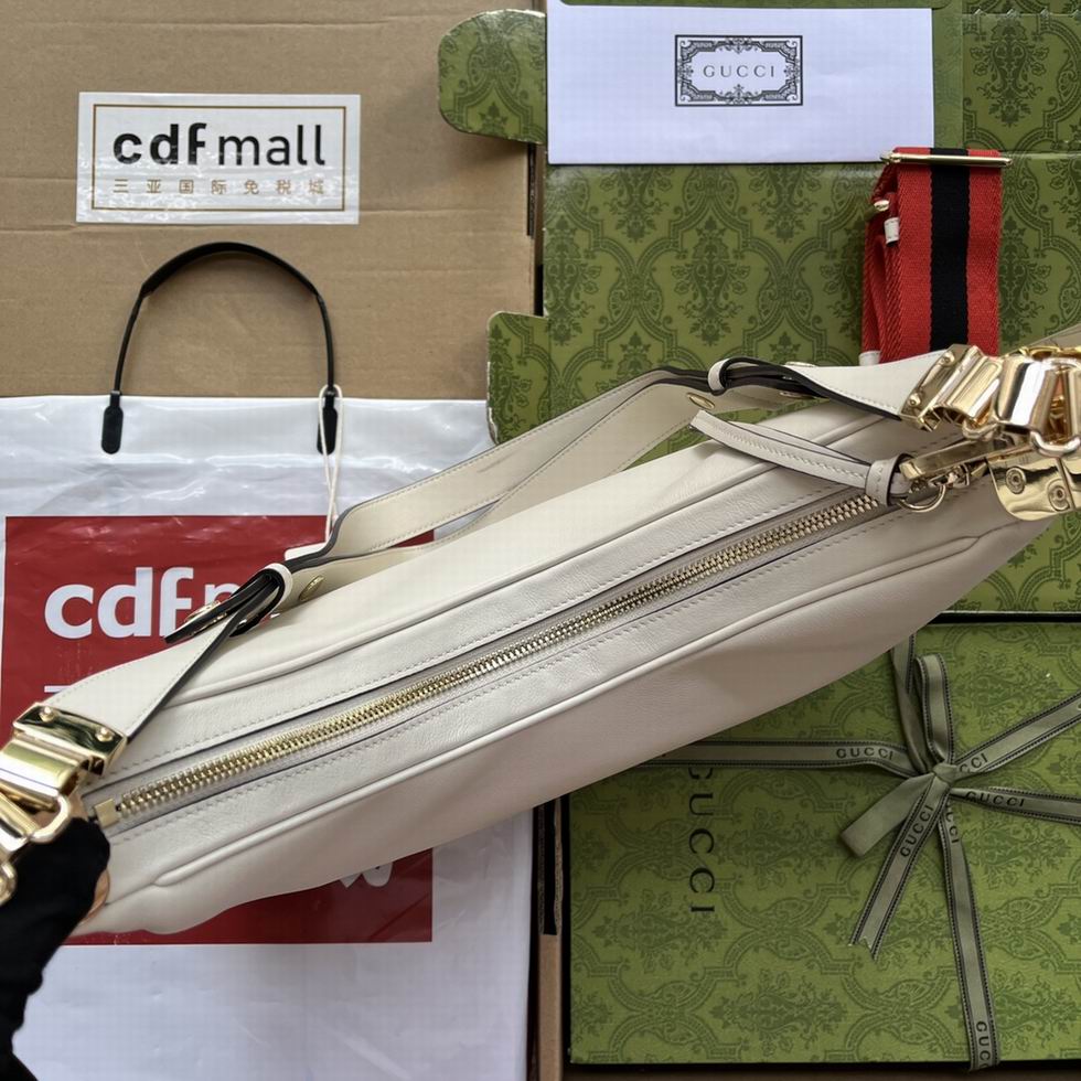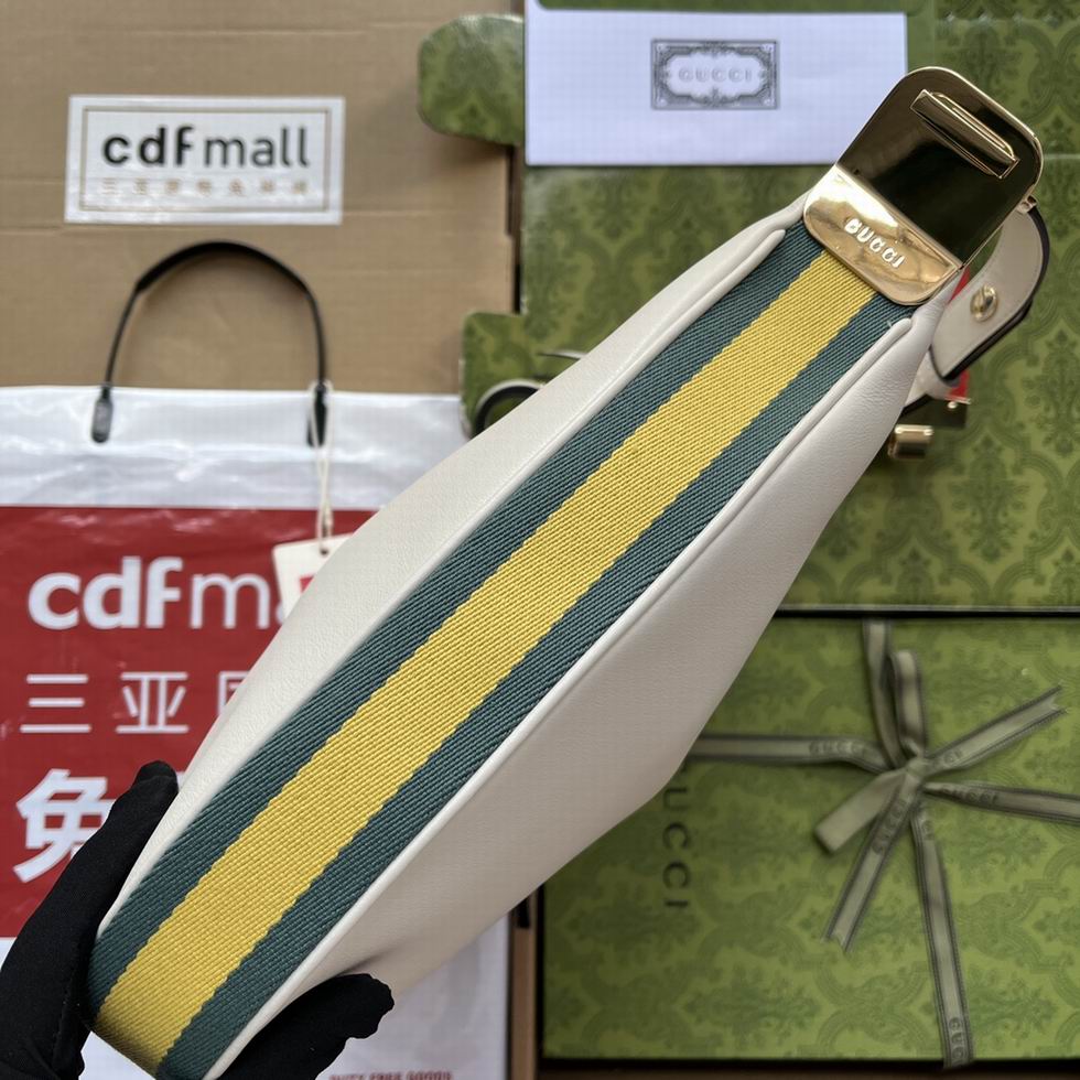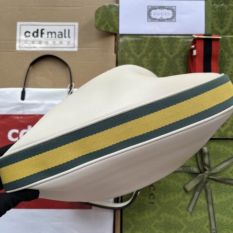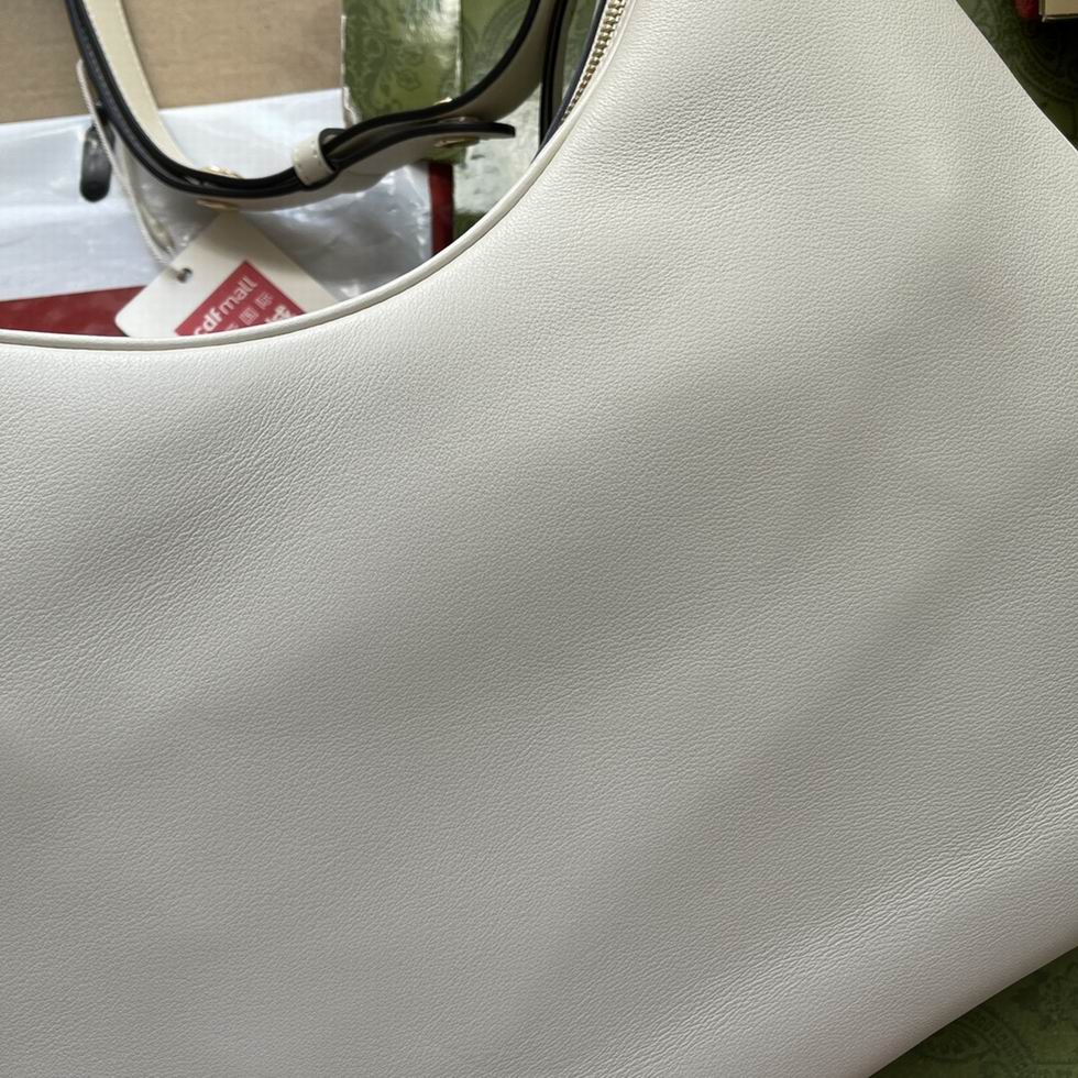 An ode to the timeless Hollywood glamour that shaped Gucci Love Parade, classic elements from the House's archives are reintroduced. Distinguished by its crescent moon shape, the accessory is further defined by a G shaped hook closure. Paired with soft materials, the heritage hardware creates a refined design with vintage appeal. This large version is crafted in white leather with orange and black Web trim.