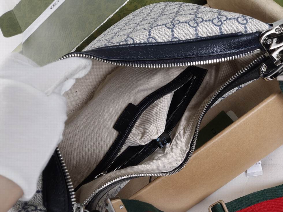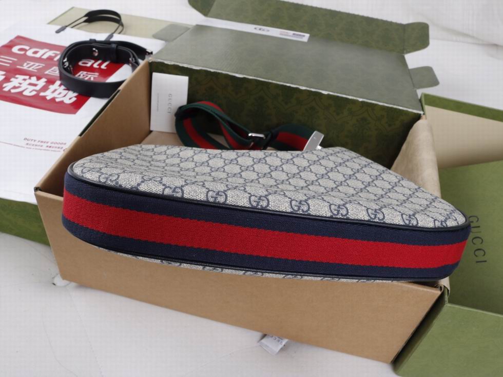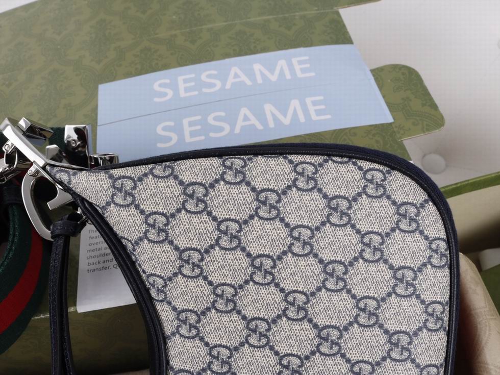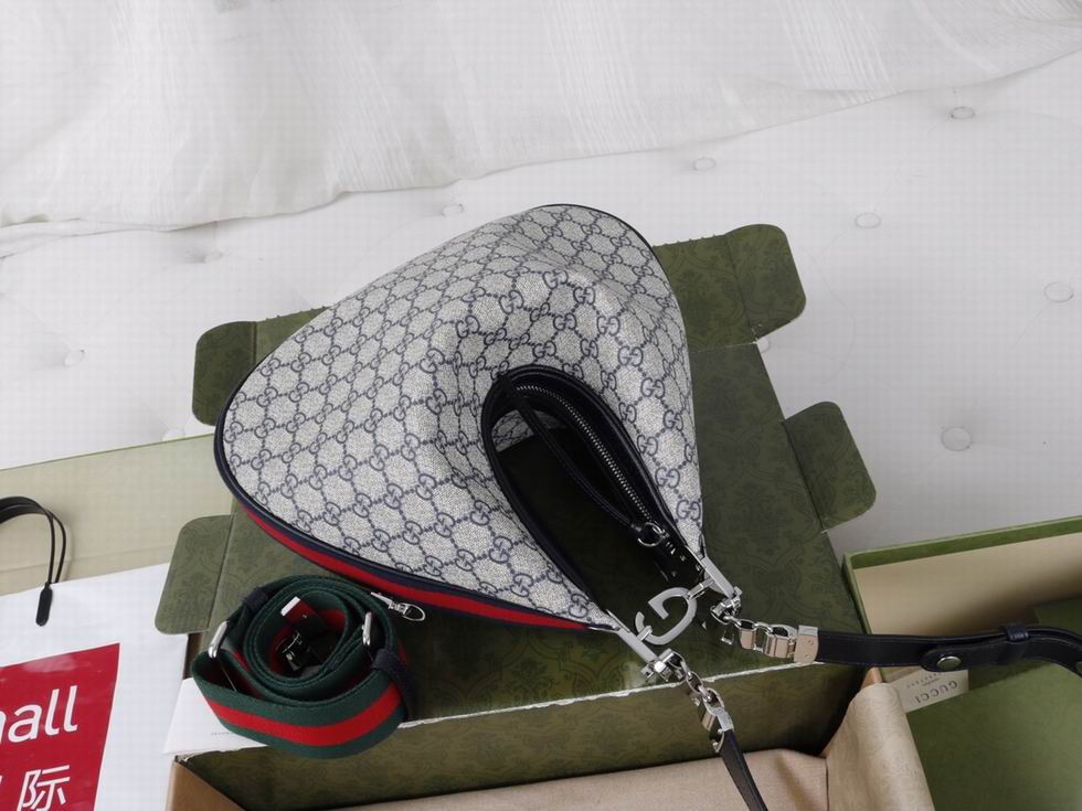 An ode to the timeless Hollywood glamour that shaped Gucci Love Parade, classic elements from the House's archives are reintroduced. Distinguished by its crescent moon shape, the accessory is further defined by a G shaped hook closure. Paired with soft materials, the heritage hardware creates a refined design with vintage appeal. This large version is crafted from beige and blue GG Supreme canvas, complete with a blue and red Web trim.