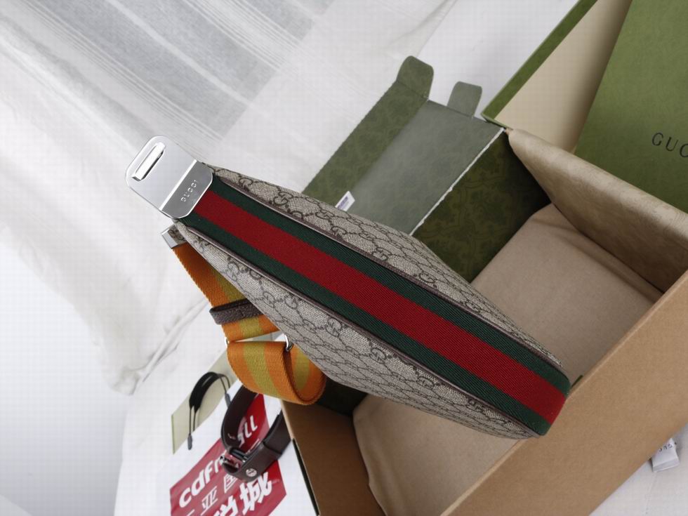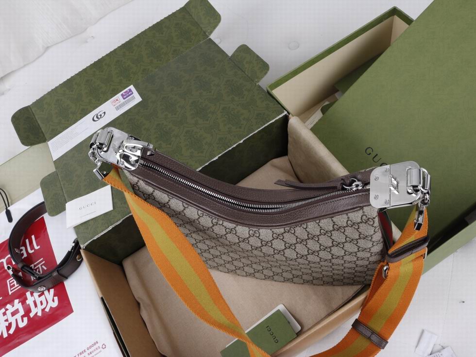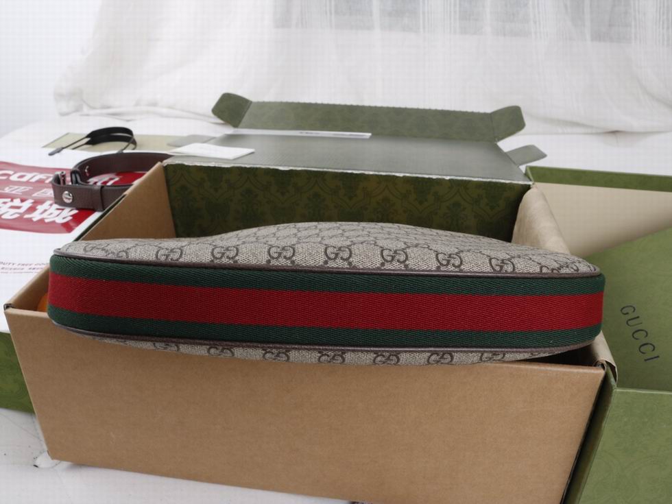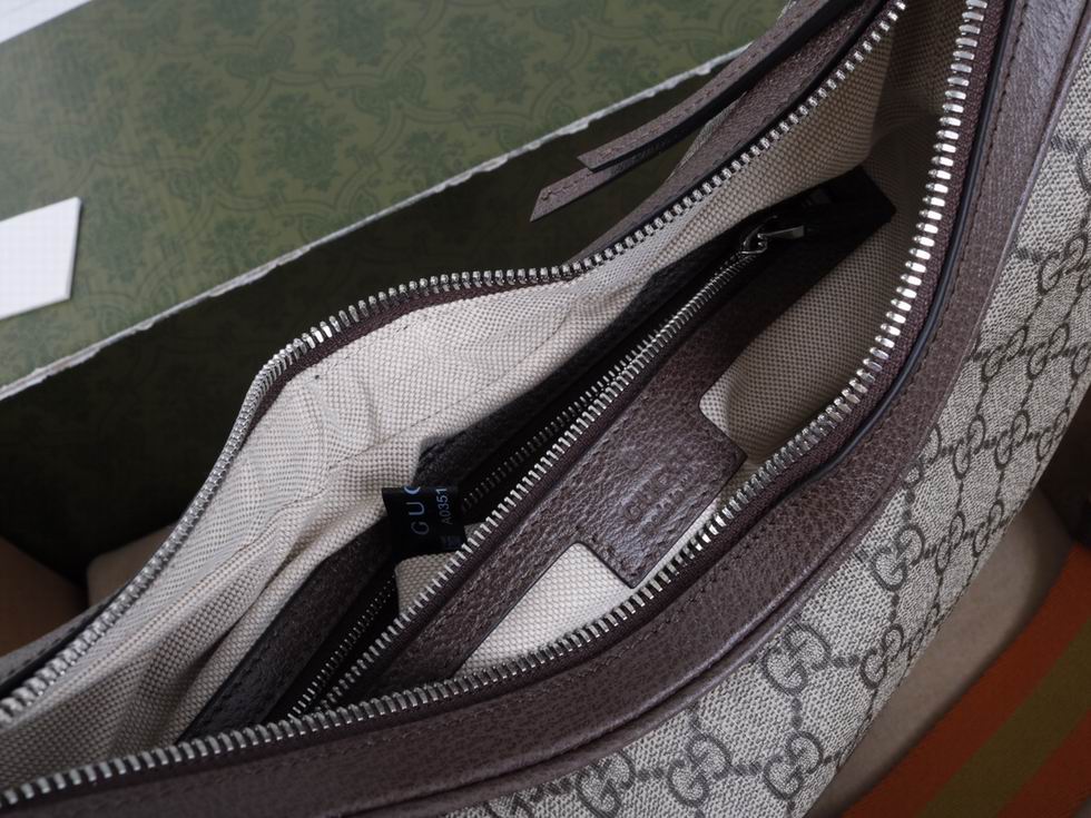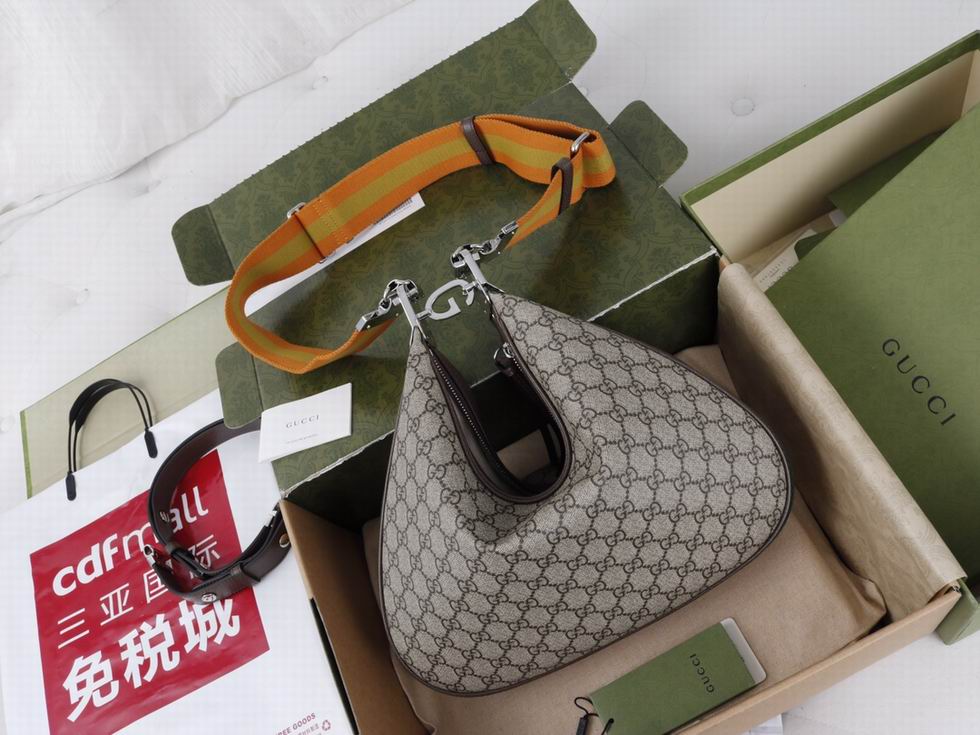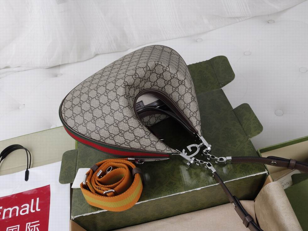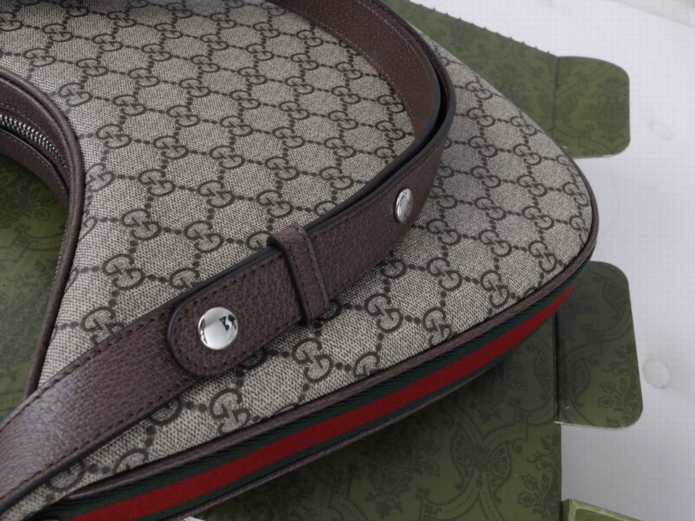An ode to the timeless Hollywood glamour that shaped Gucci Love Parade, classic elements from the House's archives are reintroduced. Distinguished by its crescent moon shape, the accessory is further defined by a G shaped hook closure. Paired with soft materials, the heritage hardware creates a refined design with vintage appeal. This large version is crafted from beige and ebony GG Supreme canvas, complete with a green and red Web trim.