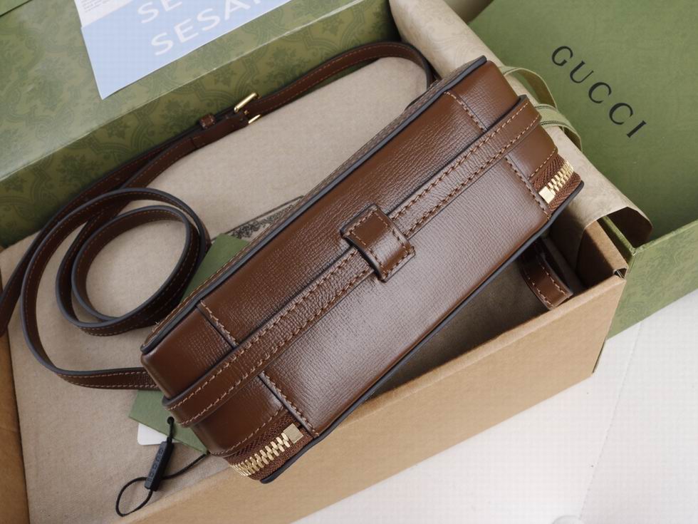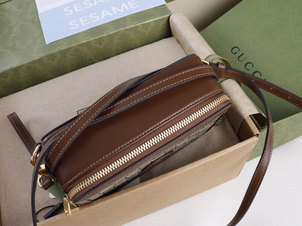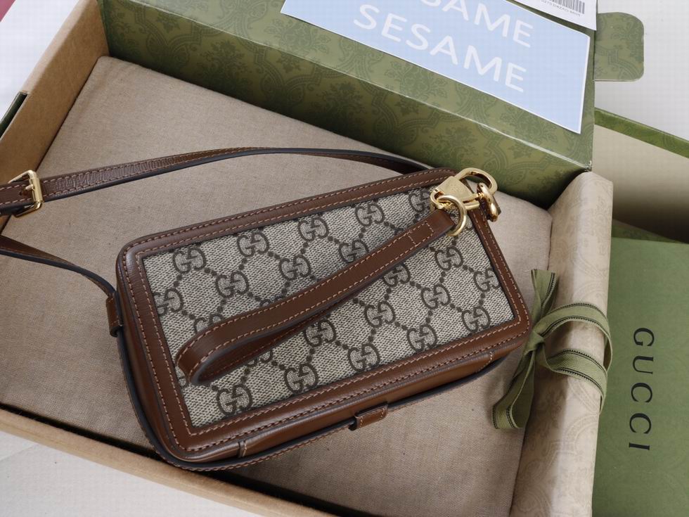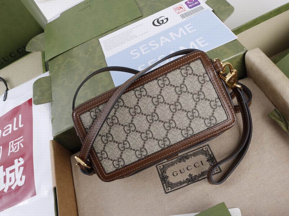 Archival fabrics and details combine to give a selection of accessories a vintage appeal throughout the Gucci Aria universe. Here, this mini bag is presented in GG Supreme canvas and enriched by a tonal leather trim and Interlocking G tag.