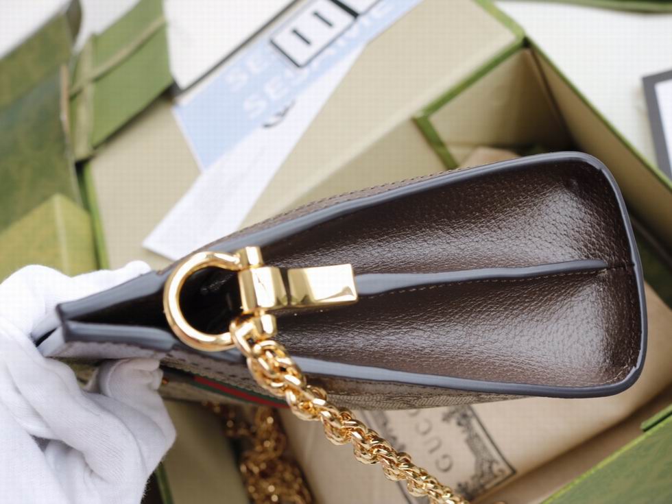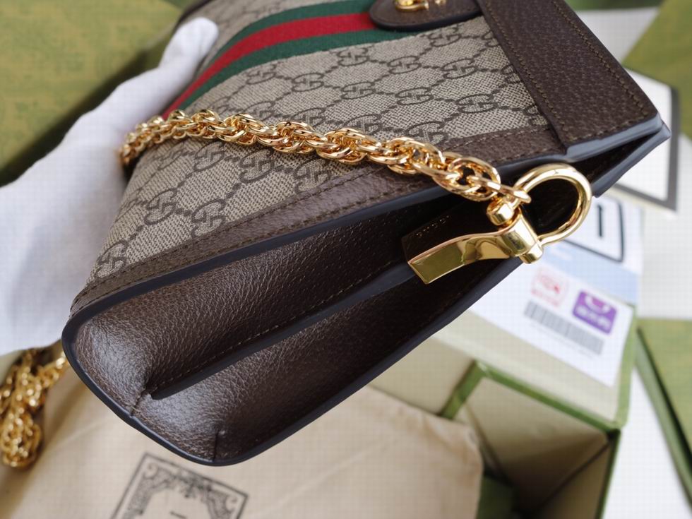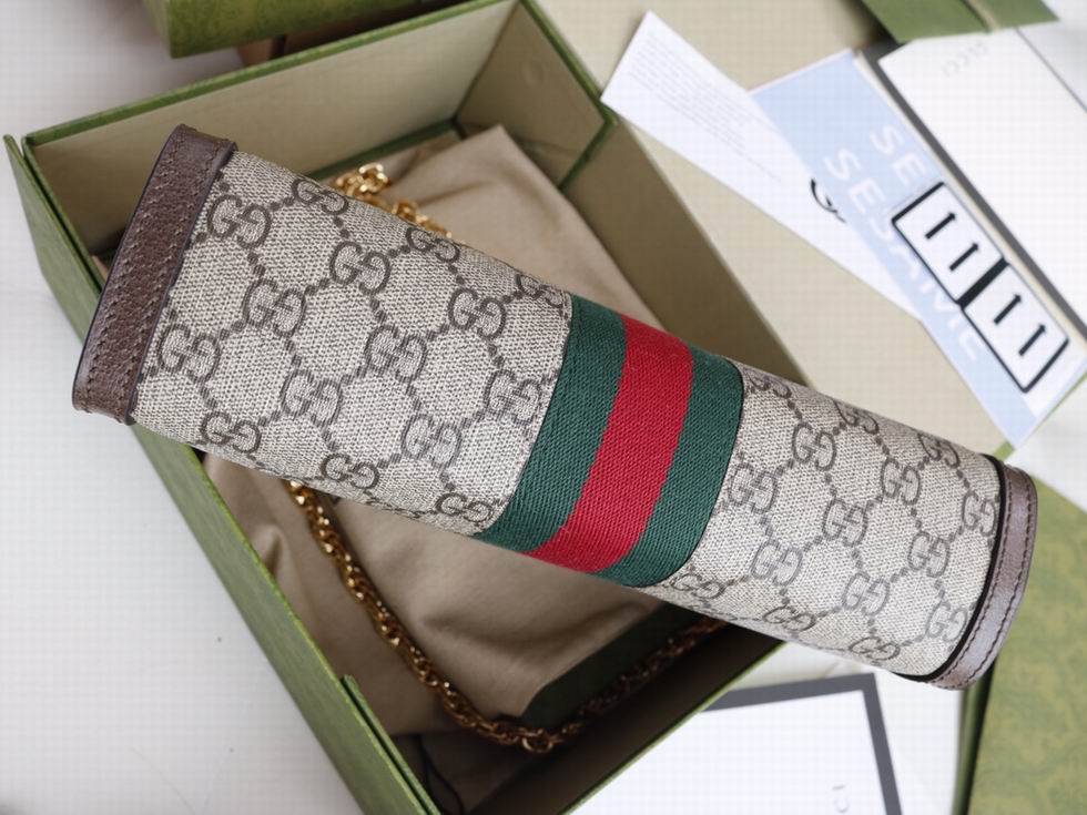 Crafted in GG Supreme canvas with inlaid Web stripe detail, the chain strap shoulder bag boasts a vintage inspired design. The structured shape secures with a magnetic closure, trimmed with leather and Double G hardware??an archival detail.