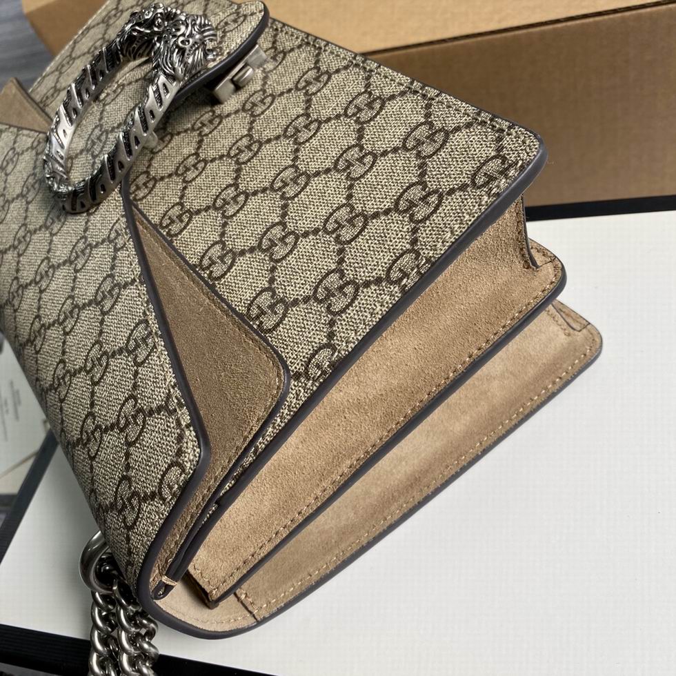 A structured GG Supreme canvas bag with our textured tiger head closure-a unique detail referencing the Greek god Dionysus, who in myth is said to have crossed the river Tigris on a tiger sent to him by Zeus. The sliding chain strap can be worn multiple ways, changing between a shoulder and a top handle bag.