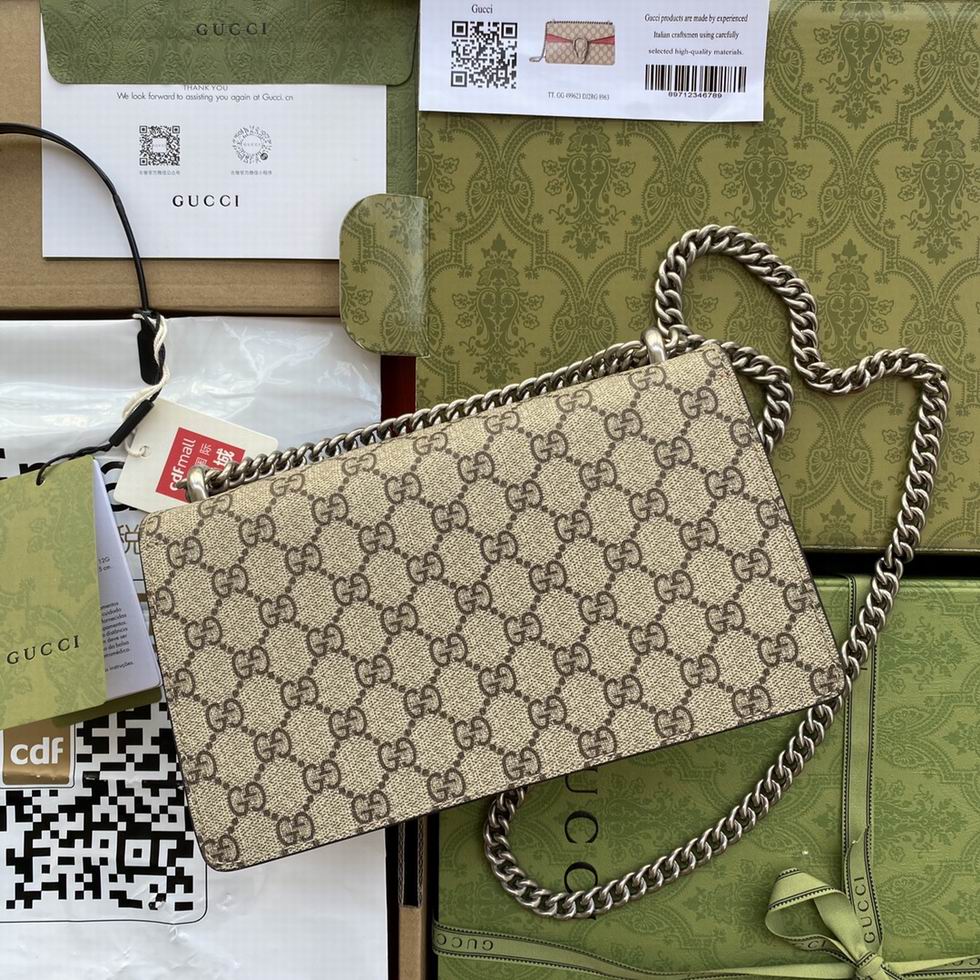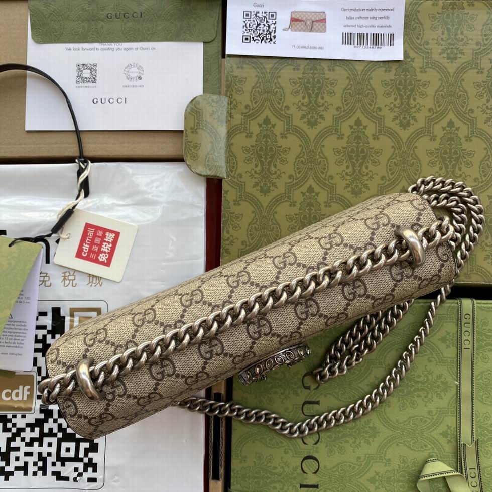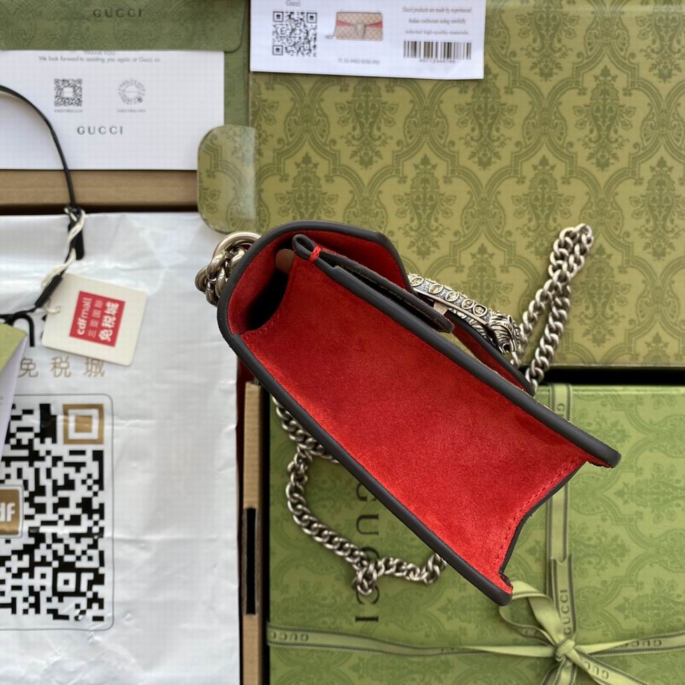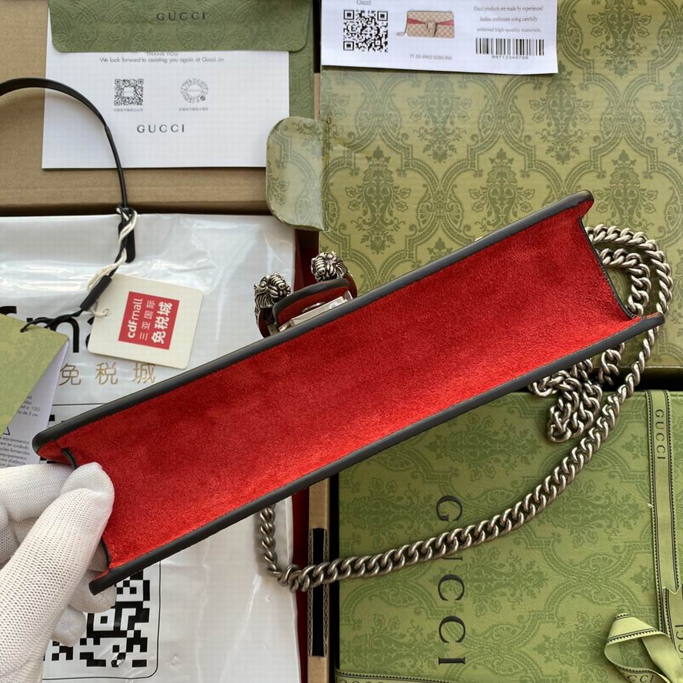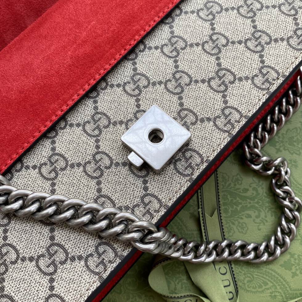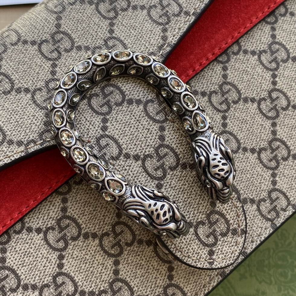 The small Dionysus shoulder bag is presented in the signature GG pattern, trimmed with red suede details. The shape is defined by the defining tiger head closure??a unique detail referencing the Greek god Dionysus, who in myth is said to have crossed the river Tigris on a tiger sent to him by Zeus??further enhanced with sparkling crystals. The sliding chain strap can be worn multiple ways, changing between a shoulder and a top handle bag.