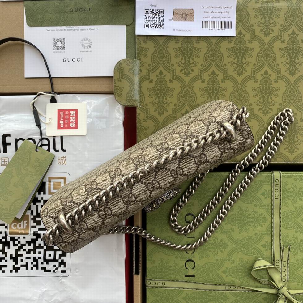 The small Dionysus shoulder bag is presented in the signature GG pattern, trimmed with taupe suede details. The shape is defined by the defining tiger head closure??a unique detail referencing the Greek god Dionysus, who in myth is said to have crossed the river Tigris on a tiger sent to him by Zeus??further enhanced with sparkling crystals. The sliding chain strap can be worn multiple ways, changing between a shoulder, cross-body and a top handle bag.
