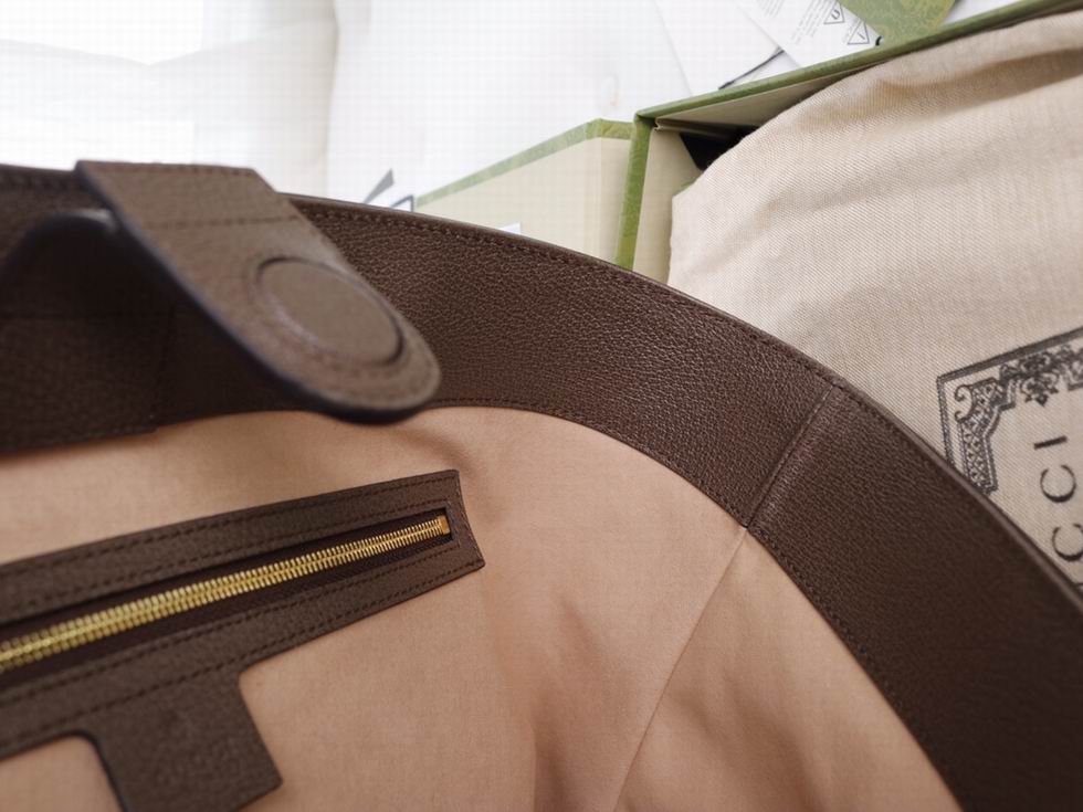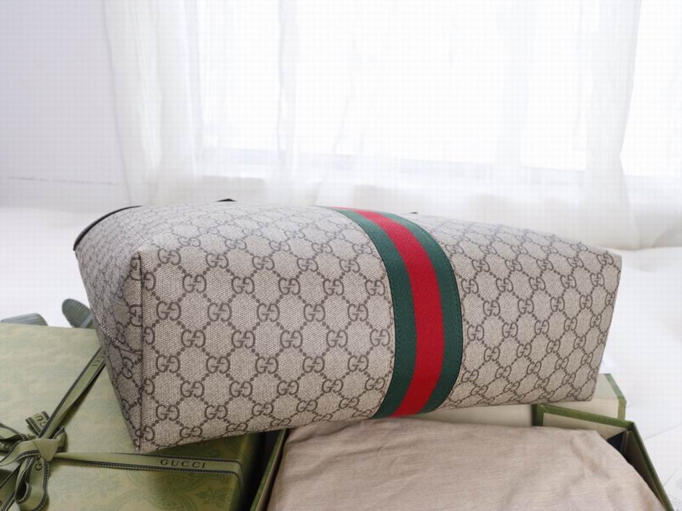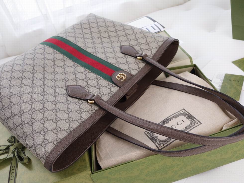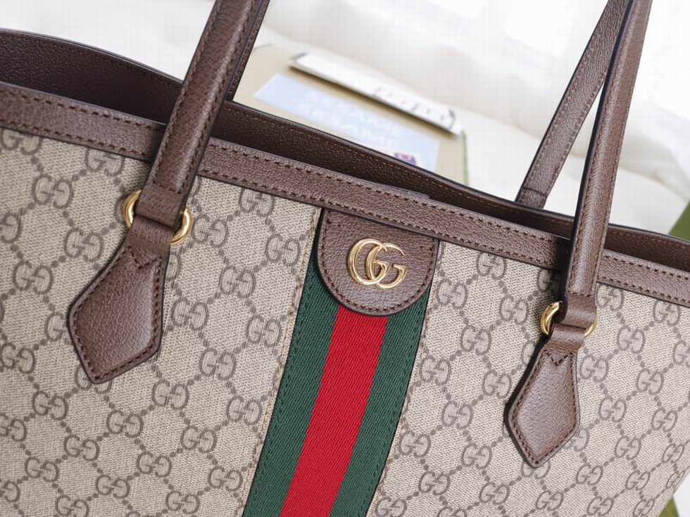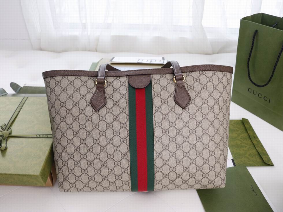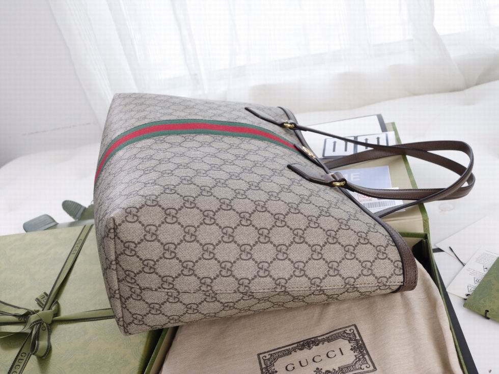 A classic combination of the House's most defining codes??the GG motif and Web stripe??the world of Ophidia continues to evolve, incorporating new shapes and silhouettes each season. With recognizable design elements in a practical new shape, this new medium sized tote is trimmed with textured leather and topped with Double G hardware. Thanks to its long leather handles, the style can also be carried as a shoulder bag.