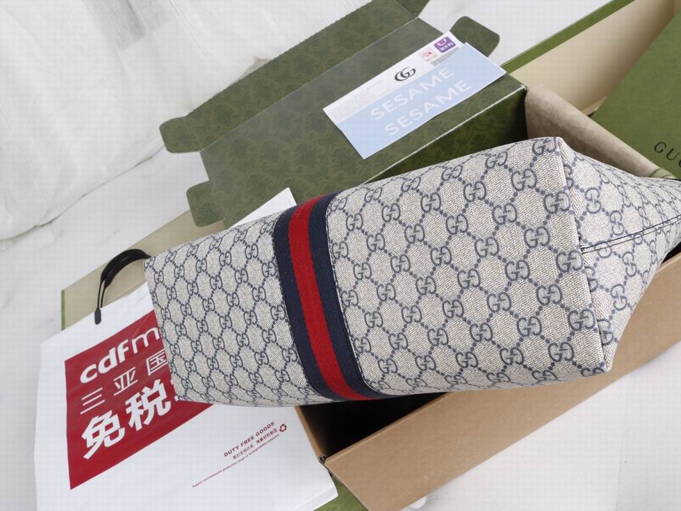 Mirroring the material's historic origins, GG Supreme is introduced in a timeless mix of blue and beige for Gucci Love Parade. The canvas has come to the front of each collection decade after decade to become a hallmark of the House. Here, the classic palette defines this medium-sized Ophidia tote bag, completed by the Web stripe in red and blue.
