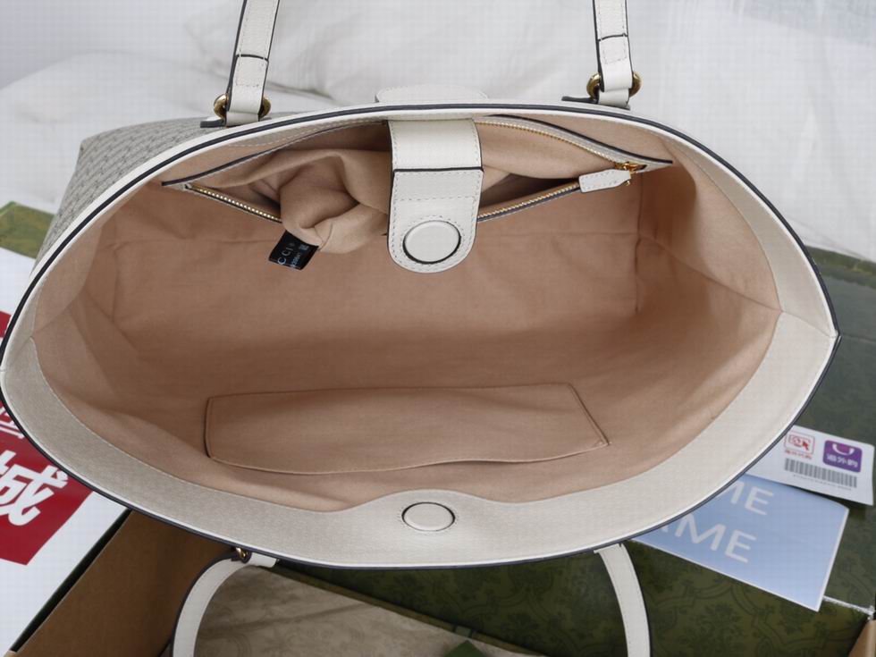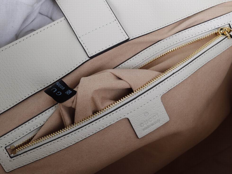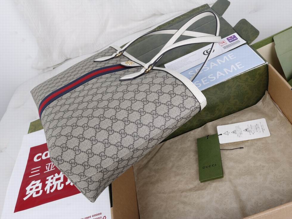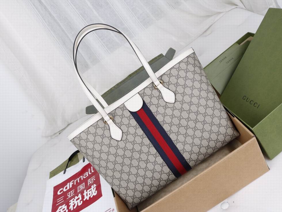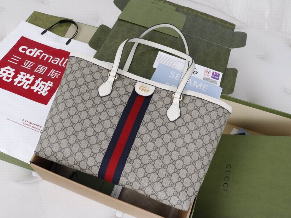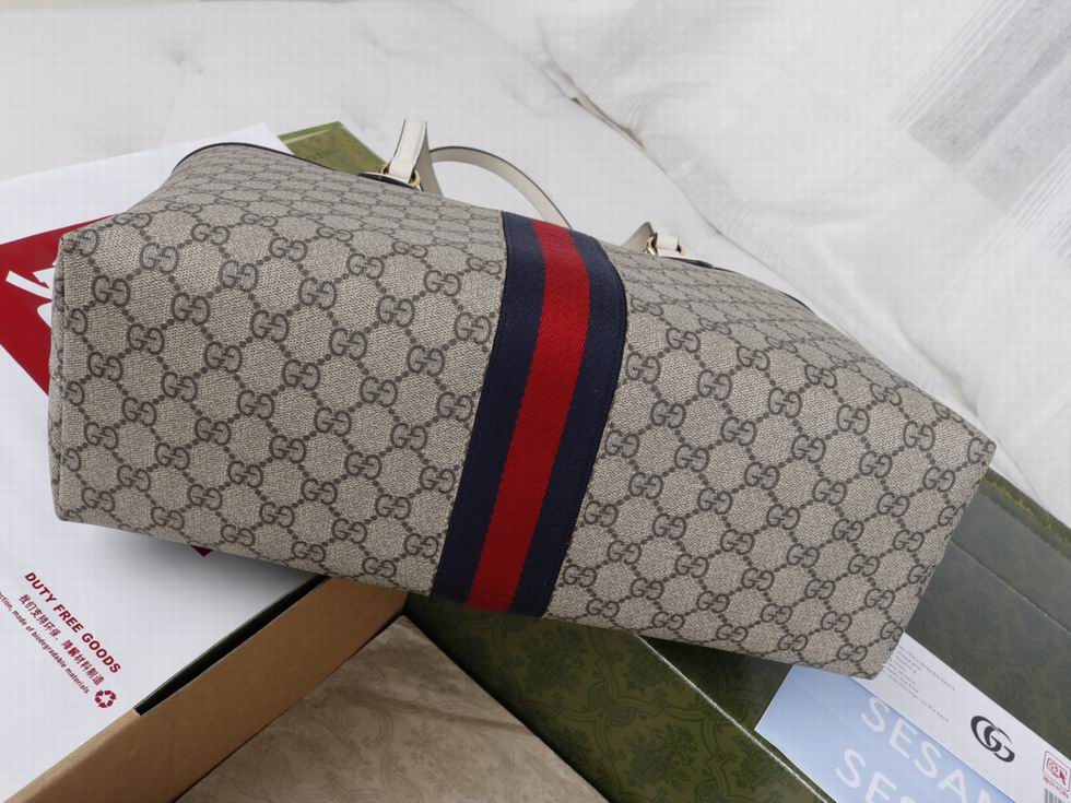 A classic combination of the House's most defining codes??the GG motif and Web stripe??the world of Ophidia continues to evolve, incorporating new shapes and silhouettes each season. With recognizable design elements in a practical new shape, this new medium sized tote is trimmed with textured leather and topped with Double G hardware. Thanks to its long leather handles, the style can also be carried as a shoulder bag.